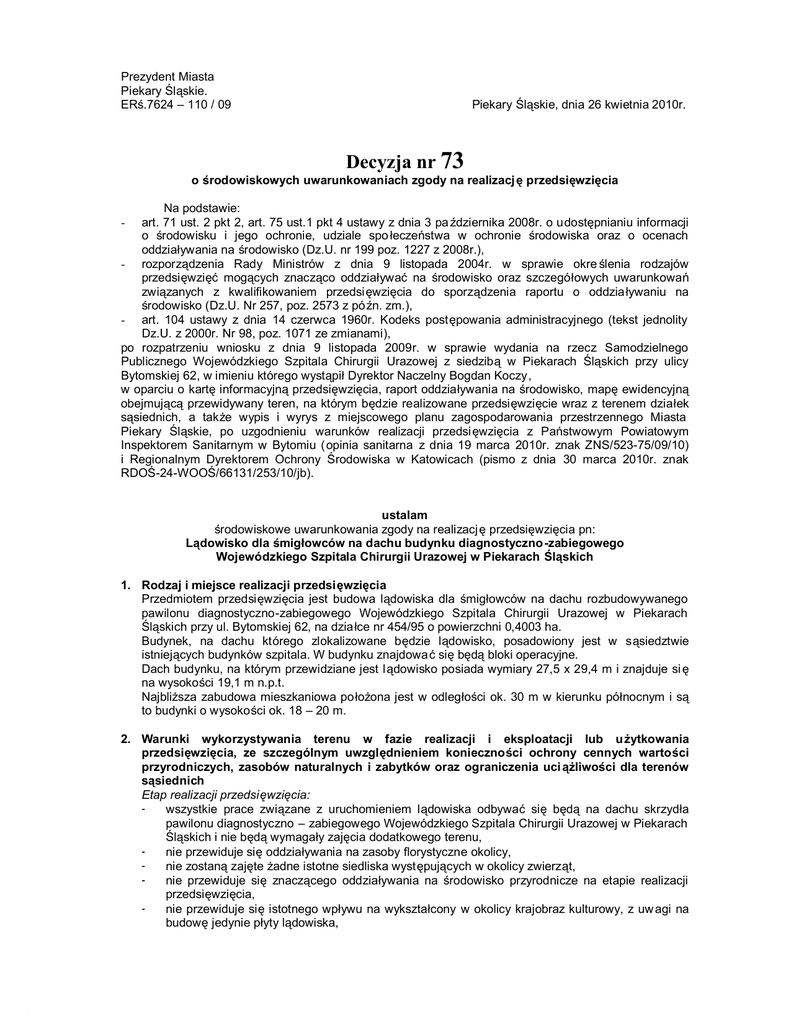 Prezydent Miasta Piekary Śląskie. ERś.7624 – 110 / 09 Piekary Śląskie, dnia 26 kwietnia 2010r. Decyzja nr 73 o środowiskowych uwarunkowaniach zgody na realizacj ę przedsięwzięcia Na podstawie: art. 71 ust. 2 pkt 2, art. 75 ust.1 pkt 4 ustawy z dnia 3 pa ździernika 2008r. o udostępnianiu informacji o środowisku i jego ochronie, udziale spo łeczeństwa w ochronie środowiska oraz o ocenach oddziaływania na środowisko (Dz.U. nr 199 poz. 1227 z 2008r.), - rozporządzenia Rady Ministrów z dnia 9 listopada 2004r. w sprawie okre ślenia rodzajów przedsięwzięć mogących znacząco oddziaływać na środowisko oraz szczegółowych uwarunkowań związanych z kwalifikowaniem przedsięwzięcia do sporządzenia raportu o oddziaływaniu na środowisko (Dz.U. Nr 257, poz. 2573 z późn. zm.), - art. 104 ustawy z dnia 14 czerwca 1960r. Kodeks postępowania administracyjnego (tekst jednolity Dz.U. z 2000r. Nr 98, poz. 1071 ze zmianami), po rozpatrzeniu wniosku z dnia 9 listopada 2009r. w sprawie wydania na rzecz Samodzielnego Publicznego Wojewódzkiego Szpitala Chirurgii Urazowej z siedzibą w Piekarach Śląskich przy ulicy Bytomskiej 62, w imieniu którego wystąpił Dyrektor Naczelny Bogdan Koczy, w oparciu o kartę informacyjną przedsięwzięcia, raport oddziaływania na środowisko, mapę ewidencyjną obejmującą przewidywany teren, na którym będzie realizowane przedsięwzięcie wraz z terenem działek sąsiednich, a także wypis i wyrys z miejscowego planu zagospodarowania przestrzennego Miasta Piekary Śląskie, po uzgodnieniu warunków realizacji przedsi ęwzięcia z Państwowym Powiatowym Inspektorem Sanitarnym w Bytomiu ( opinia sanitarna z dnia 19 marca 2010r. znak ZNS/523-75/09/10) i Regionalnym Dyrektorem Ochrony Środowiska w Katowicach (pismo z dnia 30 marca 2010r. znak RDOŚ-24-WOOŚ/66131/253/10/jb). - ustalam środowiskowe uwarunkowania zgody na realizacj ę przedsięwzięcia pn: Lądowisko dla śmigłowców na dachu budynku diagnostyczno -zabiegowego Wojewódzkiego Szpitala Chirurgii Urazowej w Piekarach Śląskich 1. Rodzaj i miejsce realizacji przedsięwzięcia Przedmiotem przedsięwzięcia jest budowa lądowiska dla śmigłowców na dachu rozbudowywanego pawilonu diagnostyczno-zabiegowego Wojewódzkiego Szpitala Chirurgii Urazowej w Piekarach Śląskich przy ul. Bytomskiej 62, na dzia łce nr 454/95 o powierzchni 0,4003 ha. Budynek, na dachu którego zlokalizowane będzie lądowisko, posadowiony jest w sąsiedztwie istniejących budynków szpitala. W budynku znajdowa ć się będą bloki operacyjne. Dach budynku, na którym przewidziane jest l ądowisko posiada wymiary 27,5 x 29,4 m i znajduje si ę na wysokości 19,1 m n.p.t. Najbliższa zabudowa mieszkaniowa położona jest w odległości ok. 30 m w kierunku północnym i są to budynki o wysokości ok. 18 – 20 m. 2. Warunki wykorzystywania terenu w fazie realizacji i eksploatacji lub u żytkowania przedsięwzięcia, ze szczególnym uwzględnieniem konieczności ochrony cennych wartości przyrodniczych, zasobów naturalnych i zabytków oraz ograniczenia uci ążliwości dla terenów sąsiednich Etap realizacji przedsięwzięcia: wszystkie prace związane z uruchomieniem lądowiska odbywać się będą na dachu skrzydła pawilonu diagnostyczno – zabiegowego Wojewódzkiego Szpitala Chirurgii Urazowej w Piekarach Śląskich i nie będą wymagały zajęcia dodatkowego terenu, nie przewiduje się oddziaływania na zasoby florystyczne okolicy, nie zostaną zajęte żadne istotne siedliska występujących w okolicy zwierząt, nie przewiduje się znaczącego oddziaływania na środowisko przyrodnicze na etapie realizacji przedsięwzięcia, nie przewiduje się istotnego wpływu na wykształcony w okolicy krajobraz kulturowy, z uw agi na budowę jedynie płyty lądowiska, - poza terenem inwestora poziomy substancji w powietrzu powinny zosta ć utrzymane poniżej poziomów dopuszczalnych lub co najmniej na tych poziomach (art. 85 pkt 1 ustawy Prawo ochrony środowiska i przepisy rozporządzenia Ministra Środowiska z dnia 6 czerwca 2002r. w sprawie dopuszczalnych poziomów niektórych substancji w powietrzu, alarmowych poziomów niektórych substancji w powietrzu oraz marginesów tolerancji dla poszczególnych poziomów niektórych substancji Dz.U. nr 87, poz. 796). Etap eksploatacji przedsi ęwzięcia przedsięwzięcie mieścić się będzie w granicach terenu, do którego Inwestor posiada tytuł prawny czyli dach skrzydła pawilonu diagnostyczno – zabiegowego Wojewódzkiego Szpitala Chirurgii Urazowej w Piekarach Śląskich eksploatacja lądowiska nie spowoduje przekroczeń standardów jakości powietrza i wartości odniesienia substancji w powietrzu w sąsiedztwie budynku, emisja hałasu nie spowoduje przekroczenia warto ści dopuszczalnych na terenie najbli ższej zabudowy mieszkaniowej. inwestycja nie będzie miała wpływu na środowisko gruntowo – wodne, eksploatacja lądowiska nie powinna wywierać znaczącego wpływu na środowisko przyrodnicze najbliższej okolicy. 3. Wymagania dotyczące ochrony środowiska konieczne do uwzględnienia w projekcie budowlanym wyposażenie lądowiska w system zbierania wody deszczowej i odprowadzanie jej do systemu odwodnienia dachu szpitala, a następnie do miejskiej sieci kanalizacji deszczowej, 4. Wymogi w zakresie przeciwdziałania skutkom awarii przemysłowych, w odniesieniu do przedsięwzięć zaliczanych do zakładów stwarzających zagrożenie wystąpienia poważnych awarii: wdrożenie odpowiednich procedur post ępowania na wypadek awarii śmigłowca podczas startu lub lądowania na lądowisku, kontrola stanu technicznego urządzeń lądowiska (radiokomunikacyjne, radiolokacyjne, radionawigacyjne, oświetlenie lądowiska, stacja meteo). 5. Wymogi w zakresie ograniczenia transgranicznego oddziaływania na środowisko w odniesieniu do tych przedsięwzięć, dla których przeprowadzono postępowanie w sprawie transgranicznego oddziaływania na środowisko: z uwa