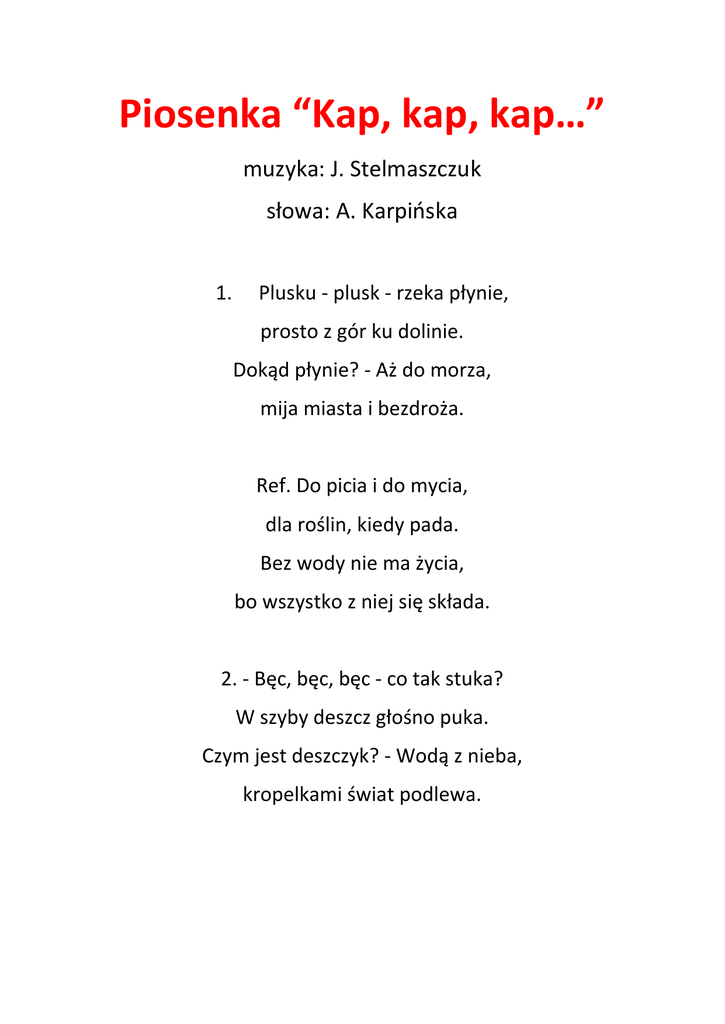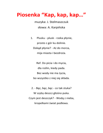 Piosenka “Kap, kap, kap…” muzyka: J. Stelmaszczuk słowa: A. Karpińska 1. Plusku - plusk - rzeka płynie, prosto z gór ku dolinie. Dokąd płynie? - Aż do morza, mija miasta i bezdroża. Ref. Do picia i do mycia, dla roślin, kiedy pada. Bez wody nie ma życia, bo wszystko z niej się składa. 2. - Bęc, bęc, bęc - co tak stuka? W szyby deszcz głośno puka. Czym jest deszczyk? - Wodą z nieba, kropelkami świat podlewa. Ref. Do picia i do mycia… 3. Kap, kap, kap - co tak kapie? Chlap, chlap, chlap - kto tak chlapie? Bul, bul, bul, bul - skąd te dźwięki? O, już słyszę - to z łazienki! Ref. Do picia i do mycia... Piosenka - Krakowiak „Płynie Wisła, płynie” – Słowa: Edmund Wasilewski Płynie Wisła, płynie Po polskiej krainie, (bis) Zobaczyła Kraków, pewnie go nie minie. (bis) Zobaczyła Kraków, Wnet go pokochała, (bis) A w dowód miłości wstęgą opasała. (bis) Chociaż się schowała W Niepołomskie lasy, (bis) I do morza wpada, płynie jak przed czasy. (bis) Nad moją kolebą Matka się schylała, (bis) I po polsku pacierz mówić nauczała. (bis) PRZEBIERANKOWA ŚPIEWANKA Tekst: Edyta Wolica Już za chwilę bal się zacznie, Pędzi z miotłą czarownica, Biegnie kowboj z policjantem, Kim ja jestem? – tajemnica! Ref.: Bal, bal, bal, wspaniały bal, Karnawał już puka do drzwi, Bal, bal, bal , przebierańców bal, Każdy co noc o nim śni... Może jestem klaunem małym, Najśmieszniejszym w całym świecie, Może jestem królem śmiałym? – Tego nigdy nie zgadniecie... Ref.: Bal, bal, bal, wspaniały bal, Karnawał już puka do drzwi, Bal, bal, bal , przebierańców bal, Każdy co noc o nim śni... Może jestem jaskiniowcem, Albo może kominiarzem, Gdy się tylko zdecyduję, Zaraz wszystkim się pokażę... Ref.: Bal, bal, bal, wspaniały bal, Karnawał już puka do drzwi, Bal, bal, bal , przebierańców bal, Każdy co noc o nim śni... „Zuzia lalka nie duża” Zuzia lalka nieduża I na dodatek cała ze szmatek W kratkę stara spódniczka Łzy na policzkach A w główce marzeń sto Refren: Lecz kocham ją najbardziej ze wszystkich moich lal Choć nie ma sukni złotej Zabiorę ją na bal Zuzia lalka nieduża płaszczyk za krótki Zbyt duże butki Fartuch biały z kieszonką w kieszonce słonko A w główce marzeń sto Refren: Lecz kocham ją najbardziej ze wszystkich moich lal Choć nie ma sukni złotej Zabiorę ją na bal. Zuzia lalka niewielka Bródka malutka Nos jak muszelka Oczy ma jak pięć złotych wełniane loki a w główce marzeń sto.