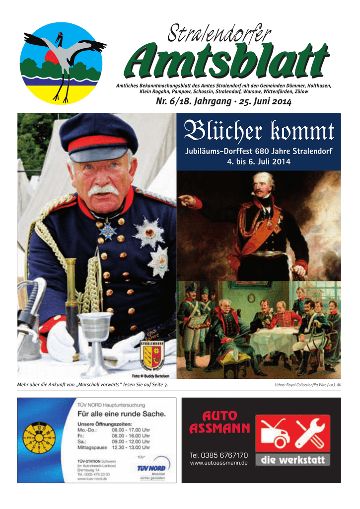 Stralendorfer Amtsblatt , Amtliches Bekanntmachungsblatt des Amtes Stralendorf mit den Gemeinden Dümmer, Holthusen, Klein Rogahn, Pampow, Schossin, Stralendorf, Warsow, Wittenförden, Zülow Nr. 6/18. Jahrgang · 25. Juni 2014 Blücher kommt Jubiläums-Dorffest 680 Jahre Stralendorf 4. bis 6. Juli 2014 Mehr über die Ankunft von „Marschall vorwärts" lesen Sie auf Seite 3. Lithos: Royal Collection/Pa Wire (v.o.), AK AUTO ASSMANN Tel. 0385 6767170 www.autoassmann.de Aus den Gemeinden ...IM BLICKPUNKT 4-5 WETTEN, DASS ...? Die große Dorfwette steht Amtliche Bekanntmachungen & Bürgerinformationen 6 Faszination Airbus Stralendorf. Der Sportverein Stralendorf fordert das gesamte Dorf und seinen Bürgermeister Helmut Richter heraus! Am Jubiläumsfestwochenende zum 680. Dorfgeburtstag findet hier in unserem wunderschönen Stralendorf und in seinem Landschaftspark nicht nur das diesjährige Blücher-Fest statt, sondern es wird auch eine spannende sportliche Premiere geben: Die 1. Fußballmannschaft des SV Stralendorf fordert das Dorf und unseren Bürgermeister zu einer Wette heraus. Unsere Mannschaft wettet, dass es die Stralendorfer nicht schaffen werden, in der Zeit von 12 bis 15 Uhr die im Landschaftspark aufgestellte Torwand 68 Mal erfolgreich zu treffen. in den Stralendorfern stecken, dass sie in den drei Stunden zwischen 12 und 15 Uhr die geforderten 68 Treffer erzielen, dann kann sich unsere Kita „Regenbogen“ freuen. Denn im Falle ihrer Niederlage werden die Männer des SVS die Außenanlage des Kindergartens gärtnerisch bunt gestalten und somit ihrerseits einen Beitrag zum Jubiläums-Dorf-, Kultur- und Sportfest leisten. Fairness ist am 5. Juli oberstes Gebot Und damit bei dieser Wette alles mit fairen Dingen zugeht, wird Vereinspräsident Jürgen Schacht als Juror das Geschehen überwachen und keinen Treffer verpassen. Ganz unabhängig Ein Fass Bier für die Mannschaft? von der Dorfwette hat jeder die Möglichkeit, sein Oder schöner unsere Kita? Glück zu versuchen und tolle Preise zu gewinnen. Wenn der SVS Recht behält, dann wird Bürger- Wir freuen uns auf Euch. Top! Die Wette gilt! meister Helmut Richter zum ersten Heimspiel der Text / Foto: Stefan Sperlich neuen Saison für die Fans des SV Stralendorf ein Fass Bier ausgeben. Sollte jedoch so viel Fußball Kindertag im Dörphus macht 9 Udie13Saison perfekt 14 Wald und Wiesenfest Redaktionsschluss: 14.7.2014 Anzeigenschluss: 21.7.2014 Nächste Ausgabe: 30.7.2014 2 Groß Rogahn. „Ein Tag für die Kinder“ – unter Detlef Hagen und an die Sponsoren Ralf Poschdiesem Motto lud Frank Kraft die Kinder des Dor- mann und Detlef Dreffien. Text / Foto: Reimann fes am Internationalen Kindertag zu Monatsbeginn ins Rogahner Dörphus ein. Zu seiner Freude kamen viele kleine Gäste gemeinsam mit Eltern und Großeltern. Der Spaßfaktor für die Kleinen stand ganz oben auf dem Programm. Neben Geschicklichkeitsspielen und Kinderschminken standen bei ihnen Karaoke und Stuhltanz ganz hoch im Kurs. Aber auch das Glücksrad wurde für die tollen Preise viele Male heftig gedreht. Ein rundum gelungener Nachmittag, der gern wiederholt werden kann. Ein Dankeschön für die tatkräftige Unterstützung geht an die Rogahner Tagesmütter Frau Buddrick und Frau Wentzel, an Anzeigenberatung: Redaktion: delego Verlag D. Lüth Amt Stralendorf Reinhard Eschrich Martin Reiners Tel. 03 85/48 56 30 Handy: 01 71/7 40 65 35 [email protected] Tel. 0 38 69/76 00 29 Fax: 0 38 69/76 00 60 [email protected] Ausgabe 6 / 25. Juni 2014 Titelthema Stralendorfer Ringreiten meldet sich zurück Festkomitee lässt Tradition wieder aufleben Stralendorf - Es muss schon eine ziemliche Attraktion und ein Volksfest gewesen sein, was da Ende der vierziger bis Anfang der fünfziger Jahre meist zu Pfingsten in den damaligen Bauerntannen viele, viele Zuschauer anzog. Die Rede ist vom Ringreiten, einer vor allem in ländlichen Gebieten verbreiteten Sportart, bei der es darum ging, einen kleinen Ring vom Pferde aus zu erwischen. Das ist bei einem gewissen Tempo nicht so leicht, wie sich der Präsident des Stralendorfer Festkomitees, Ralf Dombrowski, bei mehreren „Arbeitsbesuchen“ in ringereitfreundlichen Gemeinden wie Perlin und Valluhn überzeugen konnte. Und Dombrowski hat die Gelegenheit auch gleich genutzt, Aktive und Zuschauer zum ersten Stralendorfer Ringreiten der Neuzeit einzuladen, welches als Teil des diesjährigen kombinierten Jubiläums-Dorf-, Kultur-, Sport- und Blücherfestes am Sonntag, dem 6. Juli 2014 ab 12 Uhr im Landschaftspark stattfinden soll. Wichtigste Voraussetzung dafür ist jedoch, dass sich auch genügend Reiterinnen und Reiter finden, die an diesem Tage mit Augenmaß und Tempo überzeugen und im wahrsten Sinne des Wortes stechen. Noch ist Gelegenheit, sich für dieses Ereignis Lehmann – im Festkomitee unter anderem für viele technische und organisatorische Fragen zuständig – aber erst besorgen, wenn sie sich sicher sind, dass sie diese Preise auch verleihen können. anzumelden und zwar unter der Internetadresse www.stralendorf.de oder bei Ralf Dombrowski persönlich. Er selbst wird sich an diesem Tage nicht aufs Pferd setzen, aber seine Frau Anke Dombrowski, die früher einmal geritten ist, hat ihre Teilnahme zumindest nicht völlig ausgeschlossen. Warten wir es ab. Im Gegensatz dazu sollten Interessenten mit ihrer Anmeldung bitte nicht allzu lange warten, denn zu einem zünftigen Ringreiten gehören natürlich auch tolle Preise, und die wollen Festkomitee-Präsident Ralf Dombrowski und Joachim Kein Startgeld zu zahlen Im Übrigen gibt es zwar attraktive Preise, aber die Ringreiterinnen und Ringreiter brauchen beim ersten Mal kein Startgeld zu zahlen. Das ist dem Festkomitee die Sache schon wert. Und wer vorher noch mal trainieren möchte – auch Mitte des vorigen Jahrhunderts sollen die Akteure etwa zwei Wochen lang vor dem großen Ereignis abends nach dem Ende der Feldarbeiten nochmals ordentlich trainiert haben -, der kann sich auch dazu bei
