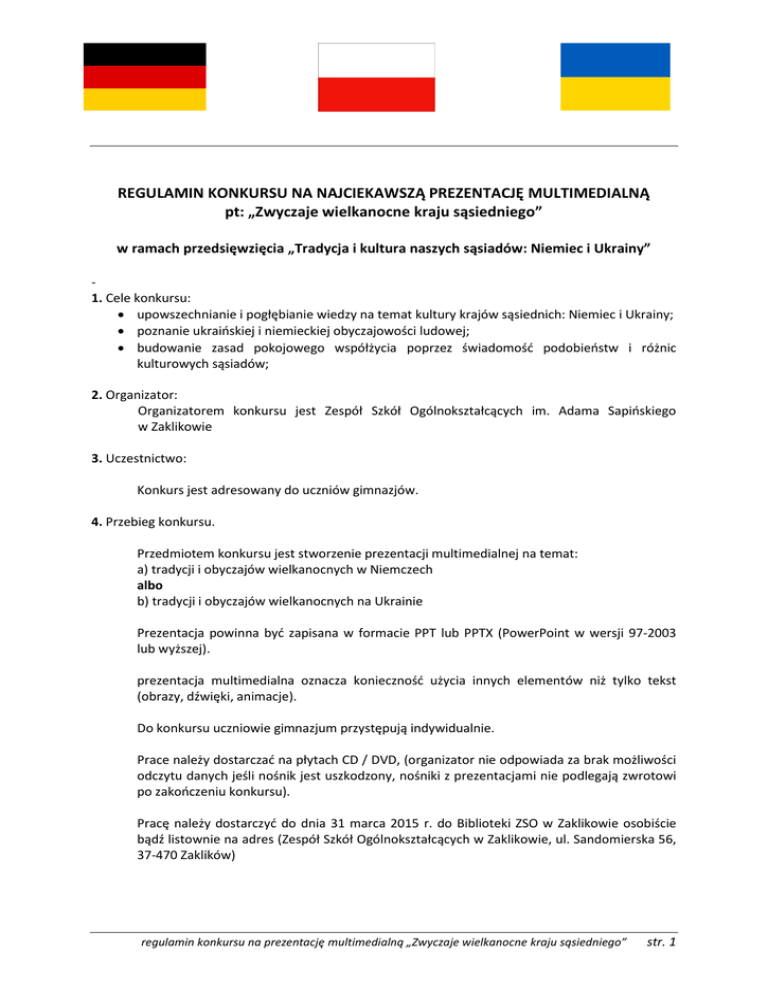 REGULAMIN KONKURSU NA NAJCIEKAWSZĄ PREZENTACJĘ MULTIMEDIALNĄ pt: „Zwyczaje wielkanocne kraju sąsiedniego” w ramach przedsięwzięcia „Tradycja i kultura naszych sąsiadów: Niemiec i Ukrainy” 1. Cele konkursu: upowszechnianie i pogłębianie wiedzy na temat kultury krajów sąsiednich: Niemiec i Ukrainy; poznanie ukraińskiej i niemieckiej obyczajowości ludowej; budowanie zasad pokojowego współżycia poprzez świadomość podobieństw i różnic kulturowych sąsiadów; 2. Organizator: Organizatorem konkursu jest Zespół Szkół Ogólnokształcących im. Adama Sapińskiego w Zaklikowie 3. Uczestnictwo: Konkurs jest adresowany do uczniów gimnazjów. 4. Przebieg konkursu. Przedmiotem konkursu jest stworzenie prezentacji multimedialnej na temat: a) tradycji i obyczajów wielkanocnych w Niemczech albo b) tradycji i obyczajów wielkanocnych na Ukrainie Prezentacja powinna być zapisana w formacie PPT lub PPTX (PowerPoint w wersji 97-2003 lub wyższej). prezentacja multimedialna oznacza konieczność użycia innych elementów niż tylko tekst (obrazy, dźwięki, animacje). Do konkursu uczniowie gimnazjum przystępują indywidualnie. Prace należy dostarczać na płytach CD / DVD, (organizator nie odpowiada za brak możliwości odczytu danych jeśli nośnik jest uszkodzony, nośniki z prezentacjami nie podlegają zwrotowi po zakończeniu konkursu). Pracę należy dostarczyć do dnia 31 marca 2015 r. do Biblioteki ZSO w Zaklikowie osobiście bądź listownie na adres (Zespół Szkół Ogólnokształcących w Zaklikowie, ul. Sandomierska 56, 37-470 Zaklików) regulamin konkursu na prezentację multimedialną „Zwyczaje wielkanocne kraju sąsiedniego” str. 1 5. Kryteria oceniania: wartość merytoryczna (w tym zgodność z tematem); przejrzysty i uporządkowany układ prezentacji; estetyka, kreatywność i innowacyjność wykonania. 6. Wyniki i prezentacja prac: obrady jury konkursowego odbędą się 16 kwietnia 2015 r.; ogłoszenie wyników 17 kwietnia 2015 r. do godz 11:00 na stronie internetowej szkoły: http://zsozaklikow.szkolna.net Rozdanie nagród 18 kwietnia 2015 r. godz. 12:00 w ZSO w Zaklikowie na uroczystości zakończenia naszego przedsięwzięcia: „Tradycja i kultura naszych sąsiadów: Niemiec i Ukrainy” 7. Postanowienia końcowe: Warunkiem uczestnictwa jest dołączenie do pracy ucznia: zgody opiekuna prawnego – załącznik nr 1 i karty zgłoszenia – załącznik nr 2. Organizator zastrzega sobie prawo do ewentualnych zmian w treści i wykładni regulaminu. Ocena komisji konkursowej jest ostateczna i nie podlega odwołaniom. W przypadku tworzenia projektu pod opieką nauczyciela szkoły, prosimy o podanie imienia i nazwiska opiekuna artystycznego. Organizatorzy konkursu przewidują dla zwycięzców cenne nagrody Zespół Szkół Ogólnokształcących im. Adama Sapińskiego ul. Sandomierska 56, 37-470 Zaklików tel. 15 8738409 Współfinansowano ze środków Starostwa Powiatowego w Stalowej Woli regulamin konkursu na prezentację multimedialną „Zwyczaje wielkanocne kraju sąsiedniego” str. 2