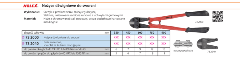 Nożyce dźwigniowe do sworzni Wykonanie: Materiał: Szczęki z przełożeniem i śrubą regulacyjną. Stabilne, lakierowane ramiona rurkowe z uchwytami gumowymi. Noże z chromowanej stali stopowej, ostrza dodatkowo hartowane indukcyjnie. 72B długość całkowita 73 2000 Noże zamienne, komplet ze śrubami mocującymi do prętów okrągłych do 19 HRC lub 800 N/mm2 do ⌀ do drutów i prętów okrągłych do 40 HRC lub 1200 N/mm2 72B mm Nożyce dźwigniowe do sworzni 73 2040 mm mm 73 2000 350 450 600 750 900 XXX XXX XXX XXX XXX XXX XXX XXX XXX XXX 6 5 7 6 9 7 12 8 15 9 ostrza pośrodkowe 73 2040