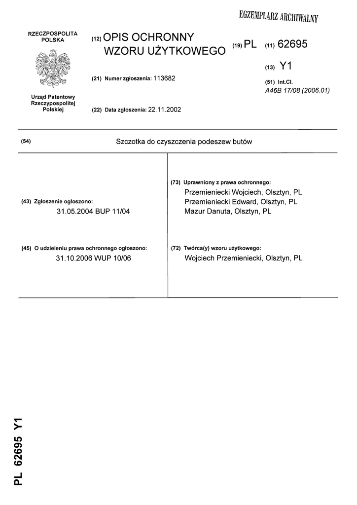EGZEMPLARZ ARCHIWALNY RZECZPOSPOLITA POLSKA (i2,OPIS OCHRONNY WZORU UŻYTKOWEGO (19) PL (n)62695 (13) (21) Numer zgłoszenia: 113682 Y1 (51) IntCI. A46B 17/08 (2006.01) Urząd Patentowy Rzeczypospolitej Polskiej (22) Data zgłoszenia: 22.11.2002 Szczotka do czyszczenia podeszew butów (54) (73) Uprawniony z prawa ochronnego: (43) Zgłoszenie ogłoszono: 31.05.2004 BUP 11/04 (45) O udzieleniu prawa ochronnego ogłoszono: 31.10.2006 WUP 10/06 m <L> Przemieniecki Wojciech, Olsztyn, PL Przemieniecki Edward, Olsztyn, PL Mazur Danuta, Olsztyn, PL (72) Twórca(y) wzoru użytkowego: Wojciech Przemieniecki, Olsztyn, PL Szczotka do czyszczenia podeszew butów Przedmiotem wzoru użytkowego jest szczotka do czyszczenia podeszew butów zwłaszcza do tańca towarzyskiego. Znane są szczotki różnego rodzaju np. do czyszczenia ubrań, zębów, mycia naczyń a także szczotki bezpyłowe. Wszystkie te szczotki posiadają uchwyt oraz główkę z elementem czyszczącym. Element czyszczący może być w postaci włosia, rolki czyszczącej lub drutów ostrzonych i wygiętych w jedną stronę w kierunku uchwytu. Według wzoru użytkowego szczotka do czyszczenia podeszew butów ma do szczytu główki szczotki przymocowaną poprzez gumkę ruchomą patkę z pętelkami. Na zewnętrznej stronie patki oraz na spodzie główki umieszczone są rzepy. Szczotka jest bardzo wygodna w użyciu ponieważ po zakończeniu czyszczenia jej elementy czyszczące zabezpiecza naciągnięta na nie pałka z pętelkami. - 2 - Przedmiot wzoru użytkowego przedstawiony jest na rysunku w schemacie ogólnym, na którym fig.l przedstawia szczotkę w widoku z góry a fig. 2 szczotkę w widoku z boku Szczotka do czyszczenia podeszew butów zwłaszcza do tańca towarzyskiego ma uchwyt I i główkę 2. Na główce 2 zamocowany jest element czyszczący 3 w postaci umieszczonych na całej powierzchni stalowych drutów ostrzonych i wygiętych w jedną stronę w kierunku uchwytu L główki 2 Do szczytu przymocowana jest poprzez gumkę 4 patka 5 z pętelkami 6. Na zewnętrznej stronie patki 5 oraz na spodzie główki 2 zamocowane są rzepy 7. Podczas używania szczotki, patka 5 zamocowana jest do spodu główki 2 za pomocą rzepów 7. Gdy szczotka nie jest używana patka 5_ całą powierzchnią przylega do drutów 3 a naciągnięta guma 4 powoduje, że pętelki 6 zahaczają o druty 3. / /f/rsczĄ *Vi Zastrzeżenie ochronne Szczotka do czyszczenia podeszew butów posiadająca uchwyt oraz główkę z elementem czyszczącym w postaci drutów ostrzonych i wygiętych w jedną stronę w kierunku uchwytu znamienna tym, że do szczytu główki (2) szczotki przymocowana jest poprzez gumkę (4) ruchoma patka (5) z pętelkami (6), natomiast na zewnętrznej stronie patki (5) oraz na spodzie główki (2) umieszczone są rzepy (7). SALON TANECZNY WIKA s.c Wojciech Przemieniecki Ednasd Przemieniecki, Danuta Mazur ul Koftąt^a 19, 10-034 Olsztyn tel./1ax 0-89/523 75 61 ^ NIP 739-020-45-81 — art — 'Aet^fpy}/^-/^" 1 13 CU lin- :o!ie C ri 5\b *l F/G. L 4 6 * 7 Z Ą FIG.Z jM SALON TANECZNY WIKm Przemieniecki sE^& Woiciech Woic ul. Kołłątaja 19 mm ;:' 10-034 Olsztyn tel./fax 0-89/523 75 61 NIP 739:020-45-81 prt SALON Upoważnić ~ SALON TANECZNY. IVojciec/i