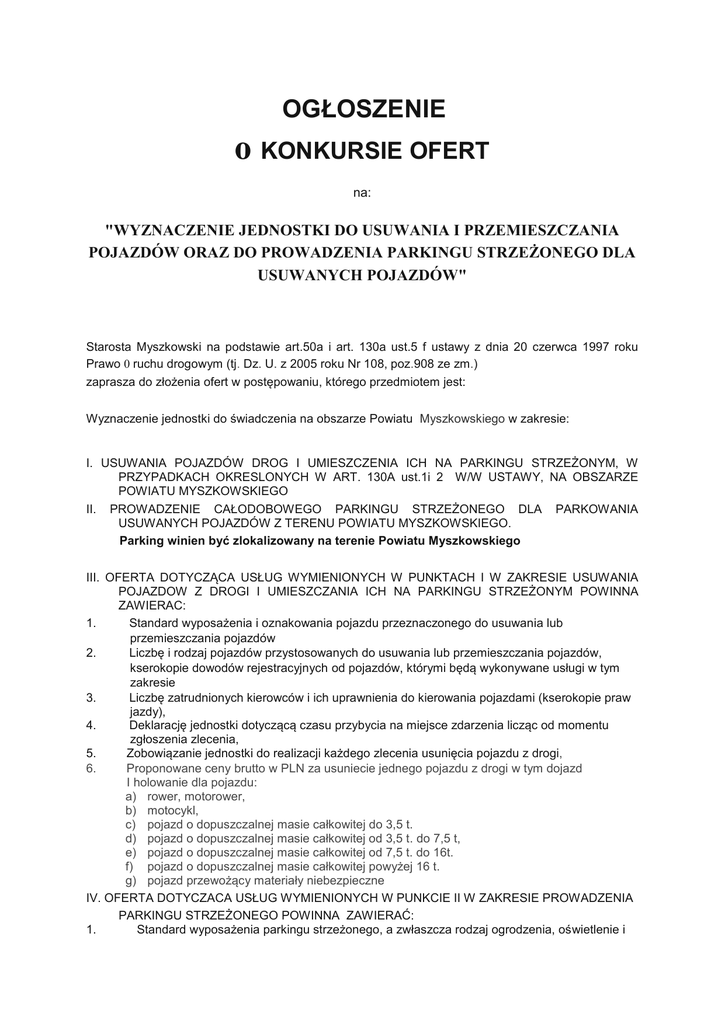 OGŁOSZENIE o KONKURSIE OFERT na: "WYZNACZENIE JEDNOSTKI DO USUWANIA I PRZEMIESZCZANIA POJAZDÓW ORAZ DO PROWADZENIA PARKINGU STRZEŻONEGO DLA USUWANYCH POJAZDÓW" Starosta Myszkowski na podstawie art.50a i art. 130a ust.5 f ustawy z dnia 20 czerwca 1997 roku Prawo 0 ruchu drogowym (tj. Dz. U. z 2005 roku Nr 108, poz.908 ze zm.) zaprasza do złożenia ofert w postępowaniu, którego przedmiotem jest: Wyznaczenie jednostki do świadczenia na obszarze Powiatu Myszkowskiego w zakresie: I. USUWANIA POJAZDÓW DROG I UMIESZCZENIA ICH NA PARKINGU STRZEŻONYM, W PRZYPADKACH OKRESLONYCH W ART. 130A ust.1i 2 W/W USTAWY, NA OBSZARZE POWIATU MYSZKOWSKIEGO II. PROWADZENIE CAŁODOBOWEGO PARKINGU STRZEŻONEGO DLA PARKOWANIA USUWANYCH POJAZDÓW Z TERENU POWIATU MYSZKOWSKIEGO. Parking winien być zlokalizowany na terenie Powiatu Myszkowskiego III. OFERTA DOTYCZĄCA USŁUG WYMIENIONYCH W PUNKTACH I W ZAKRESIE USUWANIA POJAZDOW Z DROGI I UMIESZCZANIA ICH NA PARKINGU STRZEŻONYM POWINNA ZAWIERAC: 1. Standard wyposażenia i oznakowania pojazdu przeznaczonego do usuwania lub przemieszczania pojazdów 2. Liczbę i rodzaj pojazdów przystosowanych do usuwania lub przemieszczania pojazdów, kserokopie dowodów rejestracyjnych od pojazdów, którymi będą wykonywane usługi w tym zakresie 3. Liczbę zatrudnionych kierowców i ich uprawnienia do kierowania pojazdami (kserokopie praw jazdy), 4. Deklarację jednostki dotyczącą czasu przybycia na miejsce zdarzenia licząc od momentu zgłoszenia zlecenia, 5. Zobowiązanie jednostki do realizacji każdego zlecenia usunięcia pojazdu z drogi, 6. Proponowane ceny brutto w PLN za usuniecie jednego pojazdu z drogi w tym dojazd I holowanie dla pojazdu: a) rower, motorower, b) motocykl, c) pojazd o dopuszczalnej masie całkowitej do 3,5 t. d) pojazd o dopuszczalnej masie całkowitej od 3,5 t. do 7,5 t, e) pojazd o dopuszczalnej masie całkowitej od 7,5 t. do 16t. f) pojazd o dopuszczalnej masie całkowitej powyżej 16 t. g) pojazd przewożący materiały niebezpieczne IV. OFERTA DOTYCZACA USŁUG WYMIENIONYCH W PUNKCIE II W ZAKRESIE PROWADZENIA PARKINGU STRZEŻONEGO POWINNA ZAWIERAĆ: 1. Standard wyposażenia parkingu strzeżonego, a zwłaszcza rodzaj ogrodzenia, oświetlenie i 2. 3. 4. 5. 6. 7. 8. monitoring, Liczbę miejsc do parkowania pojazdów, Proponowany rodzaj zabezpieczenia pojazdów, Warunki utrzymywania pojazdów, a zwłaszcza pojazdów z uszkodzeniami powypadkowymi, Miejsce położenia parkingu. Tytuł prawny do dysponowania parkingiem, odpowiednio utwardzonym placem (akty własności, Umowy) Zobowiązanie jednostki do realizacji każdego zlecenia umieszczania pojazdu na parkingu strzeżonym, Proponowane ceny brutto w PLN za każdą rozpoczętą dobę parkowania jednego pojazdu: a) rower, motorower, b) motocykl, c) pojazd o dopuszczalnej masie całkowitej do 3,5 t. d) pojazd o dopuszczalnej masie całkowitej od 3,5 t. do 7,5 t, e) pojazd o dopuszczalnej masie całkowitej od 7,5 t. do 16t. f) pojazd o dopuszczalnej masie całkowitej powyżej 16 t. g) pojazd przewożący materiały niebezpieczne V. OFERTĘ; NALEŻY PRZYGOTOWAC NA FORMULARZU OFERTOWYM, STANOWIĄCYM ZAŁĄCZNIK NR 1 DO NINIEJSZEGO OGŁOSZENIA. Do oferty należy dołączyć następujące dokumenty: 1. Aktualny odpis z właściwego rejestru albo zaświadczenie o wpisie do ewidencji działalności gospodarczej potwierdzający dopuszczenie do obrotu zgodnie z wymogami ustawowymi w zakresie objętym konkursem, 2. Kserokopie zaświadczenia o nadaniu numeru identyfikacji statystycznej (REGON), 3. Kserokopie zaświadczenia o nadaniu numeru identyfikacji podatkowej (NIP), 4. Oświadczenie, że oferent posiada uprawnienia niezbędne do wykonywania określonych prac lub czynności, jeżeli przepisy nakładają obowiązek posiadania takich uprawnień, o których mowa w ustawie z dnia 6 września 2001 r. o transporcie drogowym (tj. Dz. U. z 2007 r. Nr 125, poz. 874 z ze zm.) wymagane w przypadku składania oferty na usuwanie pojazdów z dróg (wg załącznika Nr 2) 5. Kserokopia licencji lub zaświadczenia wydana przez odpowiedni organ na przewóz rzeczy, 6. Zobowiązanie oferenta do realizacji każdego zlecenia usunięcia pojazdu z drogi przez całą dobę, (wg załącznika nr.3) 7. Zobowiązanie do zawarcia umowy ubezpieczenia odpowiedzialności cywilnej za szkody wyrządzone w związku z prowadzoną działalnością lub kserokopie zawartej umowy, 8. Oświadczenie o niezaleganiu z opłaceniem podatków, 9. Oświadczenie o niezaleganiu z opłacaniem składek na ubezpieczenie społeczne, 10. Minimum trzy fotografie o wymiarach 10x15 , na których jest widoczny utwardzony parking, ogrodzenie , oświetlenie , stróżówka lub kamery. 11. Kserokopie dowodów rejestracyjnych pojazdów przystosowanych do usuwania lub przemieszczania pojazdów, 12. Kserokopie dokumentów potwierdzających tytuł prawny do dysponowania parkingiem, 13. Kserokopie praw jazdy kierowców zatrudnionych przez jednostkę świadczącą usługi usuwania pojazdów z drogi. 14. Pełnomocnictwo ustanawiające pełnomocnika do reprezentowania ich w postępowaniu o udzielenie zamówienia. W przypadku złożenia oferty przez spółkę, cywilną zamawiający wymaga oprócz wymienionych wyżej dokumentów ,załączenia umowy spółki cywilnej VI. SPOSÓB PRZYGOTOWANIA OFERTY: Oferta winna: 1. Być złożona w formie oryginału lub kopii poświadczonej za zgodność z oryginałem, 2. Zawierać wszystkie wymagane dokumenty, oświadczenia, zaświadczenia; należy ją przygotować tak, aby nie by to możliwości rozłączenia się kartek, 3. Znajdować się w zamkniętej kopercie z napisem "Oferta na usuwanie i parkowanie pojazdów „ z adnotacją "Nie otwierać przed dniem 07.05.2013roku". VII. INFORMACJE OGOLNE. 1. Formularz ofertowy (Załącznik Nr 1) wraz z projektem umowy i pozostałymi załącznikami wymienionymi wyżej można pobrać w siedzibie Starostwa Powiatowego w Myszkowie lub ze strony internetowej Zamawiającego 2. Termin składania ofert 