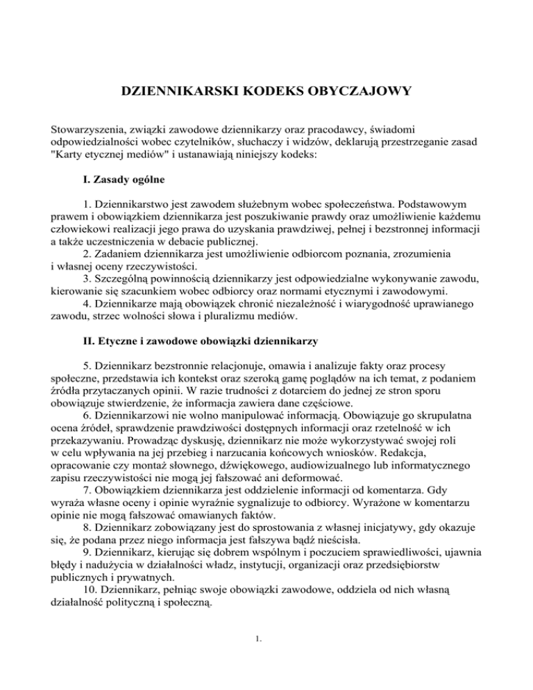 DZIENNIKARSKI KODEKS OBYCZAJOWY Stowarzyszenia, związki zawodowe dziennikarzy oraz pracodawcy, świadomi odpowiedzialności wobec czytelników, słuchaczy i widzów, deklarują przestrzeganie zasad "Karty etycznej mediów" i ustanawiają niniejszy kodeks: I. Zasady ogólne 1. Dziennikarstwo jest zawodem służebnym wobec społeczeństwa. Podstawowym prawem i obowiązkiem dziennikarza jest poszukiwanie prawdy oraz umożliwienie każdemu człowiekowi realizacji jego prawa do uzyskania prawdziwej, pełnej i bezstronnej informacji a także uczestniczenia w debacie publicznej. 2. Zadaniem dziennikarza jest umożliwienie odbiorcom poznania, zrozumienia i własnej oceny rzeczywistości. 3. Szczególną powinnością dziennikarzy jest odpowiedzialne wykonywanie zawodu, kierowanie się szacunkiem wobec odbiorcy oraz normami etycznymi i zawodowymi. 4. Dziennikarze mają obowiązek chronić niezależność i wiarygodność uprawianego zawodu, strzec wolności słowa i pluralizmu mediów. II. Etyczne i zawodowe obowiązki dziennikarzy 5. Dziennikarz bezstronnie relacjonuje, omawia i analizuje fakty oraz procesy społeczne, przedstawia ich kontekst oraz szeroką gamę poglądów na ich temat, z podaniem źródła przytaczanych opinii. W razie trudności z dotarciem do jednej ze stron sporu obowiązuje stwierdzenie, że informacja zawiera dane częściowe. 6. Dziennikarzowi nie wolno manipulować informacją. Obowiązuje go skrupulatna ocena źródeł, sprawdzenie prawdziwości dostępnych informacji oraz rzetelność w ich przekazywaniu. Prowadząc dyskusję, dziennikarz nie może wykorzystywać swojej roli w celu wpływania na jej przebieg i narzucania końcowych wniosków. Redakcja, opracowanie czy montaż słownego, dźwiękowego, audiowizualnego lub informatycznego zapisu rzeczywistości nie mogą jej fałszować ani deformować. 7. Obowiązkiem dziennikarza jest oddzielenie informacji od komentarza. Gdy wyraża własne oceny i opinie wyraźnie sygnalizuje to odbiorcy. Wyrażone w komentarzu opinie nie mogą fałszować omawianych faktów. 8. Dziennikarz zobowiązany jest do sprostowania z własnej inicjatywy, gdy okazuje się, że podana przez niego informacja jest fałszywa bądź nieścisła. 9. Dziennikarz, kierując się dobrem wspólnym i poczuciem sprawiedliwości, ujawnia błędy i nadużycia w działalności władz, instytucji, organizacji oraz przedsiębiorstw publicznych i prywatnych. 10. Dziennikarz, pełniąc swoje obowiązki zawodowe, oddziela od nich własną działalność polityczną i społeczną. 1. 11. Dziennikarz, w związku z wykonywaniem zawodu, nie poddaje się naciskom, nie przyjmuje korzyści materialnych, nie podporządkowuje swojej działalności interesom własnym i rodziny. 12. Dziennikarz, przedstawiając sceny przemocy, cierpienia i śmierci, czyni to jedynie w szczególnie uzasadnionych przypadkach i w niezbędnym zakresie; w poczuciu odpowiedzialności za ukazywane osoby. W każdym przypadku bierze pod uwagę wrażliwość odbiorców, mając szczególnie na względzie niekorzystny wpływ, negatywne wzorce, zagrożenie deprawacją - wynikające stąd dla dzieci i młodzieży. 13. Obowiązkiem dziennikarza jest poszanowanie wartości uniwersalnych, kultury i tradycji narodowej, postaw i przekonań religijnych oraz poglądów osób niewierzących, tolerancja dla odrębności kulturowych i obyczajowych. 14. Dziennikarza obowiązuje zakaz publikacji głoszących propagandę wojny i nienawiść, w szczególności narodową, religijną i rasową. 15. Przesądzenie o winie osoby oskarżonej przed wyrokiem sądu jest niedopuszczalne. Dziennikarz zobowiązany jest poinformować odbiorcę o uniewinnieniu lub uwolnieniu od zarzutu obwinionego w sprawie wcześniej przez siebie prezentowanej. 16. Dziennikarz zobowiązany jest przestrzegać norm prawnych i etycznych przy pozyskiwaniu informacji oraz szanować prawo informatorów do ochrony nazwiska i twarzy. 17. Dziennikarz jest obowiązany do ochrony tajemnicy zawodowej. Nie ujawnia źródeł informacji bez zgody zainteresowanych. 18. Dziennikarz jest zobowiązany do szczególnej odpowiedzialności przy wypowiedziach małoletnich i osób, które nie są w stanie wyrazić na to zgody w sposób świadomy i ocenić potencjalnych skutków swojej wypowiedzi. 19. Dziennikarzowi nie wolno naruszać dóbr osobistych. 20. Dziennikarz zobowiązany jest chronić prywatność każdego człowieka, chyba, że osoba sama ujawnia swoją prywatność. Może natomiast ujawniać szczegóły z życia prywatnego osób pełniących funkcje publiczne w zakresie niezbędnym do oceny przydatności do pełnienia funkcji lub sposobu jej wykonywania. 21. Dziennikarzowi nie wolno wprowadzać odbiorców w błąd przez sugerowanie, podkreślenia i wyolbrzymianie sensacyjnego charakteru wydarzeń, które nie znajdują potwierdzenia w materiale dziennikarskim. 22. Dziennikarz nie może odmówić osobie udzielającej informacji czy wywiadu autoryzacji cytowanej wypowiedzi, o ile nie była ona uprzednio publikowana ze wskazaniem źródła. Ma natomiast obowiązek uszanowania woli informatora co do sposobu wykorzystania informacji i terminu publikacji, jeśli zastrzeżenie takie zostało sformułowane przed przystąpieniem do zbierania materiału dziennikarskiego. III. Dziennikarz i pracodawca 23. Dziennikarz świadomie wybiera i akceptuje politykę redakcyjną gazety, pisma czy stacji, w której pracuje, niemniej zachowuje prawo do własnych poglądów oraz do odmowy wykonania zadań dziennikarskich niezgodnych z jego przekonaniami, normami etycznymi bądź prawnymi. 24. Reklama i tekst sponsorowany powinny być wyraźnie oznaczone i oddzielone od innych tekstów. Uprawianie kryptoreklamy jest niezgodne z etyką dziennikarską. 2. Dziennikarz nie ulega naciskom reklamodawców, nie ma obowiązku prowadzenia akwizycji reklam. Nie udostępnia swego nazwiska, twarzy czy głosu dla celów działalności reklamowej, chyba że jest to promocja gazety lub stacji, w kt
