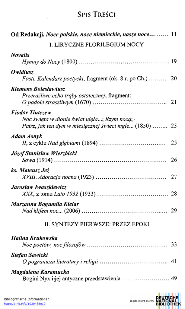SPIS TREŚCI Od Redakcji. Noce polskie, noce niemieckie, nasze noce 11 I. LIRYCZNE FLORILEGIUM NOCY Novalis Hymny do Nocy (1800) 19 Owidiusz Fasti. Kalendarz poetycki, fragment (ok. 8 r. po Ch.) 20 Klemens Boleslawiusz Przeraźliwe echo trąby ostatecznej, fragment: O padole straszliwym (1670) 21 Fiodor Tiutczew Noc święta w dłonie świat ujęła...', Rzym nocą; Patrz, jak ten dym w miesięcznej świeci mgle... (1850) 23 Adam Asnyk II, z cyklu Nad głębiami (1894) 25 Józef Stanisław Wierzbicki Sowa (1914) 26 ks. Mateusz Jeż XVIII. Adoracja nocna (1923) 27 Jarosław Iwaszkiewicz XXX, z tomu Lato 1932 (1933) 28 Marzanna Bogumiła Kielar Nad klifem noc... (2006) 29 II. SYNTEZY PIERWSZE: PRZEZ EPOKI Halina Krukowska Noc poetów, noc filozofów 33 Stefan Sawicki O pograniczu literatury i religii 41 Magdalena Karamucka Bogini Nyx i jej antyczne przedstawienia http://d-nb.info/1030488010 49 Spis treści 6 Elżbieta Wesołowska Noc u Wergiliusza 65 Krystyna Krawiec-Złotkowska „Pogrążony w nocy grzechu..." Metafizyczny aspekt ciemności w poezji Sebastiana Grabowieckiego 73 Włodzimierz Szturc „Gelobt sey uns die ewge Nacht". Namiętna noc Novalisa .... 91 Bogna Paprocka-Podlasiak „Noc Dziadów" w Fauście Józefa Szajny 105 Wiesław Trzeciakowski Liryka nocna (Nachtlyrik) w twórczości Novalisa i Josepha von Eichendorffa 123 Grzegorz Igliński Hymnen an die Nacht Novalisa w tłumaczeniu i interpretacji Stanisława Przybyszewskiego 135 Novalis Hymny ku Nocy. Przekład Stanisława Przybyszewskiego .... 157 Wojciech Gutowski Młodopolskie dialogi (z) nocą 173 III. ROMANTYCZNE ROZPOZNANIA: NIEMIECKI ŚLAD Zofia Oióg-Winiarska Przypomnienie. Sonet. W kręgu niemieckich inspiracji wczesnoromantycznych Adama Mickiewicza 231 Kama Krzemińska Wielka Improwizacja - między herezją a religijnością. Wstęp do interpretacji w kontekście estetyki Tiecka i Wackenrodera 247 Włodzimierz Próchnicki Niemieckie tropy w Panu Tadeuszu Adama Mickiewicza 255 Barbara Sawicka-Lewczuk Franz von Baader w prelekcjach paryskich Mickiewicza 283 Emilia Swiderska Gotycka groza w Mindowem Juliusza Słowackiego 297 7 Spis treści Zofia Wójcicka Koneksje poematu Juliusza Słowackiego W Szwajcarii z romantyzmem niemieckim 321 Iwona E. Rusek Czarne kobiety. Motyw Hekate w wybranych utworach Juliusza Słowackiego 337 Emilia Świderska O lęku metafizycznym w Balladynie Juliusza Słowackiego ... 365 Pelagia Bojko Głos w kwestii wpływów niemieckich na twórczość Zygmunta Krasińskiego 383 Adrian Koltoniak Nocne bestiarium w twórczości Seweryna Goszczyńskiego ... 401 Krzysztof Korotkich Noc w Zofiówce Seweryna Goszczyńskiego - romantyczny poemat o podróży wewnętrznej 413 Jerzy Winiarski Rękopiśmienny Zbiór wierszy (1823) Edwarda Walentego Kainki jako estetyczno-ideowy wzór poezji romantycznej. Notatka historycznoliteracka 439 IV. NA KRAWĘDZI STULECI: POZYTYWIZM, MODERNIZM Anna Janicka Powrót do nocy: Dumania pesymisty Aleksandra Świętochowskiego 461 Jarosław Ławski „Trochę dzika..." Konopnicka, wyobraźnia, ironia 475 Maria Obrusznik-Patryka Oswajanie nocy (na przykładzie wybranych utworów z epoki pozytywizmu) 513 Agnieszka Nietresta-Zatoń „Złe oczy Erynij w trupim dole wszechświata". 0 powinowactwach Jean-Paula, Zygmunta Krasińskiego 1 Tadeusza Micińskiego 527 Spis treści 8 Sabina Brzozowska „...Natura ludzka boi się próżni". Karnawał metafizyczny w Nocy rabinowej Tadeusza Micińskiego 561 Anna Tramer Dramat opadających liści. O Nocy listopadowej Stanisława Wyspiańskiego 581 Hanna Ratuszna „Sierp z opali" - symbolika nocy w poezji Kazimiery Zawistowskiej 601 Marek Kochanowski „W wir tej nocy diabli biorą" - wiry w poezji modernistycznej. Wstępne rozpoznania 613 Marcin Bajko Faust modernistyczny. Wokół dialogu Faust i Mefistofeles Jerzego Żuławskiego 629 V. PASJE I DEMONY: W STRONĘ WSPÓŁCZESNOŚCI Zbigniew Kaimierczak Sprzeczność a problem demoniczności w kulturze (Romantyzm, Nietzsche, chrześcijaństwo) 645 Daniel Kalinowski Franza Kafki nocne czuwanie 657 Arkadiusz Morawiec Dwie noce w Auschwitz. Biała noc Juliusza Kydryńskiego i Apel Jerzego Andrzejewskiego 671 Grzegorz Kowalski Topika biblijna w twórczości Juliusza Słowackiego i Para Lagerkvista. Dalekie powinowactwa 683 Bogna Paprocka-Podlasiak Noc w Ślubie Jerzego Jarockiego 697 Grażyna Król Ciemna strona bytu w poezji Kazimierza Ratonia 715 Artur Żywiołek Stefana Chwina Pasja realnej Nocy 731 Spis treści 9 Tomasz Bielak Noc, Mock, Breslau - o cyklu powieściowym Marka Krajewskiego 755 VI. SYNTEZY WTÓRE: PRZEKROJE I ANALIZY Janusz K. Goliński Maniera tenebrosa. O dawnym strachu przed ciemnością 767 Marek Nalepa „Noc mnie w swoje okryła skrzydła ukirzone". Polityczny niebyt i jego świetlne refleksy w wierszach i poematach porozbiorowych 783 Marta Bialobrzeska Dni ostanie Antoniego Malczewskiego - mity, tajemnice i fakty 815 Urszula Sokolska Język opisów natury w Balladach i romansach Adama Mickiewicza (obrazy wody, nieba, księżyca, nocy i dnia) 835 Marek Dybizbański Adama Bełcikowskiego tragedia „o ciężkim rynsztunku i retorycznych przyborach neoklasycyzmu niemieckiego" a jego Hamlet „dobrze skrojony" 849 Maria Jolanta Olszewska Stefana Żeromskiego „pasja nocy". Rekonesans 873 Noty o Autorach Resume. Nuit. Symbol - Theme - Metaphore Table des matieres Riassunto. Notte. Simbolo - Argomento — Metafora Indice Zusammenfassung. Nacht. Symbol - Thema - Metapher Indeks nazwisk 945 956 959 962 965