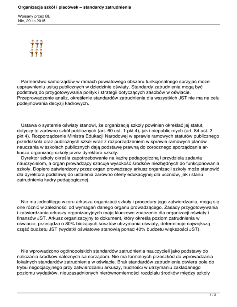 Organizacja szkół i placówek – standardy zatrudnienia Wpisany przez BL Nie, 29 lis 2015 Partnerstwo samorządów w ramach powiatowego obszaru funkcjonalnego sprzyjać może usprawnieniu usług publicznych w dziedzinie oświaty. Standardy zatrudnienia mogą być podstawą do przygotowywania polityk i strategii dotyczących zasobów w oświacie. Przeprowadzenie analiz, określenie standardów zatrudnienia dla wszystkich JST nie ma na celu podejmowania decyzji kadrowych. Ustawa o systemie oświaty stanowi, że organizację szkoły powinien określać jej statut, dotyczy to zarówno szkół publicznych (art. 60 ust. 1 pkt 4), jak i niepublicznych (art. 84 ust. 2 pkt 4). Rozporządzenie Ministra Edukacji Narodowej w sprawie ramowych statutów publicznego przedszkola oraz publicznych szkół wraz z rozporządzeniem w sprawie ramowych planów nauczania w szkołach publicznych dają podstawę prawną do corocznego sporządzania arkusza organizacji szkoły przez dyrektora szkoły. Dyrektor szkoły określa zapotrzebowanie na kadrę pedagogiczną i przydziela zadania nauczycielom, a organ prowadzący szacuje wysokość środków niezbędnych do funkcjonowania szkoły. Dopiero zatwierdzony przez organ prowadzący arkusz organizacji szkoły może stanowić dla dyrektora podstawę do ustalenia zarówno oferty edukacyjnej dla uczniów, jak i stanu zatrudnienia kadry pedagogicznej. Nie ma jednolitego wzoru arkusza organizacji szkoły i procedury jego zatwierdzania, mogą się one różnić w zależności od wymagań danego organu prowadzącego. Zasady przygotowywania i zatwierdzania arkuszy organizacyjnych mają kluczowe znaczenie dla organizacji oświaty i finansów JST. Arkusz organizacyjny to dokument, który określa poziom zatrudnienia w oświacie, przesądza o 80% bieżących kosztów utrzymania oświaty, determinuje największą część budżetu JST (wydatki oświatowe stanowią ponad 40% budżetu większości JST). Nie wprowadzono ogólnopolskich standardów zatrudnienia nauczycieli jako podstawy do naliczania środków należnych samorządom. Nie ma formalnych przeszkód do wprowadzania lokalnych standardów zatrudnienia w oświacie. Brak standardów zatrudnienia otwiera pole do trybu negocjacyjnego przy zatwierdzaniu arkuszy, trudności w utrzymaniu zakładanego poziomu wydatków, nieuzasadnionych nierównomierności rozdziału środków między szkoły 1/3 Organizacja szkół i placówek – standardy zatrudnienia Wpisany przez BL Nie, 29 lis 2015 tego samego typu. Parametryzację zatrudnienia w oświacie przez ustalanie limitu etatów (bon organizacyjny) sprawdzono w wielu JST. Przy tej metodzie korzysta się z tzw. zasadniczego wskaźnika organizacji liczby godzin nauczyciela (mającego etat 18 godzinny), które „idą za jednym uczniem” szkoły, która realizuje wymagane prawem oświatowym zajęcia (zob. ramowe plany nauczania). Wskaźniki organizacji ustala się odrębnie dla poszczególnych etapów edukacyjnych i rodzajów szkół (bo mają one różne ramowe plany nauczania). Oprócz zasadniczego wskaźnika organizacji (który można specyfikować dla nauczycieli prowadzących lekcje, zajęcia pozalekcyjne lub zajęcia wsparcia pedagogicznego) ustala się wskaźniki organizacji dla etatów dodatkowych (wynikających np. ze zniżki godzin dyrektora i doradcy metodycznego i wskaźniki organizacji dla administracji i obsługi. Po przemnożeniu liczby uczniów przez wskaźnik organizacji otrzymujemy limit określający maksymalną liczbę etatów nauczycieli. Koszty zatrudnienia nauczycieli wynikają z limitu oraz „cen” nauczycieli. O szkole, w której liczba uczniów na poziomie jednej klasy jest tak mała, że praktycznie uniemożliwia to dowolne kształtowanie wielkości i liczby oddziałów, mówimy, że nie jest elastyczna organizacyjnie. Limit zatrudnienia wynikający z zasadniczego wskaźnika organizacji może być tu trudno utrzymać. Organ prowadzący może uznać to za uzasadnione, może też podjąć działania zmierzające do racjonalizacji organizacji swoich szkół, racjonalizacji wykorzystania za- trudnionych nauczycieli. W grę mogą wchodzić porozumienia z innymi organami prowadzącymi szkoły, z innymi jednostkami samorządu terytorialnego z tego samego powiatu. Zracjonalizowanie wydatków na oświatę związanych z zatrudnieniem nauczycieli – ekstremalnie trudne do osiągnięcia w sytuacji negocjowania arkuszy organizacyjnych oraz budżetów szkół z ich dyrektorami – jest możliwe po wprowadzeniu bonu organizacyjnego. Świadczą o tym przykłady dobrej praktyki w tym zakresie. Bon organizacyjny wprowadza jasne zasady postępowania dzięki jednoznacznym kryteriom podziału środków, zwiększa autonomię dyrektorów szkół przy jednoczesnym zwiększeniu ich odpowiedzialności. System finansowania zachęca do racjonalnego wydawania pieniędzy. Tworzy warunki sprzyjające podnoszeniu poziomu pracy w szkole, ponieważ wymusza konieczność zabiegania o ucznia. Ułatwia kształtowanie wydatków oświatowych na poziomie samorządu, co usprawnia zarządzanie oświatą. Cele partnerstwa JST 2/3 Organizacja szkół i placówek – standardy zatrudnienia Wpisany przez BL Nie, 29 lis 2015 osłona działań na rzecz zwiększenia racjonalizacji zatrudnienia dzięki współpracy organów prowadzących z terenu obszaru funkcjonalnego wymiana doświadczeń i dobrych praktyk związanych z racjonalizacją zatrudnienia w oświacie wykorzystanie wspólnych działań związanych np. z kształceniem ustawicznym i dostosowaniem kształcenia do potrzeb lokalnego rynku pracy dla racjonalizacji zatrudnienia nauczycieli. Źródło: Model formalno-organizacyjny usprawnienia usług publicznych świadczonych przez jednostki samorządu terytorialnego w dziedzinie oświaty opracowany w ramach projektu „Kompetentny Urząd, Zadowoleni Mieszkańcy. Integracja działań JST dla poprawienia dostępności, jakości i efektywności świadczeń lokalnych usług publicznych” współfina