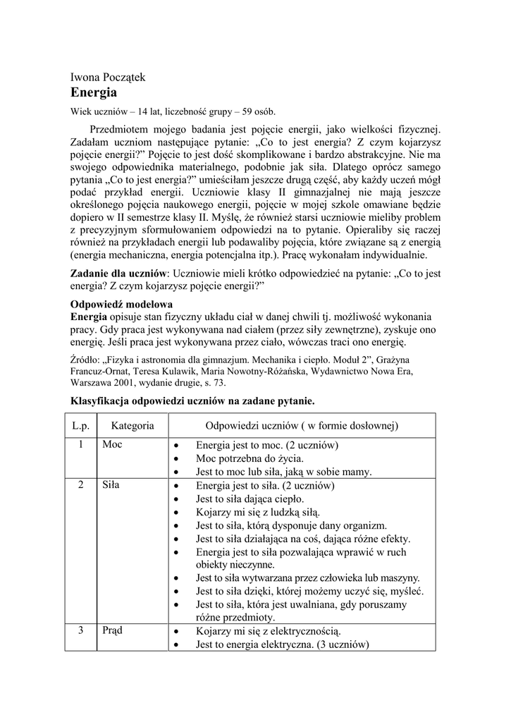 Iwona Początek Energia Wiek uczniów – 14 lat, liczebność grupy – 59 osób. Przedmiotem mojego badania jest pojęcie energii, jako wielkości fizycznej. Zadałam uczniom następujące pytanie: „Co to jest energia? Z czym kojarzysz pojęcie energii?” Pojęcie to jest dość skomplikowane i bardzo abstrakcyjne. Nie ma swojego odpowiednika materialnego, podobnie jak siła. Dlatego oprócz samego pytania „Co to jest energia?” umieściłam jeszcze drugą część, aby kaŜdy uczeń mógł podać przykład energii. Uczniowie klasy II gimnazjalnej nie mają jeszcze określonego pojęcia naukowego energii, pojęcie w mojej szkole omawiane będzie dopiero w II semestrze klasy II. Myślę, Ŝe równieŜ starsi uczniowie mieliby problem z precyzyjnym sformułowaniem odpowiedzi na to pytanie. Opieraliby się raczej równieŜ na przykładach energii lub podawaliby pojęcia, które związane są z energią (energia mechaniczna, energia potencjalna itp.). Pracę wykonałam indywidualnie. Zadanie dla uczniów: Uczniowie mieli krótko odpowiedzieć na pytanie: „Co to jest energia? Z czym kojarzysz pojęcie energii?” Odpowiedź modelowa Energia opisuje stan fizyczny układu ciał w danej chwili tj. moŜliwość wykonania pracy. Gdy praca jest wykonywana nad ciałem (przez siły zewnętrzne), zyskuje ono energię. Jeśli praca jest wykonywana przez ciało, wówczas traci ono energię. Źródło: „Fizyka i astronomia dla gimnazjum. Mechanika i ciepło. Moduł 2”, GraŜyna Francuz-Ornat, Teresa Kulawik, Maria Nowotny-RóŜańska, Wydawnictwo Nowa Era, Warszawa 2001, wydanie drugie, s. 73. Klasyfikacja odpowiedzi uczniów na zadane pytanie. L.p. Kategoria 1 Moc 2 Siła Odpowiedzi uczniów ( w formie dosłownej) • • • • • • • • • • • • 3 Prąd • • Energia jest to moc. (2 uczniów) Moc potrzebna do Ŝycia. Jest to moc lub siła, jaką w sobie mamy. Energia jest to siła. (2 uczniów) Jest to siła dająca ciepło. Kojarzy mi się z ludzką siłą. Jest to siła, którą dysponuje dany organizm. Jest to siła działająca na coś, dająca róŜne efekty. Energia jest to siła pozwalająca wprawić w ruch obiekty nieczynne. Jest to siła wytwarzana przez człowieka lub maszyny. Jest to siła dzięki, której moŜemy uczyć się, myśleć. Jest to siła, która jest uwalniana, gdy poruszamy róŜne przedmioty. Kojarzy mi się z elektrycznością. Jest to energia elektryczna. (3 uczniów) • • • • • • • • • 4 5 Ciepło Działanie • • • • • • • • • • 6 7 Proces Wysiłek • • • • • • • • Kojarzy mi się z prądem. Jest to światło. Jest to prąd pobierany do róŜnych przedmiotów np. światło, pralki. MoŜe być energia, z której czerpie się prąd. Jest to energia elektryczna, która zasila róŜne sprzęty elektryczne. (2 uczniów) Prąd, czyli energia, przepływa przez kable do róŜnych urządzeń. (3 uczniów) Gdy nie ma energii elektrycznej to nie mamy światła oraz nie działają maszyny, które potrzebują tej energii, aby funkcjonować. Jest to taka rzecz, którą moŜna zamienić np. na światło. Jest to energia świetlna, dzięki światłu wytwarza się coś innego. Jest to energia cieplna. Napędza mechanizmy. UmoŜliwia poruszanie się i działanie. Człowiek gdy nie ma energii jest słaby i bezsilny. W Ŝyciu codziennym potrzebna do Ŝycia. (2 uczniów) Jest to substancja potrzebna do sprawnego funkcjonowania np. telewizora, a energia zwykła np. do biegania na długich dystansach. Gdy człowiek jest wesoły to mówi się, Ŝe ma mnóstwo energii. Dla mnie jest to rzecz niematerialna, która pozwala nam funkcjonować i wypełniać codzienne czynności. Jest tez energia w zabawkach napędzanych przez silnik. Silnik potrzebuje baterii. Gdy człowiek wariuje to mówi się, Ŝe rozpiera go energia. Dzięki energii mamy chęć do Ŝycia. Jest to proces wytwarzany przez człowieka lub zakłady. Energia moŜe być wytwarzana w nas, jako coś co nam dodaje siły. MoŜna nią zastąpić prawie wszystko. Jest pozyskiwana głównie z sił natury. Kojarzy mi się z wysiłkiem oddawanym przez człowieka. Jest równieŜ inny rodzaj energii, który jest w człowieku. Kiedy śpimy to ją doładowujemy i jesteśmy wypoczęci. MoŜemy stracić energię, gdy wykonujemy jakąś męczącą czynność. Śpiąc nabywamy tą energię. 8 Jedzenie • • • • • • 9 Energia słoneczna • • • Energia do róŜnych ćwiczeń fizycznych. Kojarzy mi się ze sportem. Jak biegnę to teŜ jest energia. Energia znana jest z napojów, które dodają energii. Energia biologiczna, którą dostajemy dzięki spoŜywaniu cukrów i węglowodanów. Dla człowieka energia podawana jest w postaci kalorii. Kojarzy mi się z energią słoneczną. (3 uczniów) Energia jest wytwarzana przez Słońce. Energia słoneczna potrzebna jest roślinom do rośnięcia. Wnioski Zadając pytanie „Co to jest energia?” miałam duŜe obawy, Ŝe uczniowie nie będą umieli odpowiedzieć na to pytanie. I rzeczywiście pierwsze odczucie uczniów było takie, Ŝe nie wiedzieli co mają napisać. Dlatego zdecydowałam się na rozszerzenie pytania przez dodanie następnego „Z czym kojarzysz pojęcie energii?” Dopiero wtedy uczniowie udzielali odpowiedzi na zadane pytania. Wyniki są zaskakujące. Sądziłam, Ŝe uczniowie w ogóle nie poradzą sobie z tym pojęciem, będzie ono dla nich zupełnie obce. Większość odpowiedzi nie jest definicją modelową, jednak prawie wszystkie zawierają przykład pewnego procesu przemiany jednego rodzaju energii na inny lub podają źródło, z którego pochodzi energia. Trafne są spostrzeŜenia uczniów, Ŝe energia daje siłę do wykonania jakiejś pracy, moŜe zostać zamieniona na coś innego. Uczniowie zauwaŜają proces przemiany energii np. elektrycznej na energię mechaniczną podczas pracy urządzenia elektrycznego. Wymieniają róŜne rodzaje energii tj. energia słoneczna, cieplna, elektryczna. P