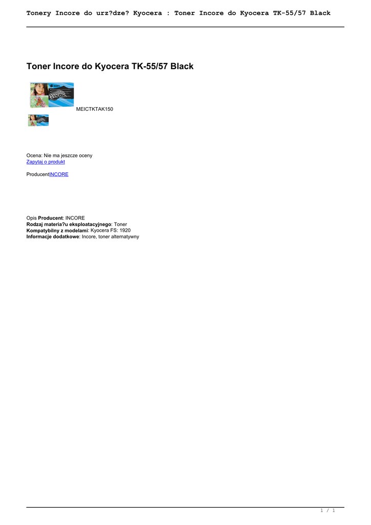Tonery Incore do urz?dze? Kyocera : Toner Incore do Kyocera TK-55/57 Black Toner Incore do Kyocera TK-55/57 Black MEICTKTAK150 Ocena: Nie ma jeszcze oceny Zapytaj o produkt ProducentINCORE Opis Producent: INCORE Rodzaj materia?u eksploatacyjnego: Toner Kompatybilny z modelami: Kyocera FS: 1920 Informacje dodatkowe: Incore, toner alternatywny 1 / 1 Powered by TCPDF (www.tcpdf.org)