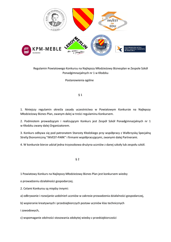 Regulamin Powiatowego Konkursu na Najlepszy Młodzieżowy Biznesplan w Zespole Szkół Ponadgimnazjalnych nr 1 w Kłodzku Postanowienia ogólne §1 1. Niniejszy regulamin określa zasady uczestnictwa w Powiatowym Konkursie na Najlepszy Młodzieżowy Biznes Plan, zwanym dalej w treści regulaminu Konkursem. 2. Podmiotem prowadzącym i realizującym Konkurs jest Zespół Szkół Ponadgimnazjalnych nr 1 w Kłodzku zwany dalej Organizatorem. 3. Konkurs odbywa się pod patronatem Starosty Kłodzkiego przy współpracy z Wałbrzyską Specjalną Strefą Ekonomiczną ”INVEST-PARK” i firmami współpracującymi, zwanymi dalej Partnerami. 4. W konkursie bierze udział jedna trzyosobowa drużyna uczniów z danej szkoły lub zespołu szkół. §2 1 Powiatowy Konkurs na Najlepszy Młodzieżowy Biznes Plan jest konkursem wiedzy o prowadzeniu działalności gospodarczej. 2. Celami Konkursu są między innymi: a) odkrywanie i rozwijanie uzdolnień uczniów w zakresie prowadzenia działalności gospodarczej, b) wspieranie kreatywnych i przedsiębiorczych postaw uczniów klas technicznych i zawodowych, c) wspomaganie zdolności stosowania zdobytej wiedzy z przedsiębiorczości i przedmiotów zawodowych w praktycznym działaniu, d) kształtowanie u uczniów umiejętności kluczowych, niezbędnych do prowadzenia własnej działalności gospodarczej, e) przygotowanie do potwierdzenia kwalifikacji zawodowych w poszczególnych zawodach, f) zweryfikowanie poziomu wiedzy i umiejętności uczniów klas technicznych i zawodowych związanych z zakładaniem i prowadzeniem działalności gospodarczej. §3 1. Prawo do udziału w Konkursie przysługuje uczniom szkół ponadgimnazjalnych technicznych i ogólnokształcących z powiatu kłodzkiego. 2. Drużyna zgłaszana jest do Konkursu za pośrednictwem szkoły lub zespołu szkół , których członkowie drużyny są uczniami. 3. Zgłoszenie uczestnictwa do udziału w Konkursie oznacza akceptację jego regulaminu. §4 1. Zawody Konkursu są dwustopniowe: I stopień - kwalifikacje a) przygotowanie Biznes Planu i przesłanie do organizatorów celem oceny, II stopień – finał a) test z zakresu wiedzy potrzebnej do założenia i funkcjonowania firmy b) zaprezentowanie swojego pomysłu na „ biznes” 2. Szczegółowe informacje o Konkursie, w tym: terminarz konkursu (zawodów I i II stopnia), wyniki kwalifikacji oraz finału konkursu, Organizator udostępnia na www.zsp1.ng.pl 3. Terminarz konkursu jest zawarty w niniejszym Regulaminie. 4. Warunkiem udziału w konkursie jest terminowe przysłanie zgłoszenia za karcie zgłoszenia stanowiącej załącznik do regulaminu. §5 1. Przedmiotem oceny w postępowaniu w pierwszym etapie jest: a) Zawartość Biznes Planu b) Forma przygotowania 2. Drużyna może otrzymać maksymalnie 40 punktów, po 20 za każdy obszar. 3. Wyniki pierwszego etapu zostaną podane drużynom do 11.10.2016 r. §6 1. Zawody II stopnia przeprowadza Organizator. 2. W zawodach II stopnia Biznes Plan prezentowany jest przez reprezentanta drużyny- maksymalny czas wystąpienia 10 minut. Opiekę nad uczniami sprawuje nauczyciel – opiekun z danej szkoły. 3. . Na wynik zawodów II stopnia składają się: a) b) c) d) ocena merytoryczna Biznes Planu z I stopnia Konkursu, punktacja z testu wiedzy – 20 pytań zamkniętych, ocena/ punktacja z prezentacji biznesplanu, ocena/ punktacja z odpowiedzi na pytanie członka komisji. W każdej z w-w. części Konkursu uczestnik może uzyskać maksymalnie 20 pkt. 4. Organizator, dla oceny Biznes Planu, powołuje komisję zawodów II stopnia składającą się z przedstawicieli Organizatora oraz Partnerów Konkursu. 5. Ocena prezentacji Biznes Planu przeprowadzana jest w obecności publiczności. 6. Komisja Konkursowa wyłania zdobywców 3 pierwszych miejsc oraz zastrzega sobie możliwość wręczenia specjalnego wyróżnienia. 7. O kolejności uzyskanych miejsc decyduje suma punktów zdobytych podczas zawodów (maks. 100 pkt. łącznie w dwóch etapach). W przypadku uzyskania równej liczby punktów o zajęciu 3 pierwszych miejsc decyduje liczba punktów zdobytych podczas kwalifikacji do zawodów II stopnia. W przypadku równej liczby punktów będą zadawane pytania uczestnikom przez członków komisji do pierwszej błędnej odpowiedzi. 8. Dokumentację Konkursu prowadzi Organizator. 9. Decyzje Komisji Konkursowej są ostateczne i niepodważalne. Postanowienia końcowe §7 1. Drużyna, której członek lub członkowie nie przestrzegają postanowień niniejszego Regulaminu, podlega dyskwalifikacji. 2. Wszelkie uwagi i zgłoszenia dotyczące naruszeń niniejszego Regulaminu należy przesyłać w formie pisemnej, nie później niż do 7 dni po zakończeniu Konkursu, na adres Organizatora: Zespół Szkół Ponadgimnazjalnych nr 1 w Kłodzku ul Bohaterów Getta 6; 57-300 Kłodzko 3. Dokumentacja Konkursu jest przechowywana przez 1 rok. 4. W sprawach nieuregulowanych niniejszym Regulaminem decyduje Organizator. Terminarz Konkursu: TERMINARZ Zgłoszenie drużyn do 23.09.2016r. – karta zgłoszenia Przesłanie biznesplanu do 04.10.2016r. – droga elektroniczna : [email protected] Ogłoszenie wyników I etapu 11.10.2016r. II etap konkursu 26.10.2016r. w siedzibie organizatora o godz. 9.00, Aula budynek „C”.