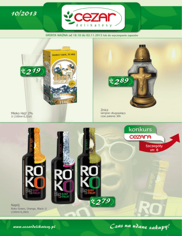 10/2013 OFERTA WAŻNA od 18.10 do 03.11.2013 lub do wyczerpania zapasów 219 Mleko Hej! 2% 1l (100ml-0,22zł) 289 Znicz lampion długopalący czas palenia 30h Szczegóły str. 8 Napój Roko Green, Orange, Black 1l (100ml-0,28zł) 279 2079 1959 Schab z beczki kg, Aleksandria (100g-1,96zł) 1399 Baleron wieprzowy gotowany kg, Mak-I (100g-1,40zł) super cena 18.10-27.10 Ćwiartka kurczaka kg 1479 Kurcze z duchówki Ogonówka parzona kg, Netter (100g-2,08zł) kg, Kier (100g-1,48zł) 1549 889 589 Kiełbasa kminkowa Borowiaka kg, Kier (100g-1,55zł) Serdelki z indykiem Smaczek kg, Netter (100g-0,59zł) kg, Duda (100g-0,89zł) 2639 1159 Szynka z wiochy Kiełbasa podwawelska kg, Nik-Pol (100g-2,64zł) kg, Unimięs (100g-1,16zł) 399 259 Hamburger dwupak Warzywa na patelnię z ryżem, z ziemniakami 400g (100g-0,65zł) 260g (100g-1,53zł) 25.10-3.11 1499 Filet sola Limanda kg (100g-1,50zł) 099 18.10-24.10 499 319 Banan Cytryna 379 Kapusta świeża kg (100g-0,32zł) kg (100g-0,50zł) 989 kg (100g-0,10zł) Bigos na zeberkach 2 kg kapusty kiszonej 750 g żeberek wieprzowych 2 cebule 8 ziaren ziela angielskiego 2 liście laurowe mała puszka koncentratu pomidorowego 2 łyżki smalcu garść suszonych grzybów 100 g suszonych śliwek sól, pieprz, cukier Sposób przygotowania: Kapusta kiszona kg (100g-0,38zł) Żeberko kg (100g-0,99zł) Kapustę wraz z sokiem włóż do dużego garnka, zalej wodą, tak, by ledwo przykryła kapustę (jeśli kiszona kapusta jest bardzo kwaśna, można ją przedtem przepłukać zimną wodą). Gotuj co najmniej 30 minut, sprawdzając, czy nie jest za sucha, i w razie potrzeby dolewając wody. W tym czasie pokrój żeberka na mniejsze kawałki (po 3-4 kostki), opłucz i osusz. Cebule obierz i pokrój w kostkę. Boczek pokrój w małą kostkę i podsmaż na smalcu, tak by powstały chrupiące skwarki. Skwarki przełóż do kapusty, a na wytopionym tłuszczu podsmaż cebulę i żeberka, dodaj do kapusty, dołóż grzyby, suszone śliwki, liście laurowe i ziele angielskie i gotuj dalej pod przykryciem ok. godziny, ewentualnie podlewając wodą. Następnie dodaj przecier pomidorowy, wymieszaj i gotuj jeszcze ok. 30 minut, aż żeberka będą miękkie. Usuń z nich kostki, mięso włóż z powrotem do bigosu. Dopraw bigos pieprzem, cukrem i ewentualnie solą (ale z umiarem, bo kapusta jest słona!). Bigos można jeść od razu, ale lepszy będzie na drugi dzień, po odgrzaniu. Smacznego! 319 Serek twarogowy paprykowy, śmietankowy, ziołowy 150g plastry (100g-2,13zł) 269 Jogurt 7 zbóż MEN Ser Edamski różne smaki 320g (100g-0,81zł) kg (100g-1,86zł) 209 Jajko niespodzianka Dino, Maja 70g (100g-3,84zł) Extra Extra Mix 82% 200g (100g-1,05zł) 219 (100g-2,74zł) 279 189 Konserwa Zduńskie Smaki Śmietana 18% różne rodzaje 300g (100g-0,63zł) 400g (100g-0,70zł) 219 419 Makrela Pastella różne smaki 80g 1859 259 w sosie pomidorowym 300g (100g-1,40zł) Śledzik na raz z dodatkiem cebuli, pikantny z chilli, z papryką i cebulą 100g (100g-2,19zł) ,, nowosc Vegeta 429 Dania gotowe: 259 fasolka z kiełbasą, gołąbki w sosie pomidorowym, klopsiki w sosie pomidorowym, pulpety w sosie pomidorowym 665g (100g-0,65zł) różne rodzaje 100g (100g-2,59zł) 269 239 Musztarda różne smaki 185g (100g-1,29zł) 289 Makaron spaghetti, kokardki 400-500g (100g-0,58-0,72zł) 1349 279 Sos Sałatka obiadowa, szwedzka 900ml (100ml-0,30zł) różne rodzaje 550g (100g-0,51zł) 469 Kawa rozpuszczalna 200g (100g-6,75zł) 379 599 Kaszka mleczno-ryżowa różne rodzaje 230g (100g-2,60zł) GRATIS Cappuccino duo - saszetka Płatki śniadaniowe Chocapic Hazelnut, Nesquik, Fitness z owocami, Fitness z jogurtem 220-250g (100g-1,88-2,13zł) Kawa rozpuszczalna 3w1 6szt 84g (100g-4,51zł) 1459 249 189 Płatki waflowe Michałki z Hanki kg (100g-1,46zł) mleczne, o smaku limonki 130g (100g-1,45zł) Polo Cola 2l (100ml-0,12zł) super cena 389 249 149 Napój energetyczny 899 Napój Leon 7up, Mirinda różne rodzaje 900ml (100ml-0,28zł) 2,5l (100ml-0,16zł) INFORMACJA HANDLOWA 1/2 litra piwa zawiera 25 g czystego alkoholu etylowego. Sprzedaż alkoholu osobom do lat 18 jest przestępstwem INFORMACJA HANDLOWA 1/2 litra piwa zawiera 25 g czystego alkoholu etylowego. Sprzedaż alkoholu osobom do lat 18 jest przestępstwem Original, Orange, X-durance 250ml (100ml-0,60zł) 229 Piwo Tatra Pils Piwo Okocim Mocne puszka 4x0,5l (100ml-1,80zł) but. 0,5l (100ml-0,46zł) 2199 1199 Odplamiacz Vanish Oxi Action Proszek do prania E 109 czas palenia 10h klepsydra Platinum szt. w płynie różne rodzaje 450ml (100ml-0,93zł) 479 Znicz czas palenia 36h 399 Szczotka Mydło kolor, białe 1,5l (100ml-0,80zł) białe, kolor 5,6kg (100g-0,39zł) Znicz 419 119 Rękawice ogrodnicze M, L kpl. 299 299 Znicz witrażowy, czas palenia 25h Znicz witrażowy, czas palenia 25h 479 549 Płyn do czyszczenia nagrobków Znicz 250ml (100ml-2,20zł) czas palenia 33h Dżem pomarańcza, jabłko, multiwitamina 2l (100ml-0,15zł) różne smaki 280g (100g-0,85zł) 229 249 Czekolada okienko z całymi orzechami laskowymi 100g (100g-2,49zł) 369 Herbata Loyd różne smaki 20t piramidki Ręcznik papierowy 2 rolki Piwo Wojak but. 0,5l (100ml-0,32zł) 169 Pierniki Uszatki lukrowane 170g (100g-0,99zł) INFORMACJA HANDLOWA Napój 159 1/2 litra piwa zawiera 25 g czystego alkoholu etylowego. Sprzedaż alkoholu osobom do lat 18 jest przestępstwem 239 299