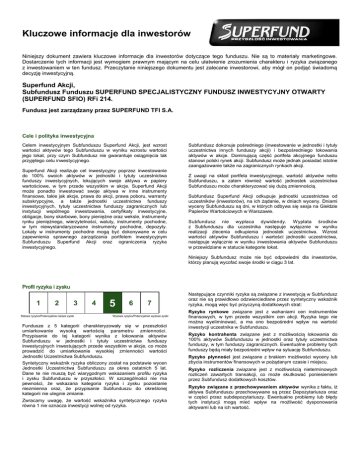 Kluczowe informacje dla inwestorów Niniejszy dokument zawiera kluczowe informacje dla inwestorów dotyczące tego funduszu. Nie są to materiały marketingowe. Dostarczenie tych informacji jest wymogiem prawnym mającym na celu ułatwienie zrozumienia charakteru i ryzyka związanego z inwestowaniem w ten fundusz. Przeczytanie niniejszego dokumentu jest zalecane inwestorowi, aby mógł on podjąć świadomą decyzję inwestycyjną. Superfund Akcji, Subfundusz Funduszu SUPERFUND SPECJALISTYCZNY FUNDUSZ INWESTYCYJNY OTWARTY (SUPERFUND SFIO) RFi 214. Fundusz jest zarządzany przez SUPERFUND TFI S.A. Cele i polityka inwestycyjna Celem inwestycyjnym Subfunduszu Superfund Akcji, jest wzrost wartości aktywów tego Subfunduszu w wyniku wzrostu wartości jego lokat, przy czym Subfundusz nie gwarantuje osiągnięcia tak przyjętego celu inwestycyjnego. Superfund Akcji realizuje cel inwestycyjny poprzez inwestowanie do 100% swoich aktywów w jednostki i tytuły uczestnictwa funduszy inwestycyjnych, lokujących swoje aktywa w papiery wartościowe, w tym przede wszystkim w akcje. Superfund Akcji może ponadto inwestować swoje aktywa w inne instrumenty finansowe, takie jak akcje, prawa do akcji, prawa poboru, warranty subskrypcyjne, a także jednostki uczestnictwa funduszy inwestycyjnych, tytuły uczestnictwa funduszy zagranicznych lub instytucji wspólnego inwestowania, certyfikaty inwestycyjne, obligacje, bony skarbowe, bony pieniężne oraz weksle, instrumenty rynku pieniężnego, wierzytelności, waluty, instrumenty pochodne, w tym niewystandaryzowane instrumenty pochodne, depozyty. Lokaty w instrumenty pochodne mogą być dokonywane w celu zapewnienia sprawnego zarządzania portfelem inwestycyjnym Subfunduszu Superfund Akcji oraz ograniczenia ryzyka inwestycyjnego. Subfundusz dokonuje pośredniego (inwestowanie w jednostki i tytuły uczestnictwa innych funduszy akcji) i bezpośredniego lokowania aktywów w akcje. Dominującą część portfela akcyjnego funduszu stanowi polski rynek akcji. Subfundusz może jednak posiadać istotne zaangażowanie także na zagranicznych rynkach akcji. Z uwagi na skład portfela inwestycyjnego, wartość aktywów netto Subfunduszu, a zatem również wartość jednostek uczestnictwa Subfunduszu może charakteryzować się dużą zmiennością. Subfundusz Superfund Akcji odkupuje jednostki uczestnictwa od uczestników (inwestorów), na ich żądanie, w dniach wyceny. Dniami wyceny Subfunduszu są dni, w których odbywa się sesja na Giełdzie Papierów Wartościowych w Warszawie. Subfundusz nie wypłaca dywidendy. Wypłata środków z Subfunduszu dla uczestnika następuje wyłącznie w wyniku realizacji zlecenia odkupienia jednostek uczestnictwa. Wzrost wartości aktywów Subfunduszu i wartości jednostki uczestnictwa, następuje wyłącznie w wyniku inwestowania aktywów Subfunduszu w przewidziane w statucie kategorie lokat. Niniejszy Subfundusz może nie być odpowiedni dla inwestorów, którzy planują wycofać swoje środki w ciągu 3 lat. Profil ryzyka i zysku 1 2 3 Niższe ryzyko/Potencjalnie niższe zyski 4 5 6 7 Wyższe ryzyko/Potencjalnie wyższe zyski Fundusze z 5 kategorii charakteryzowały się w przeszłości umiarkowanie wysoką wartością parametru zmienności. Przypisanie do tej kategorii wynika z lokowania aktywów Subfunduszu w jednostki i tytuły uczestnictwa funduszy inwestycyjnych inwestujących przede wszystkim w akcje, co może prowadzić do umiarkowanie wysokiej zmienności wartości Jednostki Uczestnictwa Subfunduszu. Syntetyczny wskaźnik ryzyka obliczony został na podstawie wycen Jednostki Uczestnictwa Subfunduszu za okres ostatnich 5 lat. Dane te nie muszą być wiarygodnym wskazaniem profilu ryzyka i zysku Subfunduszu w przyszłości. W szczególności nie ma pewności, że wskazana kategoria ryzyka i zysku pozostanie niezmienna oraz, że przypisanie Subfunduszu do określonej kategorii nie ulegnie zmianie. Zwracamy uwagę, że wartość wskaźnika syntetycznego ryzyka równa 1 nie oznacza inwestycji wolnej od ryzyka. Następujące czynniki ryzyka są związane z inwestycją w Subfundusz oraz nie są prawidłowo odzwierciedlane przez syntetyczny wskaźnik ryzyka, mogą więc być przyczyną dodatkowych strat: Ryzyko rynkowe związane jest z wahaniami cen instrumentów finansowych, w tym przede wszystkim cen akcji. Ryzyka tego nie można wyeliminować, a ma ono bezpośredni wpływ na wartość inwestycji uczestnika w Subfunduszu. Ryzyko kontrahenta związane jest z możliwością lokowania do 100% aktywów Subfunduszu w jednostki oraz tytuły uczestnictwa funduszy, w tym funduszy zagranicznych. Ewentualne problemy tych funduszy będą miały bezpośredni wpływ na sytuację Subfunduszu. Ryzyko płynności jest związane z brakiem możliwości wyceny lub zbycia instrumentów finansowych w pożądanym czasie i miejscu. Ryzyko rozliczenia związane jest z możliwością nieterminowych rozliczeń zawartych transakcji, co może skutkować poniesieniem przez Subfundusz dodatkowych kosztów. Ryzyko związane z przechowywaniem aktywów wynika z faktu, iż aktywa Subfunduszu przechowywane są przez Depozytariusza oraz w części przez subdepozytariuszy. Ewentualne problemy lub błędy tych instytucji mogą mieć wpływ na możliwość dysponowania aktywami lub na ich wartość. Opłaty Opłaty jednorazowe pobierane przed lub po dokonaniu inwestycji Opłata za nabycie Opłaty ponoszone przez inwestora służą pokryciu kosztów działania Subfunduszu, w tym kosztów dystrybucji i wprowadzenia do obrotu. Opłaty te zmniejszają potencjalny wzrost z inwestycji w Subfundusz. 4,50% Jest to maksymalna kwota, jaka może zostać pobrana z Państwa środków przed zainwestowaniem Opłata za umorzenie W określonych przypadkach wysokość opłaty za nabycie może być niższa od podanej w tabeli. Szczegółowe informacje uzyskać można u doradcy finansowego lub dystrybutora funduszu. 2,00% Opłaty pobierane z Subfunduszu w ciągu roku Opłaty bieżące 