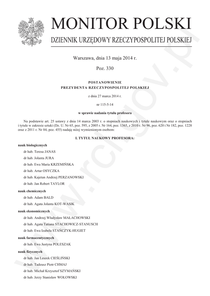 MONITOR POLSKI v.p l DZIENNIK URZĘDOWY RZECZYPOSPOLITEJ POLSKIEJ Warszawa, dnia 13 maja 2014 r. Poz. 330 Postanowienie Prezydenta Rzeczypospolitej Polskiej .go z dnia 27 marca 2014 r. nr 115-5-14 w sprawie nadania tytułu profesora Na podstawie art. 25 ustawy z dnia 14 marca 2003 r. o stopniach naukowych i tytule naukowym oraz o stopniach i tytule w zakresie sztuki (Dz. U. Nr 65, poz. 595, z 2005 r. Nr 164, poz. 1365, z 2010 r. Nr 96, poz. 620 i Nr 182, poz. 1228 oraz z 2011 r. Nr 84, poz. 455) nadaję niżej wymienionym osobom: I. TYTUŁ NAUKOWY PROFESORA: w. rcl nauk biologicznych dr hab. Teresa JANAS dr hab. Jolanta JURA dr hab. Ewa Maria KRZEMIŃSKA dr hab. Artur OSYCZKA dr hab. Kajetan Andrzej PERZANOWSKI dr hab. Jan Robert TAYLOR nauk chemicznych dr hab. Adam BALD dr hab. Agata Jolanta KOT-WASIK nauk ekonomicznych dr hab. Andrzej Władysław MAŁACHOWSKI ww dr hab. Agata Tatiana STACHOWICZ-STANUSCH dr hab. Ewa Izabela STAŃCZYK-HUGIET nauk farmaceutycznych dr hab. Ewa Justyna POLESZAK nauk fizycznych dr hab. Jan Leszek CIEŚLIŃSKI dr hab. Tadeusz Piotr CHMAJ dr hab. Michał Krzysztof SZYMAŃSKI dr hab. Jerzy Stanisław WOŁOWSKI Monitor Polski –2– Poz. 330 nauk humanistycznych dr hab. Bolesław Kazimierz HAJDUK dr hab. Lech Stanisław KOLAGO dr hab. Jaroslav LIPOWSKI dr hab. Sławomir Józef MOŹDZIOCH dr hab. Andrzej PIETRUSZCZAK dr hab. Elżbieta Krystyna RUDNICKA-FIRA dr hab. Konrad WALOSZCZYK dr hab. Mariusz Jacek WOŁOS nauk leśnych dr hab. Janusz Bogdan ZAWADZKI nauk matematycznych dr hab. Mikołaj BOJAŃCZYK dr hab. Mariusz KORAS dr hab. Tomasz SCHOEN .go dr hab. Gennadiy ZELDOVYCH v.p l dr hab. Wacław Antoni COCKIEWICZ w. rcl dr hab. Leszek Stanisław SKRZYPCZAK nauk medycznych dr hab. Leszek BIDZAN dr hab. Marian Karol DMOCHOWSKI dr hab. Jerzy Stanisław GIELECKI dr hab. Grzegorz Wojciech HELBIG dr hab. Paweł Adam KRAWCZYK dr hab. Robert Marek KRYSIAK dr hab. Wojciech Piotr LUBIŃSKI dr hab. Grzegorz Jarosław MAZUR dr hab. Witold PEPIŃSKI dr hab. Marek Tadeusz RĘKAS ww dr hab. Małgorzata Izabela SOBIESZCZAŃSKA nauk o kulturze fizycznej dr hab. Anna MARCHEWKA nauk prawnych dr hab. Czesław Michał MARTYSZ dr hab. Jarosław Bogumił ROMINKIEWICZ dr hab. Piotr Andrzej STĘPNIAK dr hab. Marek Jan SZEWCZYK dr hab. Michał Aleksander WALIGÓRSKI Monitor Polski –3– Poz. 330 nauk rolniczych dr hab. Wojciech Antoni RYBIŃSKI dr hab. Stanisław SIENKIEWICZ dr hab. Anna WÓJCIK nauk społecznych dr hab. Piotr MICKIEWICZ dr hab. Aleksandra Zenobia TOKARZ dr hab. Marek Adam WRZOSEK nauk technicznych dr hab. Jarosław BOSY dr hab. Aleksandr CARIOW dr hab. Paweł Antoni GIERYCZ dr hab. Włodzimierz KASPRZAK dr hab. Roman KULCHYTSKYY w. rcl dr hab. Teodor SKIEPKO .go dr hab. Tomasz Wojciech ZALEŚKIEWICZ v.p l dr hab. Janina Alicja GAJC-WOLSKA dr hab. Mieczysław SZATA dr hab. Marian Leon TUREK dr hab. Ryszard Stefan UKIELSKI dr hab. Andrzej Józef WYCIŚLIK II. TYTUŁ PROFESORA: sztuk muzycznych Karol Jan FERFECKI dr hab. Jolanta Henryka GZELLA Aleksandra PASZEK-TREFON ww Cezary SZYFMAN dr hab. Ziemowit Michał WOJTCZAK sztuk plastycznych Krystyna CZAJKOWSKA dr hab. Grzegorz RATAJCZYK Tadeusz RUS Prezes Rady Ministrów: D. Tusk Prezydent Rzeczypospolitej Polskiej: B. Komorowski