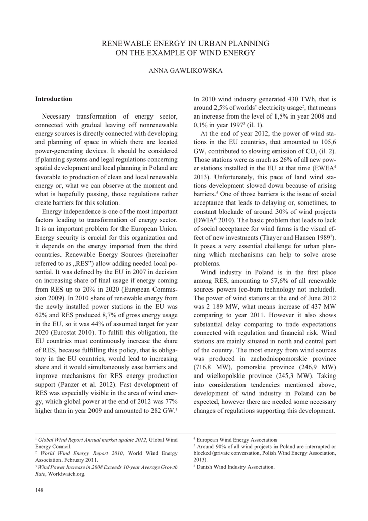 RENEWABLE ENERGY IN URBAN PLANNING ON THE EXAMPLE OF WIND ENERGY ANNA GAWLIKOWSKA Necessary transformation of energy sector, connected with gradual leaving off nonrenewable energy sources is directly connected with developing and planning of space in which there are located power-generating devices. It should be considered if planning systems and legal regulations concerning spatial development and local planning in Poland are favorable to production of clean and local renewable energy or, what we can observe at the moment and what is hopefully passing, those regulations rather create barriers for this solution. Energy independence is one of the most important factors leading to transformation of energy sector. It is an important problem for the European Union. Energy security is crucial for this organization and it depends on the energy imported from the third countries. Renewable Energy Sources (hereinafter referred to as „RES”) allow adding needed local potential. It was deÞned by the EU in 2007 in decision on increasing share of Þnal usage if energy coming from RES up to 20% in 2020 (European Commission 2009). In 2010 share of renewable energy from the newly installed power stations in the EU was 62% and RES produced 8,7% of gross energy usage in the EU, so it was 44% of assumed target for year 2020 (Eurostat 2010). To fulÞll this obligation, the EU countries must continuously increase the share of RES, because fulÞlling this policy, that is obligatory in the EU countries, would lead to increasing share and it would simultaneously ease barriers and improve mechanisms for RES energy production support (Panzer et al. 2012). Fast development of RES was especially visible in the area of wind energy, which global power at the end of 2012 was 77% higher than in year 2009 and amounted to 282 GW.1 In 2010 wind industry generated 430 TWh, that is around 2,5% of worlds’ electricity usage2, that means an increase from the level of 1,5% in year 2008 and 0,1% in year 19973 (il. 1). At the end of year 2012, the power of wind stations in the EU countries, that amounted to 105,6 GW, contributed to slowing emission of CO2 (il. 2). Those stations were as much as 26% of all new power stations installed in the EU at that time (EWEA4 2013). Unfortunately, this pace of land wind stations development slowed down because of arising barriers.5 One of those barriers is the issue of social acceptance that leads to delaying or, sometimes, to constant blockade of around 30% of wind projects (DWIA6 2010). The basic problem that leads to lack of social acceptance for wind farms is the visual effect of new investments (Thayer and Hansen 19897). It poses a very essential challenge for urban planning which mechanisms can help to solve arose problems. Wind industry in Poland is in the Þrst place among RES, amounting to 57,6% of all renewable sources powers (co-burn technology not included). The power of wind stations at the end of June 2012 was 2 189 MW, what means increase of 437 MW comparing to year 2011. However it also shows substantial delay comparing to trade expectations connected with regulation and Þnancial risk. Wind stations are mainly situated in north and central part of the country. The most energy from wind sources was produced in zachodniopomorskie province (716,8 MW), pomorskie province (246,9 MW) and wielkopolskie province (245,3 MW). Taking into consideration tendencies mentioned above, development of wind industry in Poland can be expected, however there are needed some necessary changes of regulations supporting this development. 1 4 Introduction Global Wind Report Annual market update 2012, Global Wind Energy Council. 2 World Wind Energy Report 2010, World Wind Energy Association. February 2011. 3 Wind Power Increase in 2008 Exceeds 10-year Average Growth Rate, Worldwatch.org. 148 European Wind Energy Association Around 90% of all wind projects in Poland are interrupted or blocked (private conversation, Polish Wind Energy Association, 2013). 6 Danish Wind Industry Association. 5 I. Technical parameters of wind stations more serious problems are connected with their location. For their functioning there are necessary favorable wind conditions, close distance to energy network and access roads and, especially, low population density on the area of wind investments, adequate features of terrain surface or sufÞcient distance from the birds’ habitats.13 Wind power plant is a complex consisting of wind engine, generator and work machine. According to the power of wind turbines (power plant) wind stations are deÞned as: micro (below 100 W); small (100 W to 50 kW); medium (50 kW to 100 kW); and large (over 100 kW). There are also differentiated wind turbines with horizontal and vertical axle. In turbines with horizontal axle, the rotor is rotating around the axle situated in the horizontal plane 8and, accordingly in vertical plane.9 For the reason of prices for electric energy, especially in case of large wind turbines, more proÞtable are power plants with the horizontal axle10. For energy diversiÞcation there are important different sizes of wind turbines, for spatial planning the most important are large turbines, up to 7,5 MW of large height11 (il. 3). Aiming at larger and larger rotors is connected with their efÞciency: because the output power of the wind stations increases in progress together with the increase of the rotor’s diameter. To keep an adequate distance of rotor’s wings from the terrain’s surface, the height of tower also increases. This height in the latest solutions goes already up to 198 m12, bringing the scale of windmills closer to the scale of high-rise buildings (il. 4). Wind power plants are not only objects of large height, they are also very complicated devices, which esthetics comes mostly from technical conditions. Comparing to high buildings, powers working on the turbines are much stronger because of placement of rotor’s propellers and their rotat