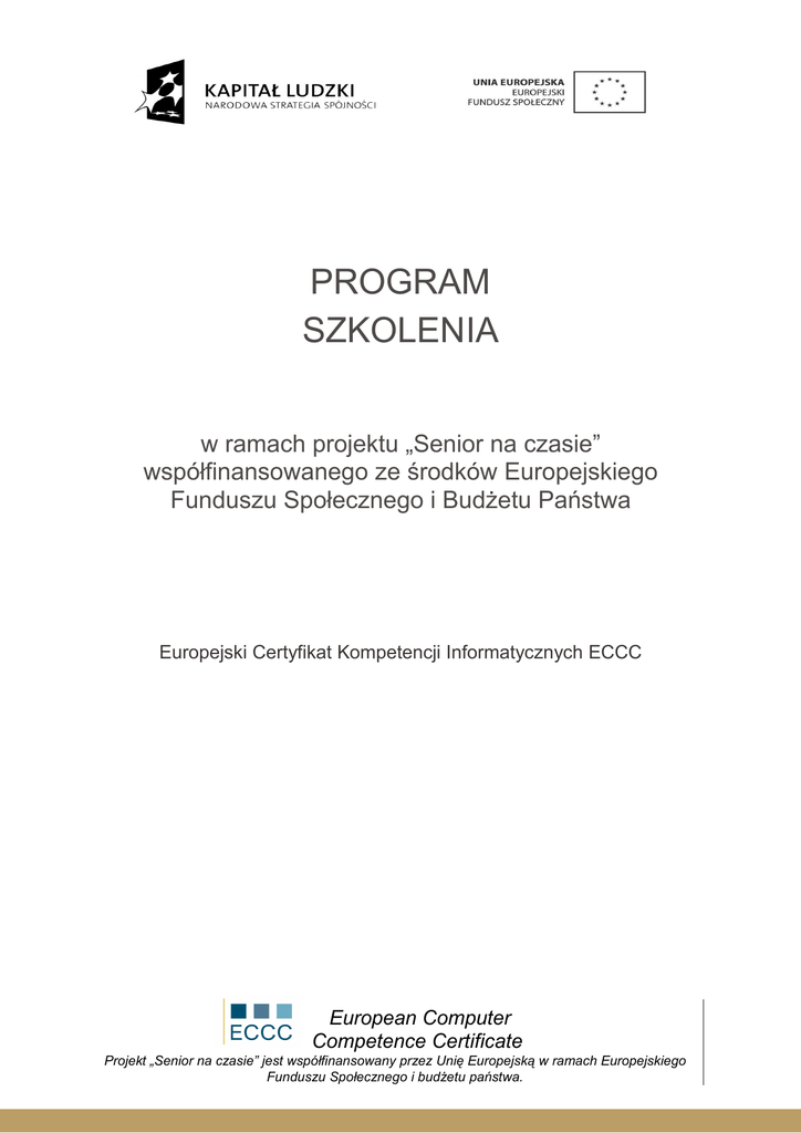 PROGRAM SZKOLENIA w ramach projektu „Senior na czasie” współfinansowanego ze środków Europejskiego Funduszu Społecznego i Budżetu Państwa Europejski Certyfikat Kompetencji Informatycznych ECCC European Computer Competence Certificate Projekt „Senior na czasie” jest współfinansowany przez Unię Europejską w ramach Europejskiego Funduszu Społecznego i budżetu państwa. 1. Moduł: IT M1 Sprzęt i oprogramowanie komputerowe Poziom: A Podstawowy MODUŁ IT M1 SPRZĘT I OPROGRAMOWANIE - POZIOM PODSTAWOWY A PODSTAWOWY WYMAGA OD KANDYDATA WYŁĄCZNIE CHĘCI PRZYSWOJENIA WIEDZY Z ZAKRESU OBJĘTEGO SZKOLENIEM I EFEKTYWNEJ NAUKI. PO UKOŃCZENIU SZKOLENIA KANDYDAT POWINIEN POSIADAĆ UMIEJĘTNOŚĆ ZDEFINIOWANIA PODSTAWOWEGO SPRZĘTU KOMPUTEROWEGO ORAZ URZĄDZEŃ PERYFERYJNYCH, ŚWIADOMEGO POSŁUGIWANIA SIĘ POPULARNYMI JEDNOSTKAMI MIAR, POJĘCIAMI Z ZAKRESU SIECI KOMPUTEROWYCH. POWINIEN RÓWNIEŻ ZNAĆ PODSTAWOWE POJĘCIA ZWIĄZANE Z SYSTEMAMI OPERACYJNYMI I OPROGRAMOWANIEM, A TAKŻE ZOBRAZOWAĆ RELACJE POMIĘDZY WARSTWAMI LOGICZNYMI ARCHITEKTURY SYSTEMU KOMPUTEROWEGO. 2. Moduł: IT M2 Edycja Dokumentów POZIOM: A PODSTAWOWY MODUŁ IT M2 EDYCJA DOKUMENTÓW – POZIOM A PODSTAWOWY UMOŻLIWI KANDYDATOWI NAUKĘ PODSTAWOWEJ OBSŁUGI EDYTORA TEKSTU W ZAKRESIE TWORZENIA I REDAGOWANIA DOKUMENTU. UCZESTNICY SZKOLENIA POZNAJĄ ZASADY ZAPISYWANIA DOKUMENTÓW I ICH OTWIERANIA, JAK RÓWNIEŻ ZASADY FORMATOWANIA TEKSTU W CELU NADANIA STOSOWNEGO, ESTETYCZNEGO WYGLĄDU PISMA. KURS OBEJMUJE TAKŻE PRACĘ Z TABELAMI, WYDRUK DOKUMENTU, TWORZENIE LIST PUNKTOWANYCH I NUMEROWANYCH ORAZ WSTAWIANIE OBIEKTÓW GRAFICZNYCH DO DOKUMENTU TEKSTOWEGO. 3. Moduł: IT M3 Obliczenia arkuszowe Poziom: A Podstawowy MODUŁ IT M3 OBLICZENIA ARKUSZOWE– POZIOM A PODSTAWOWY POZWALA KANDYDATOWI ZAPOZNAĆ SIĘ Z OBSŁUGĄ PROGRAMÓW DO OBLICZEŃ ARKUSZOWYCH NA PODSTAWOWYM POZIOMIE UMIEJĘTNOŚCI. UCZESTNICY SZKOLENIA DOWIEDZĄ SIĘ JAK OPRACOWAĆ RÓŻNORODNE ZESTAWIENIA W OPARCIU O PODSTAWOWE MOŻLIWOŚCI ARKUSZY KALKULACYJNYCH. POZNAJĄ RÓWNIEŻ MOŻLIWOŚCI WYKORZYSTANIA PODSTAWOWYCH FORM PREZENTACJI INFORMACJI TAKICH JAK WYKRESY, JAK RÓWNIEŻ NADAWANIA ARKUSZOWI PROFESJONALNEGO WYGLĄDU POPRZEZ MANIPULACJĘ KROJAMI PISMA, WYGLĄDEM KOMÓREK ORAZ FORMATEM ICH ZAWARTOŚCI. 4. Moduł: IT M6 Technologie informacyjno -komunikacyjne Poziom: A Podstawowy MODUŁ IT M6 TECHNOLOGIE INFORMACYJNO-KOMUNIKACYJNE – POZIOM A PODSTAWOWY UMOŻLIWI KANDYDATOWI POZNANIE PODSTAWOWEJ TERMINOLOGII ZWIĄZANEJ Z TECHNOLOGIAMI INFORMACYJNO-KOMUNIKACYJNYMI, WYSZUKIWANIA INFORMACJI, KORZYSTANIA Z POCZTY ELEKTRONICZNEJ I CHAT-ÓW. POZNANIE OBSŁUGI PROGRAMÓW WSPOMAGAJĄCYCH KOMUNIKACJĘ M.IN. PRZEGLĄDAREK INTERNETOWYCH, KOMUNIKATORÓW. European Computer Competence Certificate Projekt „Senior na czasie” jest współfinansowany przez Unię Europejską w ramach Europejskiego Funduszu Społecznego i budżetu państwa. SZCZEGÓŁOWY PROGRAM SZKOLENIA ECCC IT M1 SPRZĘT OPROGRAMOWANIE -POZIOM A PODSTAWOWY 1. KOMPUTER I JEGO BUDOWA: 1.1. Pojęcie komputera oraz podsumowanie historii rozwoju komputera. 1.1.1. Komputer, co to jest? Pojęcie komputera. 1.1.2. Powstanie komputera, historia. 1.1.3. Typy komputerów. 1.1.4. Prawo Moore’a. 1.2. Komputer jako element składowy systemu informacyjnego. 1.2.1. System informacyjny, a system informatyczny. 1.2.2. Komputer jako narzędzie informacyjne. 1.2.3. Wyjaśnienie potrzeby wykorzystania komputera jako medium w systemach informacyjnych. 1.2.4. Czy komputer to konieczność? Gdzie go używać, a gdzie nie. 1.3. Podstawowe elementy składowe współczesnego komputera oraz popularne jednostki miar stosowane w informatyce i technologii informacyjnej. 1.3.1. Pamięć. 1.3.2. Procesor. 1.3.3. Płyta główna. 1.3.4. Napędy optyczne. 1.3.5. Dyski wymienne. 1.3.6. Podstawy miar (systemy miar o podstawie 2, a nie 10). 1.3.7. Popularne jednostki miar. 1.4. Podstawy zapisu danych. Przegląd urządzeń magazynujących, zapisujących I odczytujących dane. 1.4.1. Dyskietki, czytniki pamięci i pamięć flash. 1.4.2. Dyski twarde (stałe), dyski optyczne. 1.4.3. Napędy taśmowe oraz serwery danych. 2. URZĄDZENIA PERYFERYJNE: 2.1. Pojęcie urządzenia peryferyjnego. Wyjaśnienie zależności między komputerem a urządzeniem wejścia/wyjścia. 2.1.1. Urządzenia peryferyjne. 2.1.2. Wyjaśnienie zależności między komputerem, a urządzeniem wejścia/wyjścia. 2.1.3. Metody podłączeń urządzeń peryferyjnych. 2.2. Podstawowe urządzenia peryferyjne. Przegląd popularnych urządzeń wykorzystywanych w komputerach osobistych. 2.2.1. Monitor, projektor, telewizor. 2.2.2. Drukarka, ploter. 2.2.3. Skaner, aparat cyfrowy, kamera. 2.2.4. Klawiatura, mysz, trackball, touchpad. 2.2.5. Urządzenia nawigacyjne, palmtopy, telefony. 2.2.6. Inne urządzenia. 2.3. Rozróżnienie urządzeń wejścia/wyjścia. Zrozumienie i umiejętność rozpoznania urządzeń oraz dopasowanie wymagań sprzętowych. European Computer Competence Certificate Projekt „Senior na czasie” jest współfinansowany przez Unię Europejską w ramach Europejskiego Funduszu Społecznego i budżetu państwa. 2.3.1. Wyjaśnienie pojęcia I/O. 2.3.2. Analiza urządzeń wejścia. 2.3.3. Urządzenia wyjścia i ich cechy. 3. SIECI KOMPUTEROWE: 3.1. Pojęcie sieci komputerowej i jej wykorzystania do przenoszenia danych we współczesnym społeczeństwie informacyjnym. 3.1.1. Pojęcie sieci komputerowej, czym jest i do czego służy. 3.1.2. Popularne technologie (medium) fizycznych połączeń. 3.1.3. Protokoły transmisji danych. 3.1.4. Powstanie pierwszych sieci komputerowych. 3.2. Obszary zastosowania sieci komputerowych. Wyjaśnienie potrzeby zastosowania sieci w celu szybkiej komunikacji między komputerami. 3.2.1. Globalna sieć Internet (wyszukiwanie informacji, przesyłanie danych itp.). 3.2.2. Lokalne połączenie stacji roboczych, współdzielenie zasobów. 3.2.3. Połączenia bezpośrednie oraz z użyciem urządzeń aktywnych. 3.2.4. Zamknięte