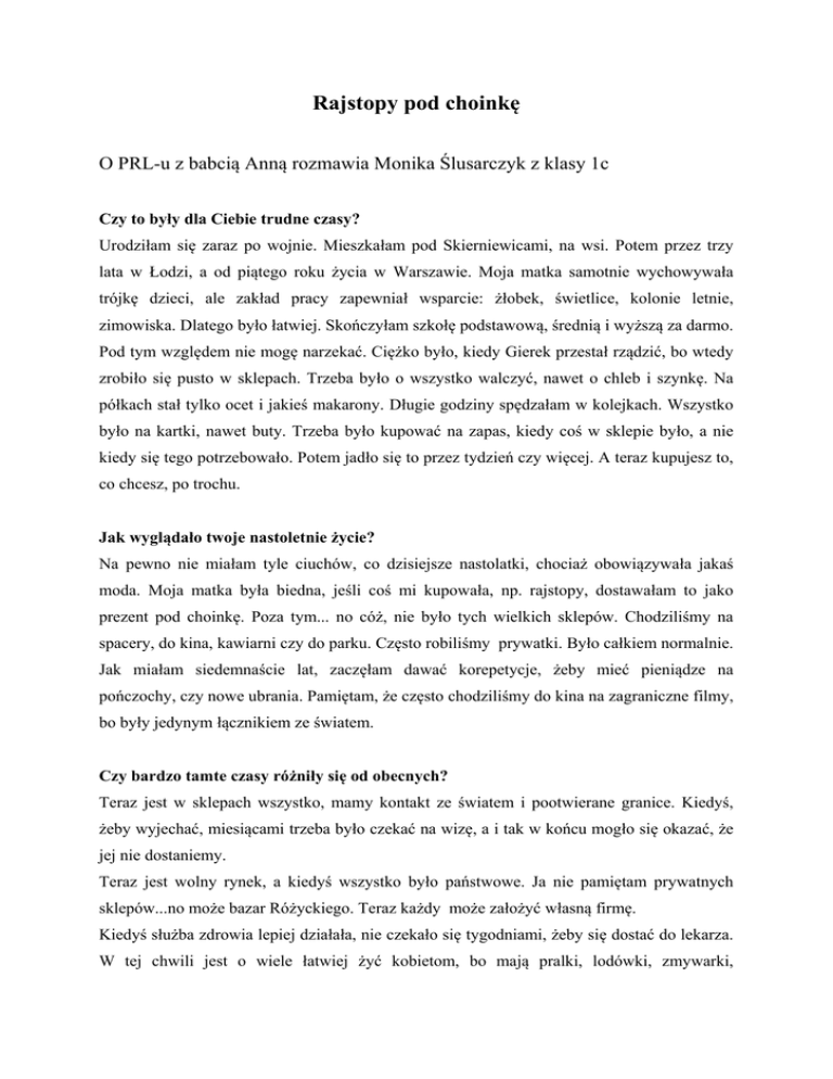 Rajstopy pod choinkę O PRL-u z babcią Anną rozmawia Monika Ślusarczyk z klasy 1c Czy to były dla Ciebie trudne czasy? Urodziłam się zaraz po wojnie. Mieszkałam pod Skierniewicami, na wsi. Potem przez trzy lata w Łodzi, a od piątego roku życia w Warszawie. Moja matka samotnie wychowywała trójkę dzieci, ale zakład pracy zapewniał wsparcie: żłobek, świetlice, kolonie letnie, zimowiska. Dlatego było łatwiej. Skończyłam szkołę podstawową, średnią i wyższą za darmo. Pod tym względem nie mogę narzekać. Ciężko było, kiedy Gierek przestał rządzić, bo wtedy zrobiło się pusto w sklepach. Trzeba było o wszystko walczyć, nawet o chleb i szynkę. Na półkach stał tylko ocet i jakieś makarony. Długie godziny spędzałam w kolejkach. Wszystko było na kartki, nawet buty. Trzeba było kupować na zapas, kiedy coś w sklepie było, a nie kiedy się tego potrzebowało. Potem jadło się to przez tydzień czy więcej. A teraz kupujesz to, co chcesz, po trochu. Jak wyglądało twoje nastoletnie życie? Na pewno nie miałam tyle ciuchów, co dzisiejsze nastolatki, chociaż obowiązywała jakaś moda. Moja matka była biedna, jeśli coś mi kupowała, np. rajstopy, dostawałam to jako prezent pod choinkę. Poza tym... no cóż, nie było tych wielkich sklepów. Chodziliśmy na spacery, do kina, kawiarni czy do parku. Często robiliśmy prywatki. Było całkiem normalnie. Jak miałam siedemnaście lat, zaczęłam dawać korepetycje, żeby mieć pieniądze na pończochy, czy nowe ubrania. Pamiętam, że często chodziliśmy do kina na zagraniczne filmy, bo były jedynym łącznikiem ze światem. Czy bardzo tamte czasy różniły się od obecnych? Teraz jest w sklepach wszystko, mamy kontakt ze światem i pootwierane granice. Kiedyś, żeby wyjechać, miesiącami trzeba było czekać na wizę, a i tak w końcu mogło się okazać, że jej nie dostaniemy. Teraz jest wolny rynek, a kiedyś wszystko było państwowe. Ja nie pamiętam prywatnych sklepów...no może bazar Różyckiego. Teraz każdy może założyć własną firmę. Kiedyś służba zdrowia lepiej działała, nie czekało się tygodniami, żeby się dostać do lekarza. W tej chwili jest o wiele łatwiej żyć kobietom, bo mają pralki, lodówki, zmywarki, mikrofalówki. Za PRL-u swoją pierwszą elektryczną pralkę kupiłam, jak dostałam talon od kuzyna. Nieliczni ludzie mieli telefony w domu, a teraz każdy ma komórkę. Ta łączność ze światem jest plusem demokracji. Jednak muszę powiedzieć, że gdyby mojej mamie przyszło żyć w tych czasach to byśmy zginęli, bo bylibyśmy zbyt biedni, żeby się utrzymać bez takiej pomocy, jaka była wtedy oferowana. Ile miałaś lat, gdy PRL się skończył? Byłam już dorosła, miałam swój dom i rodzinę. Czy chciałabyś, żeby te czasy wróciły? Są powody, dla których bym chciała: darmowa służba zdrowia, szkoła, wakacje. Ale z drugiej strony, gdy pomyślę o tych kolejkach.... Poza tym, niektórzy ludzie walczyli o wolność i byli gnębieni, chociaż ja tego nie odczułam. Byłam nauczycielką i się nie angażowałam. Nigdy nie czułam się gnębiona ani przez tamten ustrój, ani przez ten. No i teraz człowiek może żyć tak, jak go na to stać, a nie tak, jak musi. Monika Ślusarczyk Ic’