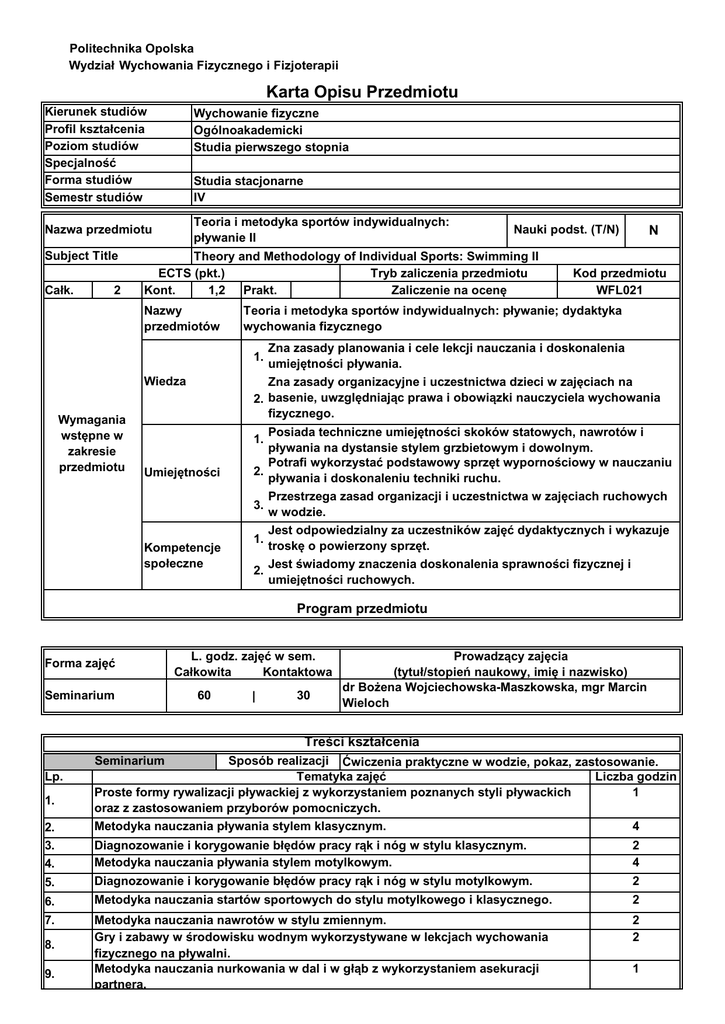 Politechnika Opolska Wydział Wychowania Fizycznego i Fizjoterapii Karta Opisu Przedmiotu Kierunek studiów Profil kształcenia Poziom studiów Specjalność Forma studiów Semestr studiów Wychowanie fizyczne Ogólnoakademicki Studia pierwszego stopnia Studia stacjonarne IV Teoria i metodyka sportów indywidualnych: pływanie II Nazwa przedmiotu Subject Title Całk. 2 Nauki podst. (T/N) Theory and Methodology of Individual Sports: Swimming II ECTS (pkt.) Tryb zaliczenia przedmiotu Kont. 1,2 Prakt. Zaliczenie na ocenę Nazwy przedmiotów N Kod przedmiotu WFL021 Teoria i metodyka sportów indywidualnych: pływanie; dydaktyka wychowania fizycznego Zna zasady planowania i cele lekcji nauczania i doskonalenia umiejętności pływania. Zna zasady organizacyjne i uczestnictwa dzieci w zajęciach na 2. basenie, uwzględniając prawa i obowiązki nauczyciela wychowania fizycznego. 1. Wiedza Wymagania wstępne w zakresie przedmiotu 1. Umiejętności 2. 3. Kompetencje społeczne 1. 2. Posiada techniczne umiejętności skoków statowych, nawrotów i pływania na dystansie stylem grzbietowym i dowolnym. Potrafi wykorzystać podstawowy sprzęt wypornościowy w nauczaniu pływania i doskonaleniu techniki ruchu. Przestrzega zasad organizacji i uczestnictwa w zajęciach ruchowych w wodzie. Jest odpowiedzialny za uczestników zajęć dydaktycznych i wykazuje troskę o powierzony sprzęt. Jest świadomy znaczenia doskonalenia sprawności fizycznej i umiejętności ruchowych. Program przedmiotu Forma zajęć Seminarium L. godz. zajęć w sem. Całkowita Kontaktowa 60 | 30 Prowadzący zajęcia (tytuł/stopień naukowy, imię i nazwisko) dr Bożena Wojciechowska-Maszkowska, mgr Marcin Wieloch Treści kształcenia 2. Sposób realizacji Ćwiczenia praktyczne w wodzie, pokaz, zastosowanie. Tematyka zajęć Liczba godzin Proste formy rywalizacji pływackiej z wykorzystaniem poznanych styli pływackich 1 oraz z zastosowaniem przyborów pomocniczych. Metodyka nauczania pływania stylem klasycznym. 4 3. 4. Diagnozowanie i korygowanie błędów pracy rąk i nóg w stylu klasycznym. Metodyka nauczania pływania stylem motylkowym. 2 4 5. Diagnozowanie i korygowanie błędów pracy rąk i nóg w stylu motylkowym. 2 6. Metodyka nauczania startów sportowych do stylu motylkowego i klasycznego. 2 7. Metodyka nauczania nawrotów w stylu zmiennym. Gry i zabawy w środowisku wodnym wykorzystywane w lekcjach wychowania fizycznego na pływalni. Metodyka nauczania nurkowania w dal i w głąb z wykorzystaniem asekuracji partnera. 2 2 Seminarium Lp. 1. 8. 9. 1 Podstawowe zasady ratownictwa wodnego. Autoasekuracja i asekuracja partnera podczas wykonywania ćwiczeń w wodzie. Wybrane testy i sprawdziany techniki pływackiej wykorzystywane podczas lekcji 11. nauczania. Zaliczenie praktyczne: pływanie na dystansie 50 m stylemklasycznym zgodnie z 12. przepisami FINA oraz norm czasowych. Zaliczenie praktyczne: pływanie na dystansie 50 m stylem motylkowym zgodnie z 13. przepisami FINA oraz norm czasowych. Zaliczenie praktyczne: pływanie na dystansie 100 m stylem zmiennym zgodnie z 14. przepisami FINA oraz norm czasowych. L. godz. pracy własnej studenta 30 L. godz. kontaktowych w sem. 10. 2 2 2 2 2 30 Obserwacja aktywności na zjęciach seminaryjnych, ocena z przebiegu Sposoby sprawdzenia zamierzonych ćwiczeń, identyfikacja błędów i analiza techniki ruchu, metoda i forma rozwiązania sytuacji problemowej, zaliczenie praktyczne i egzamin efektów kształcenia praktyczny. Ma wiedzę o metodach i formach prowadzenia zajęć 1. sportowych i rekreacyjnych w wodzie oraz o procesie kontroli. Wiedza 2. Ma wiedzę o zasadach naboru i selekcji dzieci do sportu pływackiego. Posiada techniczne umiejętności skoków startowych, 1. nawrotów i pływania na dystansie stylem klasycznym, motylkowym i zmiennym. Efekty kształcenia dla przedmiotu - po zakończonym cyklu kształcenia Umiejętności Potrafi zastosować podstawowy sprzęt w doskonaleniu 2. techniki pływania wszystkimi stylami. Umie ocenić ułożenie ciała w wodzie i techniczne umiejętności 3. pływania w oparciu o podstawowe testy i metody kontroli oraz dokonać ich interpretacji i korekcji. Potrafi zademonstrować i wyjaśnić technikę sportową pływania i stosuje poprawną terminologię. Ma świadomość o ewolucji pływania i o konieczności 1. podnoszenia swoich kompetencji w zakresie wiedzy i umiejetności. W grupie komunikuje się w sposób zrozumiały i zwraca uwagę 2. na współćwiczacych. Indywidualnie akcentuje pozytywne uwagi i dowartościowuje uczestników zajęć. 3. 4. Kompetencje społeczne Metody dydaktyczne: 1) Podająca: wykład, opis, dyskusja, objaśnienie. 2) Problemowa: aktywizujaca - dyskusja. 3) Praktyczna: pokaz, ćwiczenia Forma i warunki zaliczenia przedmiotu: Obecność, przygotowanie i aktywność na zajęciach, przestrzeganie zasad bezpieczeństwa i zaliczenie praktyczne Literatura podstawowa: Bartkowiak E.: Szybkość uczenia się pływania u dzieci w wieku 7-9 lat. Zeszyty Naukowo-Metodyczne, [1] nr 26, Warszawa 1977. Czabański B., Fiłon M., Zatoń K.: Elementy teorii pływania. Wyd. IV poprawione. Wyd. Skryptowe AWF, [2] Wrocław 2003. [3] Matynia J., Rostakowska E.: Zabawy i gry ruchowe w wodzie. Monografie, nr 37, AWF Poznań 1979. Matynia J., Rostakowska E.: Zabawy i gry ruchowe w nauczaniu pływania. Monografie. Podręczniki. [4] Skrypty., nr 82, AWF Poznań 1989. [5] Owczarek S.: Korekcja wad postawy. Pływanie i ćwiczenia w wodzie, Warszawa 1999. [6] Przepisy FINA i PZP 2005-2009 (www.polswim.pl) Urantówka J., Wieloch M., Wojciechowska-Maszkowska B.: Nauka Pływania. Atlas Ćwiczeń. Politechnika [7] Opolska, Wydawnictwo Świętego Krzyża w Opolu, Opole 2009. Literatura uzupełniająca: Bartkowiak E., Witkowski M.: Nauczanie pływania- podstawy bezpieczeństwa w wodzie. Młodzieżowa [1] Agencja Wydawnicza, Warszawa 1986. Czabański B.: Proces nauczania i uczenia się techniki sportowej, a podstawy wykształcenia ogólnego. [2] Z