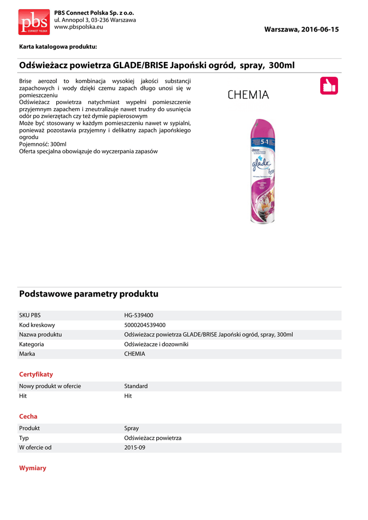 PBS Connect Polska Sp. z o.o. ul. Annopol 3, 03-236 Warszawa www.pbspolska.eu Warszawa, 2016-06-15 Karta katalogowa produktu: Odświeżacz powietrza GLADE/BRISE Japoński ogród, spray, 300ml Brise aerozol to kombinacja wysokiej jakości substancji zapachowych i wody dzięki czemu zapach długo unosi się w pomieszczeniu Odświeżacz powietrza natychmiast wypełni pomieszczenie przyjemnym zapachem i zneutralizuje nawet trudny do usunięcia odór po zwierzętach czy też dymie papierosowym Może być stosowany w każdym pomieszczeniu nawet w sypialni, ponieważ pozostawia przyjemny i delikatny zapach japońskiego ogrodu Pojemność: 300ml Oferta specjalna obowiązuje do wyczerpania zapasów Podstawowe parametry produktu SKU PBS HG-539400 Kod kreskowy 5000204539400 Nazwa produktu Odświeżacz powietrza GLADE/BRISE Japoński ogród, spray, 300ml Kategoria Odświeżacze i dozowniki Marka CHEMIA Certyfikaty Nowy produkt w ofercie Standard Hit Hit Cecha Produkt Spray Typ Odświeżacz powietrza W ofercie od 2015-09 Wymiary PBS Connect Polska Sp. z o.o. ul. Annopol 3, 03-236 Warszawa www.pbspolska.eu Warszawa, 2016-06-15 Karta katalogowa produktu cd. Odświeżacz powietrza GLADE/BRISE Japoński ogród, spray, 300ml Podstawowe parametry produktu Pojemność (ml) 300 Wspólny słownik zamówień CPV 39830000-9 Środki czyszczące Jednostki logistyczne Opakowanie 1 12 szt