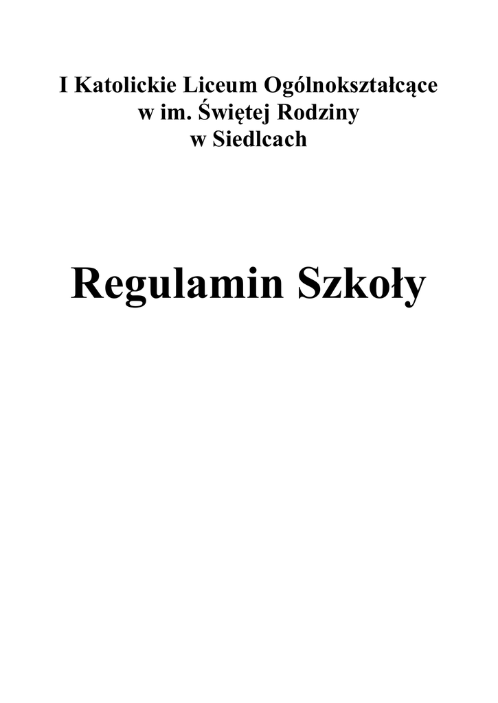 I Katolickie Liceum Ogólnokształcące w im. Świętej Rodziny w Siedlcach Regulamin Szkoły Preambuła I Katolickie Liceum Ogólnokształcące w Siedlcach jest publiczną szkołą katolicką kształcącą oraz wychowującą młodzież zgodnie z chrześcijańskimi i narodowymi tradycjami polskiej i siedleckiej oświaty. Celem i zadaniem szkoły jest wszechstronny rozwój osobowości uczniów na płaszczyźnie wiedzy, odpowiedzialności za dobro wspólne i kultury osobistej. Szkołę wyróżnia katolicki model wychowania, wykorzystujący szczególnie osiągnięcia pedagogiki św. Jana Bosko, oraz współodpowiedzialność wszystkich jej organów za pracę i osiągnięcia edukacyjne i wychowawcze. Dyrekcja wraz z Radą Pedagogiczną I KLO wyznacza oraz koordynuje kierunki i dynamiką pracy szkoły w oparciu o Statut szkoły, wskazania Biskupa Siedleckiego jako Organu Prowadzącego szkołę oraz zarządzenia Ministra Edukacji Narodowej i wskazania Kuratorium Oświaty jako organu sprawującego nadzór pedagogiczny nad szkołą. W tym działaniu może uwzględniać sugestie przedstawione przez Radę Rodziców i Samorząd Uczniowski. Celem niniejszego Regulaminu jest uszczegółowienie Statutu I KLO w Siedlcach w kwestiach kształcenia i postaw uczniów, określając zasady i reguły zachowań uczniów, obowiązujące w społeczności I KLO w Siedlcach. Rozdział I. Tradycje i Ceremoniały § 1. 1. Uczeń ma prawo i obowiązek poznania historii szkoły, sięgającej swymi korzeniami tradycji Gimnazjum Biskupiego w Siedlcach, założonego w 1923 roku i zlikwidowanego przez władze komunistyczne w 1957 roku. 2. Patronem szkoły jest Święta Rodzina z Nazaretu §2. 1. Uczniowie są zobowiązania do szanowania symboli szkoły oraz kultywowania jej tradycji. 2. Ceremoniał szkoły tworzą: 1) Uroczyste rozpoczęcie i zakończenie roku szkolnego 2) Ślubowanie uczniów klas pierwszych 3) Święto Szkoły 4) Studniówka klas maturalnych 5) Pożegnanie klas maturalnych i uroczyste przekazanie sztandaru szkoły przez uczniów klas maturalnych. 3. Uczniowie mają obowiązek uczestniczyć w organizowanych uroczystościach szkolnych, miejskich i kościelnych według kalendarza imprez. Zasady i sposób tego uczestnictwa regulują zarządzenia Dyrektora szkoły. Uczniowie zobowiązani są do podkreślenia obowiązującym strojem galowym następujących świąt państwowych, religijnych i szkolnych: 1) Uroczyste rozpoczęcie roku szkolnego, 2) Dzień Komisji Edukacji Narodowej, 3) Narodowy Dzień Papieski, 4) Narodowe Święto Niepodległości, 2 5) Spotkanie opłatkowe, 6) Spotkanie wielkanocne, 7) Narodowe Święto Trzeciego Maja, 8) Uroczyste pożegnanie klas maturalnych połączone z przekazaniem sztandaru szkoły, 9) Uroczyste zakończenie roku szkolnego, 10) Inną uroczystość lub okoliczność ogłoszoną przez Dyrektora szkoły. § 3. 1. Uczeń ma prawo i obowiązek jako wybrany przedstawiciel reprezentować szkołę w czasie obchodów rocznic, świąt państwowych i oświatowych oraz innych ważniejszych uroczystości 2. Powinnością uczniów oraz ich rodziców (opiekunów prawnych) jest odpowiedzialne włączenie się w działalność promocyjną szkoły na miarę swoich możliwości i zgodnie z zaleceniami Dyrektora szkoły. § 4. Zaszczytnym wyróżnieniem ucznia jest występowanie w poczcie sztandarowym szkoły. Funkcji tej nie mogą pełnić osoby, które otrzymały z zachowania w poprzednim roku szkolnym ocenę poprawną lub niższą. § 5. 1. Wszyscy członkowie społeczności I KLO w Siedlcach powinni angażować się w życie szkoły jako wspólnoty katolickiej poprzez: 1) udział we Mszach świętych szkolnych oraz w dniach uroczystości kościelnych, jeśli wypadają one w dni zajęć szkolnych; 2) udział w modlitwach; 3) udział w uroczystościach o charakterze religijnym; 4) udział w rekolekcjach szkolnych i dniach skupienia; 5) życie według zasad Ewangelii głoszonych przez Kościół katolicki; 6) utożsamianie się ze szkolnym Programem Wychowawczym. 2. Nieobecność ucznia na Mszy świętej szkolnej oraz w czasie rekolekcji i dni skupienia jest równoznaczna z nieobecnością w szkole. 3. Każdy dzień zajęć szkolnych jest rozpoczynany i kończony wspólną modlitwą. Sposób jej przeprowadzenia ustala wychowawca wraz z uczniami w danym oddziale klasowym § 6. Uwzględniając tradycje i charakter szkoły katolickiej wszyscy uczniowie są zobowiązani do uczestnictwa w zajęciach edukacyjnych z religii katolickiej oraz wychowanie do życia w rodzinie. 3 Rozdział II. Kultura bycia i dyscyplina § 7. Uczeń ma obowiązek okazywania szacunku wszystkim nauczycielom, niepedagogicznym pracownikom szkoły, koleżankom i kolegom oraz prawo do poszanowania własnej godności osobistej i kulturalnego traktowania. § 8. Uczeń powinien troszczyć się o właściwie relacje koleżeńskie z innymi uczniami szkoły. § 9. Uczeń powinien być przykładem pełnej kultury i chrześcijańskiej postawy. § 10. Obowiązkiem ucznia jest dbałość o czystość mowy ojczystej. Na terenie szkoły i poza jej obrębem nie wolno używać wulgaryzmów oraz obrażać słowem lub gestem inne osoby. § 11. 1. W szkole uczniów obowiązuje strój będący wyrazem przynależności do społeczności uczniów I KLO. 2. Codzienny strój szkolny oznacza odpowiednio: 1) dla młodzieży męskiej: czarne lub ciemnoszare spodnie, białą koszulę, ciemnogranatowy bezrękawnik z logo szkoły oraz ciemnogranatowy krawat w białe i błękitne pasy; 2) dla młodzieży żeńskiej: czarną lub ciemnoszarą spódnicę standardowego kroju rozmiaru midi, białą koszulę, ciemnogranatowy bezrękawnik z logo szkoły oraz ciemnogranatowy krawat w białe i błękitne pasy. 3. Obowiązujący strój galowy oznacza odpowiednio: 1) dla młodzieży męskiej: garnitur ciemnoszary lub czarny z białą koszulą i krawatem, ewentualnie białą koszulę z krawatem i spodnie koloru ciemnoszarego lub czarnego, oraz pantofle; 2) dla m