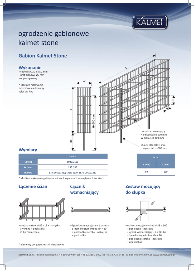 ogrodzenie gabionowe kalmet stone Gabion Kalmet Stone Wykonanie −−ceownik C 20 x 8 x 2 mm −−pręt pionowy Ø5 mm −−ocynk ogniowy * Możliwe malowanie proszkowe na dowolny kolor wg RAL Łącznik wzmacniający Na długości co 500 mm W pionie co 400 mm Słupek 60 x 60 x 3 mm o wysokości H+500 mm Wymiary Gabion L [mm] 1000; 2500 W [mm] 290; 390 H [mm] 810; 1010; 1210; 1410; 1610; 1810; 2010; 2210 Oczko a [mm] b [mm] 50 200 * Możliwe wykonanie gabionów o innych wymiarach zewnętrznych i oczkach Łączenie ścian Łącznik wzmacniający Zestaw mocujący do słupka −−śruba zamkowa M6 x 12 + nakrętka zrywalna + podkładka (1 kpl/połączenie) −−łącznik wzmacniający + 2 x śruba z łbem kulistym imbus M4 x 10 + podkładka szeroka + nakrętka + podkładka −−uchwyt mocujący + śruba M8 x 100 + podkładka + nakrętka - łącznik wzmacniający + 2 x (śruba z łbem kulistym imbus M4 x 10 + podkładka szeroka + nakrętka + podkładka) * elementy połączeń ze stali nierdzewnej Kalmet S.A. ul. Antonio Gaudiego 3, 44-100 Gliwice, tel. +48 32 230 78 97, fax +48 32 775 34 85, [email protected], www.kalmet.com.pl