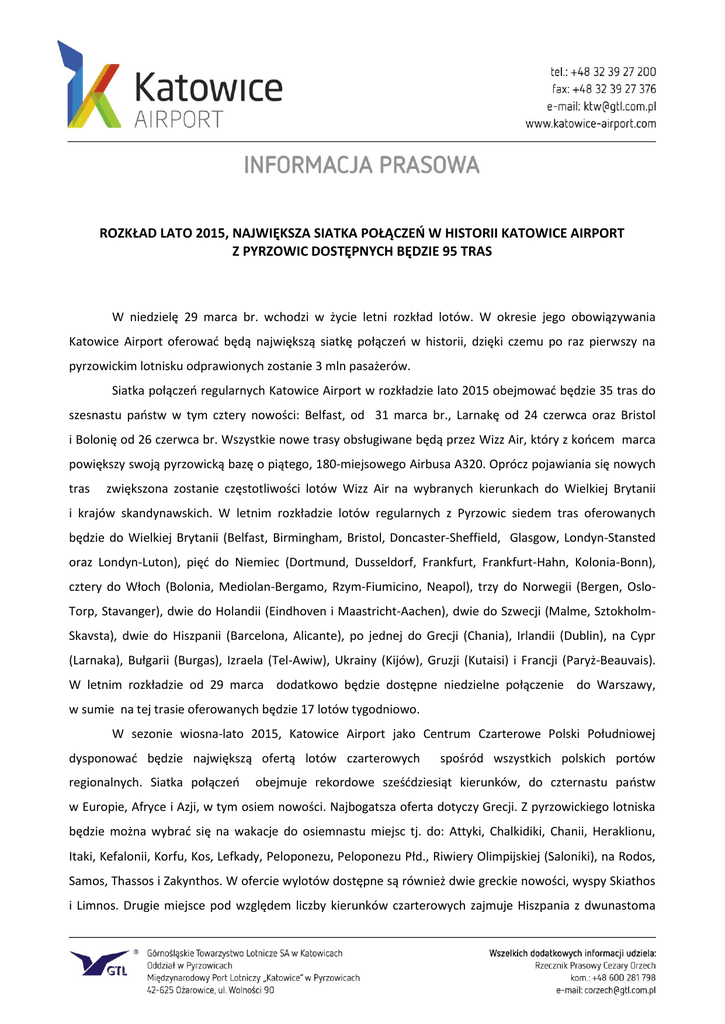 ROZKŁAD LATO 2015, NAJWIĘKSZA SIATKA POŁĄCZEŃ W HISTORII KATOWICE AIRPORT Z PYRZOWIC DOSTĘPNYCH BĘDZIE 95 TRAS W niedzielę 29 marca br. wchodzi w życie letni rozkład lotów. W okresie jego obowiązywania Katowice Airport oferować będą największą siatkę połączeń w historii, dzięki czemu po raz pierwszy na pyrzowickim lotnisku odprawionych zostanie 3 mln pasażerów. Siatka połączeń regularnych Katowice Airport w rozkładzie lato 2015 obejmować będzie 35 tras do szesnastu państw w tym cztery nowości: Belfast, od 31 marca br., Larnakę od 24 czerwca oraz Bristol i Bolonię od 26 czerwca br. Wszystkie nowe trasy obsługiwane będą przez Wizz Air, który z końcem marca powiększy swoją pyrzowicką bazę o piątego, 180-miejsowego Airbusa A320. Oprócz pojawiania się nowych tras zwiększona zostanie częstotliwości lotów Wizz Air na wybranych kierunkach do Wielkiej Brytanii i krajów skandynawskich. W letnim rozkładzie lotów regularnych z Pyrzowic siedem tras oferowanych będzie do Wielkiej Brytanii (Belfast, Birmingham, Bristol, Doncaster-Sheffield, Glasgow, Londyn-Stansted oraz Londyn-Luton), pięć do Niemiec (Dortmund, Dusseldorf, Frankfurt, Frankfurt-Hahn, Kolonia-Bonn), cztery do Włoch (Bolonia, Mediolan-Bergamo, Rzym-Fiumicino, Neapol), trzy do Norwegii (Bergen, OsloTorp, Stavanger), dwie do Holandii (Eindhoven i Maastricht-Aachen), dwie do Szwecji (Malme, SztokholmSkavsta), dwie do Hiszpanii (Barcelona, Alicante), po jednej do Grecji (Chania), Irlandii (Dublin), na Cypr (Larnaka), Bułgarii (Burgas), Izraela (Tel-Awiw), Ukrainy (Kijów), Gruzji (Kutaisi) i Francji (Paryż-Beauvais). W letnim rozkładzie od 29 marca dodatkowo będzie dostępne niedzielne połączenie do Warszawy, w sumie na tej trasie oferowanych będzie 17 lotów tygodniowo. W sezonie wiosna-lato 2015, Katowice Airport jako Centrum Czarterowe Polski Południowej dysponować będzie największą ofertą lotów czarterowych regionalnych. Siatka połączeń spośród wszystkich polskich portów obejmuje rekordowe sześćdziesiąt kierunków, do czternastu państw w Europie, Afryce i Azji, w tym osiem nowości. Najbogatsza oferta dotyczy Grecji. Z pyrzowickiego lotniska będzie można wybrać się na wakacje do osiemnastu miejsc tj. do: Attyki, Chalkidiki, Chanii, Heraklionu, Itaki, Kefalonii, Korfu, Kos, Lefkady, Peloponezu, Peloponezu Płd., Riwiery Olimpijskiej (Saloniki), na Rodos, Samos, Thassos i Zakynthos. W ofercie wylotów dostępne są również dwie greckie nowości, wyspy Skiathos i Limnos. Drugie miejsce pod względem liczby kierunków czarterowych zajmuje Hiszpania z dwunastoma trasami. Można wśród nich znaleźć te na kontynentalną część tego państwa (Almeria - nowość, Costa Blanca Costa Brava, Costa Dorada, Malaga), jak i na Wyspy Kanaryjskie (Fuerteventura, Gran Canaria, La Gomera – nowość, Lanzarote i Teneryfą) oraz na hiszpańskie wyspy basenu Morza Śródziemnego (Majorka i Ibiza). Wybierający się na wypoczynek do Egiptu mają do wyboru najpopularniejsze kurorty tj. Hurghadę, Marsę Alam, Sharm El Sheikh i Tabę oraz tegoroczną nowość Marsę Matruh. Wakacje w cieszącej się od lat niezmienną popularnością Turcji, dostępne są z wylotem z Katowice Airport do czterech najważniejszych i największych tamtejszych kurortów tj. do Antalyi, Bodrum, Dalamanu i Izmiru. Tegoroczne włoskie kierunki wakacyjne z Pyrzowic to Kalabria, Lamezia Terme, Olbia i Katania (nowość). Po trzy trasy dostępne są do Tunezji (Djerba, Enfidha i Monastyr) oraz na Cypr (Ercan, Pafos i tegoroczna nowość – Larnaka). Do Bułgarii będzie się można dostać na wypoczynek poprzez Warnę i Burgas. Ciekawa oferta z Pyrzowic to coraz bardziej popularna wśród turystów Albania, w tym roku do wyboru jest Saranda lub okolice Tirany (nowość). Portugalia to już tradycyjnie Faro i Madera. Ponadto po jednej wakacyjnej trasie dostępne jest do Gruzji (Batumi), Chorwacji (Dubrownik), Czarnogóry (Podgorica), Izraela (Tel Awiw), oraz Maroka (Agadir). Najbogatsza w historii pyrzowickiego lotniska siatka połączeń regularnych i czarterowych, powiększenie bazy linii lotniczej Wizz Air, oraz optymistyczne prognozy dotyczące ruchu czarterowego, pozwalają prognozować, że w tym roku po raz pierwszy w Katowice Airport odprawionych zostanie 3 mln podróżnych. W tym roku w Katowice Airport zakończą się liczne inwestycje, które pozwolę podnieść standard obsługi pasażerów oraz linii lotniczych. 28 maja br. do użytku zostanie oddana nowa droga startowa o długości 3 200 metrów. W czerwcu br. zakończy się budowa płyty do odladzania statków powietrznych oraz nowej płyty dla samolotów cargo. Na początku wakacji pierwsi pasażerowie skorzystają z nowego terminalu przylotowego. W III kwartale br. rozpocznie się rozbudowa hali odlotów w terminalu A, która zostanie dwukrotnie powiększona o powierzchnie uwolnione po przeniesieniu przylotów z tego obiektu do nowego terminalu. W Katowice Airport trwa także budowa nowego terminalu cargo. Inwestycja realizowana w południowo-wschodniej części lotniska zakończy się w II kwartale 2016 roku.