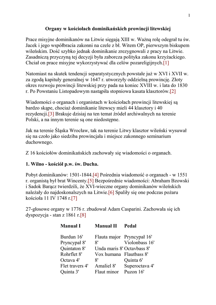 1 Organy w kościołach dominikańskich prowincji litewskiej Prace misyjne dominikanów na Litwie sięgają XIII w. Ważną rolę odegrał tu św. Jacek i jego współbracia zakonni na czele z bł. Witem OP, pierwszym biskupem wileńskim. Dość szybko jednak dominikanie zrezygnowali z pracy na Litwie. Zasadniczą przyczyną tej decyzji była zaborcza polityka zakonu krzyżackiego. Chciał on prace misyjne wykorzystywać dla celów pozareligijnych.[1] Natomiast na skutek tendencji separatystycznych powstałe już w XVI i XVII w. za zgodą kapituły generalnej w 1647 r. utworzyły oddzielną prowincję. Złoty okres rozwoju prowincji litewskiej przy pada na koniec XVIII w. i lata do 1830 r. Po Powstaniu Listopadowym nastąpiła stopniowa kasata klasztorów.[2] Wiadomości o organach i organistach w kościołach prowincji litewskiej są bardzo skąpe, chociaż dominikanie litewscy mieli 44 klasztory i 40 rezydencji.[3] Brakuje dzisiaj na ten temat źródeł archiwalnych na terenie Polski, a na innym terenie są one niedostępne. Jak na terenie Śląska Wrocław, tak na terenie Litwy klasztor wileński wysuwał się na czoło jako siedziba prowincjała i miejsce zakonnego seminarium duchownego. Z 16 kościołów dominikańskich zachowały się wiadomości o organach. 1. Wilno - kościół p.w. św. Ducha. Pobyt dominikanów: 1501-1844.[4] Pośrednia wiadomość o organach - w 1551 r. organistą był brat Wincenty.[5] Bezpośrednie wiadomości: Abraham Bzowski i Sadok Barącz twierdzili, że XVI-wieczne organy dominikanów wileńskich należały do najdoskonalszych na Litwie.[6] Spaliły się one podczas pożaru kościoła 11 IV 1748 r.[7] 27-głosowe organy w 1776 r. zbudował Adam Casparini. Zachowała się ich dyspozycja - stan z 1861 r.[8] Manuał I Manuał II Pedał Burdun 16' Pryncypał 8' Quintaton 8' Rohrflet 8' Octava 4' Flet travers 4' Quinta 3' Flauta major Pryncypał 16' 8' Violonbass 16' Unda maris 8' Octavbass 8' Vox humana Flautbass 8' 8' Quinta 6' Amaliel 8' Superoctava 4' Flaut minor Puzon 16' 2 Superoctava 2' Flassflet 2' Tercja 2' Mixtura 5x Trompet 8' 4' Jula 4' Waldflet 2' Mixtura 4x Campanae Trompet 4' 2. Agłona - kościół p.w. N.M.P. Pobyt dominikanów: 1751-1891.[9] Pośrednia wiadomość o organach - przed pożarem w 1768 r. kościół miał "większy, do wybornych należących organ". Po pożarze wybudowano 12-głosowe organy.[10] 3. Debreczyn - kościół p.w. N.M.P. Pobyt dominikanów: 1618-1869.[11] Pośrednia wiadomość o organach - w 1688 r. organistą był o. Onufry Sawiński.[12] 4. Jelna - kościół p.w. Matki Boskiej Różańcowej. Pobyt dominikanów: od 2 poł. XVII w. do 1832 r.[13] Pośrednia wiadomość o organach - od 1722 r. organistą był brat Franciszek Purszczałowicz.[14] 5. Kalwaria Żmudzka - kościół p.w. św. Jana Chrzciciela. Pobyt dominikanów: 1644-1889.[15] Pośrednia wiadomość o organach - od 1674 r. organistą był br. Jordan Szpikul.[16] Bezpośrednia wiadomość o organach - Inwentarz kościoła z lat 1792-1852 podaje, że na chórze znajdował się pozytyw o 13 głosach "snycerską sztuką i malarską przyozdobiony".[17] 6. Krasnybór k/Sejn - kościół p.w. św. Katarzyny Sieneńskiej. Pobyt dominikanów: 1684-1820.[18] Pośrednia wiadomość o organach - od 1698 r. organistą był o. Leo Andrzejkiewicz.[19] 7. Nieśwież - kościół p.w. św. Jana Chrzciciela. Pobyt dominikanów: od 1672 do około 1873 r.[20] Pośrednia wiadomość o organach - katalog dominikanów z lat 1818/19 wymienia organistę br. Romualda Każewicza.[21] 8. Orsza - kościół p.w. św. Aniołów Stróżów. 3 Pobyt dominikanów: 1649-1832.[22] Pośrednia wiadomość o organach - od 1774 do 1816 r. organistą był tercjarz dominikański Leo Bohdanowicz.[23] 9. Ostrowiec Litewski - kościół p.w. św. Kosmy i Damiana. Pobyt dominikanów: 1474-1869.[24] Pośrednia wiadomość - od 1679 r. organistą był o. Innocenty Różycki, a od 1693 r. o. Kazimierz Jaśkiewicz.[25] 10. Połock - kościół p.w. św. Dominika. Pobyt dominikanów: 1671-1865.[26] Pośrednia wiadomość - w 1835 r. organistą był tutaj brat Krzysztof Butkiewicz.[27] 11. Rosienie - kościół p.w. Wniebowzięcia N.M.P. Pobyt dominikanów: 1664-1886.[28] Pośrednia wiadomość - do 1661 r. organistą był tu o. Rafał Trembicki.[29] 12. Różanystok - kościół p.w. Ofiarowania N.M.P. Pobyt dominikanów: 1661-1844.[30] Bezpośrednia wiadomość: zdaniem Wołyniaka w 1785 r. wybudowano 35-głosowe organy.[31] Natomiast według J. Gołosa w latach 1794-1842 istniały organy o 36 głosach. Budowniczym tych organów miałbyć Mikołaj Janson lub Casparini.[32] 13. Sejny - kościół p.w. św. Jerzego. Pobyt dominikanów: 1603-1804.[33] Pośrednia wiadomość - około poł. XVII w. organistą był br. Mikołaj, który pochodził z Lublina.[34] Bezpośrednia wiadomość - w 1757 r. zmarł w Leszkowie o. Remigiusz Śmiarowski. Z jego posagu, 40 tys., przeznaczono na budowę organów w Sejnach.[35] Był to prawdopodobnie tylko pozytyw, skoro Inwentarz z 1870 r. podawał, że w kościele jest "mały organik na galeryice chóru."[36] Organy po 1907 r. Zdaniem J. Gołosa organy w Sejnach rozbudował litewski organmistrz Jonas Goralevicius. Miały one 28 głosów rozmieszczonych w dwu manuałach i pedale. Obecnie istniejący istniejący instrument jest efektem remontu i powiększenia przez firmę Z. Kamińskiego.[37] 14. Werki k/Wilna - kościół p.w. Znalezienia Krzyża św. Pobyt dominikanów: 1669-1850.[38] Pośrednia wiadomość - od 1776 r. pracował tu jako organista Patrycy Sokołowski, dominikański tercjarz.[39] 4 Bezpośrednia wiadomość - podczas pożaru w 1812 r. spaliły się organy. Następny instrument został zbudowany około połowy XIX w., ponieważ Inwentarz kościoła z 1857 r. wymienia 8-głosowe organy o dużych walorach muzycznych i plastycznych.[40] 15. Witebsk - kościół p.w. św. Michała. Pobyt dominikanów: 1640-1832.[41] Pośrednia wiadomość - w 1692 r. organi