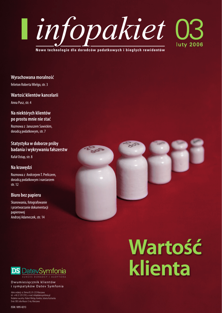 infopakiet 03 03, 02-2006 luty 20 06 Nowe technologie dla doradców podatkowych i biegłych rewidentów Wyrachowana moralność felieton Roberta Wielgo, str. 3 Wartość klientów kancelarii Anna Pusz, str. 4 Na niektórych klientów po prostu mnie nie stać Rozmowa z Januszem Sawickim, doradcą podatkowym, str. 7 Statystyka w doborze próby badania i wykrywaniu fałszerstw Rafał Ostap, str. 8 Na krawędzi Rozmowa z Andrzejem T. Preliczem, doradcą podatkowym i narciarzem str. 12 Biuro bez papieru Skanowania, fotografowanie i przetwarzanie dokumentacji papierowej Andrzej Adameczek, str. 14 Dwumiesięcznik klientów i sympatyków Datev Symfonia Adres redakcji: ul. Bema 83, 01-233 Warszawa tel. +48 22 329 2393, e-mail: [email protected] Redaktor naczelny: Robert Wielgo, Korekta: Jolanta Kucharska Druk: EBE Lidia Mazur i S-ka, Warszawa ISSN: 1895-0213 Wartość klienta Vademecum doradcy podatkowego i biegłego rewidenta 2006 EDYTORIAL 03, 02-2006 Wyrachowana moralność Zapewne każdy z nas, czasem opierając się na precyzyjnych danych, a częściej intuicyjnie, odnosił wrażenie, że obsługa niektórych klientów nie jest dla kancelarii rentowna. Na utrzymanie biura, pensje dla pracowników i wynagrodzenie właściciela pieniądze przecież trzeba skądś wziąć. Skąd? Od rentownych klientów. Czy jest to wobec nich sprawiedliwe? Gdyby nie nasza lekka ręka, faktury im wystawiane mogłyby być niższe. Czy ktoś pytał ich o chęć sponsorowania nierentownych kolegów? To w końcu oni za wolontariat doradcy podatkowego płacą. Dopuszczanie do nieświadomego obsługiwania klientów, którzy przynoszą straty, może być niesprawiedliwe wobec pozostałych. W życiu wszystko jest trochę bardziej skomplikowane niż w teorii. Między czernią a bielą jest jeszcze mnóstwo miejsca na odcienie szarości. Korzyści płynących z obsługi klientów nie można rozpatrywać wyłącznie w kategoriach otrzymanego w zamian honorarium. Przecież względy sympatii czy nawet przyjaźni wobec klienta mogą mieć kolosalny wpływ na wysokość ustalonej ceny za świadczone usługi. Niekiedy w grę wchodzi chęć udzielenia pomocy przedsiębiorcy... Nie! Człowiekowi, który znalazł się w potrzebie. Właśnie! Wielu z nas wykonywany przez siebie zawód traktuje jako misję. Idealizm, materializm, proza życia... Doradca podatkowy czy biegły rewident, kierując kancelarią, jest menedżerem, który powinien dbać o stabilny rozwój kierowanego przez siebie przedsiębiorstwa, o bezpieczeństwo zatrudnionych ludzi. Musi więc znaleźć kompromis między przyjaźnią, misją i działalnością komercyjną. Chcąc rzetelnie ustalić honorarium, zarządzający kancelarią musi pogodzić dość oczywiste czynniki obiektywne z często nie mniej istotnymi względami subiektywnymi, takimi jak sympatia czy przyjaźń. Jak wszystkie te czynniki zamienić na liczby, by obliczyć wynagrodzenie uczciwe wobec samego siebie, pracowników i innych klientów? Vademecum jest unikalnym kompendium aktualnej wiedzy z zakresu podatków, rachunkowości oraz innych dziedzin prawa i ekonomii. Zawiera praktyczne informacje potrzebne podczas wykonywania zawodu doradcy podatkowego i biegłego rewidenta. Na 500 stronach biblijnego papieru praktycy zebrali najważniejsze zagadnienia i hasła poświęcone problematyce podatkowej i audytingowi, ubezpieczeniom społecznym, unijnym regulacjom podatkowym i matematyce finansowej z odniesieniami do odpowiednich ustaw. Wewnątrz infopakietu znajduje się formularz z zamówieniem na bezpłatny egzemplarz Vademecum dla każdego doradcy podatkowego i biegłego rewidenta, który ukaże się na początku marca 2006 roku. Datev Symfonia Sp. z o.o. ul. Bema 83, 01-233 Warszawa, tel.: (22) 329 2393 http://www.datevsymfonia.pl W pierwszym artykule Anna Pusz zajęła się właśnie sposobami kompleksowej oceny wartości klientów kancelarii. Dobrym uzupełnieniem tego artykułu jest wywiad z Januszem Sawickim – doradcą podatkowym, który od pewnego czasu wylicza rentowność świadczonych w swojej kancelarii zleceń. W dalszej części infopakietu Rafał Ostap pokazuje, w jaki sposób matematyka i statystyka mogą pomóc w doborze próby badania sprawozdania finansowego i wykrywaniu fałszerstw. W rubryce „Po godzinach” Andrzej Prelicz spróbuje zarazić nas bakcylem narciarstwa zjazdowego. Na koniec Andrzej Adameczek w artykule „Biuro bez papieru” bacznie przyjrzy się sposobom zamiany stert papierowych dokumentów w postać elektroniczną. Korzystając z okazji, życzę Państwu pomyślności i spełnienia wszystkich planów w 2006 roku. Jednocześnie pragnę wszystkim naszym Klientom serdecznie podziękować za zaufanie, którym nas obdarzyliście. Dziękujemy. To był dobry rok. Zapraszam do lektury. Robert Wielgo dyrektor ds. sprzedaży [email protected] TEMAT NUMERU Wartość klientów kancelarii Anna Pusz Klient głównym kapitałem firmy Rentowność świadczonych usług i satysfakcja klientów zwykle przekładają się wprost na zysk kancelarii. Zadowoleni klienci są cennym zasobem, a w wielu przypadkach podstawowym kapitałem firmy. Strategiczne ukierunkowanie na klienta nie oznacza oczywiście, że tracimy z oczu podstawowy cel komercyjnie działającej kancelarii, jakim jest osiąganie zysku w kategoriach finansowych. Wynik finansowy ściśle związany jest bowiem właśnie z klientem. Podstawą do wyznaczania wartości firm jest dziś, obok wartości księgowej, wartość portfela klientów. Jaką wartość mają wasi klienci? Klienci, z jednej strony, mają różne potrzeby i wymagania, z drugiej – ich wartość i potencjał z punktu widzenia obsługującej ich kancelarii zwykle także się różni. Większość przedsiębiorstw posiada w swoim portfelu również klientów przynoszących straty. Nie oznacza to oczywiście, że należy ich bezwzględnie wyeliminować z naszego portfela. Być może jest sposób, aby z punktu widzenia kancelarii stali się rentowni. Podst