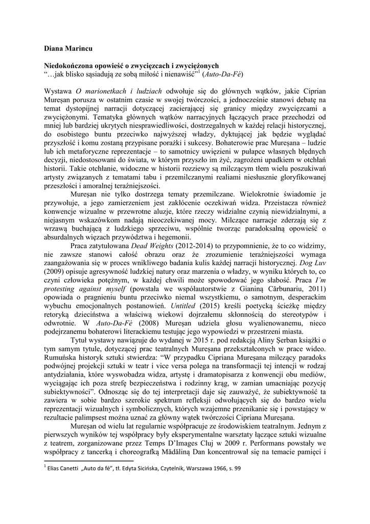 Diana Marincu Niedokończona opowieść o zwycięzcach i zwyciężonych “…jak blisko sąsiadują ze sobą miłość i nienawiść”1 (Auto-Da-Fé) Wystawa O marionetkach i ludziach odwołuje się do głównych wątków, jakie Ciprian Mureșan porusza w ostatnim czasie w swojej twórczości, a jednocześnie stanowi debatę na temat dystopijnej narracji dotyczącej zacierającej się granicy między zwycięzcami a zwyciężonymi. Tematyka głównych wątków narracyjnych łączących prace przechodzi od mniej lub bardziej ukrytych niesprawiedliwości, dostrzegalnych w każdej relacji historycznej, do osobistego buntu przeciwko najwyższej władzy, dyktującej jak będzie wyglądać przyszłość i komu zostaną przypisane porażki i sukcesy. Bohaterowie prac Mureșana – ludzie lub ich metaforyczne reprezentacje – to samotnicy uwięzieni w pułapce własnych błędnych decyzji, niedostosowani do świata, w którym przyszło im żyć, zagrożeni upadkiem w otchłań historii. Takie otchłanie, widoczne w historii rozziewy są milczącym tłem wielu poszukiwań artysty związanych z tematami tabu i przemilczanymi realiami niesłusznie gloryfikowanej przeszłości i amoralnej teraźniejszości. Mureșan nie tylko dostrzega tematy przemilczane. Wielokrotnie świadomie je przywołuje, a jego zamierzeniem jest zakłócenie oczekiwań widza. Przeistacza również konwencje wizualne w przewrotne aluzje, które rzeczy widzialne czynią niewidzialnymi, a niejasnym wskazówkom nadają nieoczekiwanej mocy. Milczące narracje zderzają się z wrzawą buchającą z ludzkiego sprzeciwu, wspólnie tworząc paradoksalną opowieść o absurdalnych więzach przywództwa i hegemonii. Praca zatytułowana Dead Weights (2012-2014) to przypomnienie, że to co widzimy, nie zawsze stanowi całość obrazu oraz że zrozumienie teraźniejszości wymaga zaangażowania się w proces wnikliwego badania kulis każdej narracji historycznej. Dog Luv (2009) opisuje agresywność ludzkiej natury oraz marzenia o władzy, w wyniku których to, co czyni człowieka potężnym, w każdej chwili może spowodować jego słabość. Praca I’m protesting against myself (powstała we współautorstwie z Gianiną Cărbunariu, 2011) opowiada o pragnieniu buntu przeciwko niemal wszystkiemu, o samotnym, desperackim wybuchu emocjonalnych postanowień. Untitled (2015) kreśli poetycką ścieżkę między retoryką dzieciństwa a właściwą wiekowi dojrzałemu skłonnością do stereotypów i odwrotnie. W Auto-Da-Fé (2008) Mureșan udziela głosu wyalienowanemu, nieco podejrzanemu bohaterowi literackiemu testując jego wypowiedzi w przestrzeni miasta. Tytuł wystawy nawiązuje do wydanej w 2015 r. pod redakcją Aliny Șerban książki o tym samym tytule, dotyczącej prac teatralnych Mureșana przekształconych w prace wideo. Rumuńska historyk sztuki stwierdza: “W przypadku Cipriana Mureșana milczący paradoks podwójnej projekcji sztuki w teatr i vice versa polega na transformacji tej intencji w rodzaj antydziałania, które wyswobadza widza, artystę i dramatopisarza z konwencji obu mediów, wyciągając ich poza strefę bezpieczeństwa i rodzinny krąg, w zamian umacniając pozycję subiektywności”. Odnosząc się do tej interpretacji daje się zauważyć, że subiektywność ta zawiera w sobie bardzo szerokie spektrum refleksji odwołujących się do bardzo wielu reprezentacji wizualnych i symbolicznych, których wzajemne przenikanie się i powstający w rezultacie palimpsest można uznać za główny wątek twórczości Cipriana Mureșana. Mureșan od wielu lat regularnie współpracuje ze środowiskiem teatralnym. Jednym z pierwszych wyników tej współpracy były eksperymentalne warsztaty łączące sztuki wizualne z teatrem, zorganizowane przez Temps D’Images Cluj w 2009 r. Performans powstały we współpracy z tancerką i choreografką Mădăliną Dan koncentrował się na temacie pamięci i 1 Elias Canetti „Auto da fé”, tł. Edyta Sicińska, Czytelnik, Warszawa 1966, s. 99 zapomnienia. Dotyczył on postaci zapomnianego aktora i pisarza Dominika Stanki. Celem tego przedsięwzięcia było testowanie granic dyscyplin sztuki. Efemeryczny charakter podkreślały działania, gesty Mureșana i Dan, którzy odziani w żółte płaszcze usuwali ze ściany napis, przewijający się bez końca dzięki kolejnemu nienamacalnemu medium: projekcji wideo. Podwójny performans Untitled (2012) to wynik współpracy Cipriana Mureșana z dwoma reżyserami teatralnymi. Każdy z nich został poproszony o inscenizowanie innej sztuki; dwa przedstawienia zostały odegrane jednocześnie na tej samej scenie, nakładając się na siebie. Pokazane na wystawie prace wideo: Dog Luv, I’m protesting against myself oraz Untitled 2015, można odczytać w tym samym kontekście, ponieważ fundamentem każdego z nich jest performans, ściśle powiązany ze specyfiką przedstawienia teatralnego, nawet jeśli zakreśla ona jedynie granice, które przekracza artysta. Dog Luv oraz I’m protesting… były prezentowane jako sfilmowane przedstawienia lalkowe, natomiast Untitled 2015 występuje równoległe w dwóch wersjach: przedstawienia na żywo oraz niezależnego wideo. Wszystkie te prace łączy nie tylko struktura nawiązująca do teatru oraz wykorzystanie marionetek jako narzędzia narracji, ale – wracając do postaci bohatera heroicznego – niezdolność tego bohatera do doprowadzenia swych działań do końca, pewna niemożność osiągnięcia pełnego potencjału swoich działań. We wszystkich trzech przypadkach katalizującej sile, jaka zdaje się charakteryzować ten typ bohatera, przeszkadza duża wrażliwość tworząca wyrwę w spójności narracyjnej. Mad Dog traci wiarygodność jako przywódca; protestująca człekokształtna marionetka chowa się w kuble na śmieci; lalki, które wyrażają się jak dzieci, rozprasza otaczająca je rzeczywistość. Praca Dog Luv, po raz pierwszy pokazana w Pawilonie Rumuńskim na Biennale w