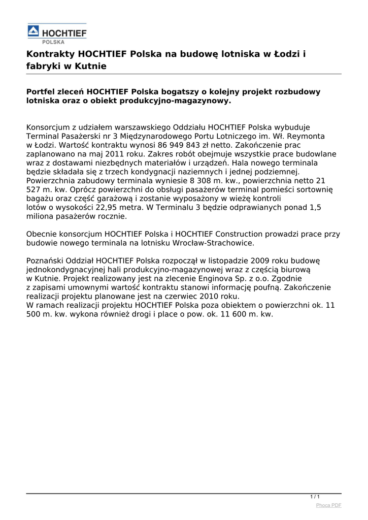 Kontrakty HOCHTIEF Polska na budowę lotniska w Łodzi i fabryki w Kutnie Portfel zleceń HOCHTIEF Polska bogatszy o kolejny projekt rozbudowy lotniska oraz o obiekt produkcyjno-magazynowy. Konsorcjum z udziałem warszawskiego Oddziału HOCHTIEF Polska wybuduje Terminal Pasażerski nr 3 Międzynarodowego Portu Lotniczego im. Wł. Reymonta w Łodzi. Wartość kontraktu wynosi 86 949 843 zł netto. Zakończenie prac zaplanowano na maj 2011 roku. Zakres robót obejmuje wszystkie prace budowlane wraz z dostawami niezbędnych materiałów i urządzeń. Hala nowego terminala będzie składała się z trzech kondygnacji naziemnych i jednej podziemnej. Powierzchnia zabudowy terminala wyniesie 8 308 m. kw., powierzchnia netto 21 527 m. kw. Oprócz powierzchni do obsługi pasażerów terminal pomieści sortownię bagażu oraz część garażową i zostanie wyposażony w wieżę kontroli lotów o wysokości 22,95 metra. W Terminalu 3 będzie odprawianych ponad 1,5 miliona pasażerów rocznie. Obecnie konsorcjum HOCHTIEF Polska i HOCHTIEF Construction prowadzi prace przy budowie nowego terminala na lotnisku Wrocław-Strachowice. Poznański Oddział HOCHTIEF Polska rozpoczął w listopadzie 2009 roku budowę jednokondygnacyjnej hali produkcyjno-magazynowej wraz z częścią biurową w Kutnie. Projekt realizowany jest na zlecenie Enginova Sp. z o.o. Zgodnie z zapisami umownymi wartość kontraktu stanowi informację poufną. Zakończenie realizacji projektu planowane jest na czerwiec 2010 roku. W ramach realizacji projektu HOCHTIEF Polska poza obiektem o powierzchni ok. 11 500 m. kw. wykona również drogi i place o pow. ok. 11 600 m. kw. 1/1 Phoca PDF Powered by TCPDF (www.tcpdf.org)