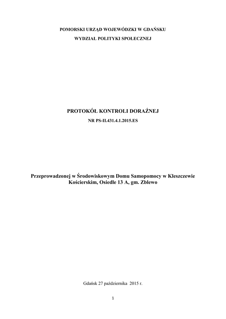 POMORSKI URZĄD WOJEWÓDZKI W GDAŃSKU WYDZIAŁ POLITYKI SPOŁECZNEJ PROTOKÓŁ KONTROLI DORAŹNEJ NR PS-II.431.4.1.2015.ES Przeprowadzonej w Środowiskowym Domu Samopomocy w Kleszczewie Kościerskim, Osiedle 13 A, gm. Zblewo Gdańsk 27 października 2015 r. 1 I. Warunki organizacji kontroli Jednostka kontrolowana; Kontrolę przeprowadzono w Środowiskowym Domu Samopomocy (ŚDS) w Kleszczewie Kościerskim (ul. Osiedle 13A), który funkcjonuje jako jednostka organizacyjna Gminnego Ośrodka Pomocy Społecznej (GOPS) w Zblewie w tymczasowej siedzibie ośrodka. Kierownik GOPS Zblewo i ŚDS w Kleszczewie Kościerskim : - Anna Wojak Jednostka kontrolująca: Kontrolę prowadził Zespół Inspektorów Wydziału Polityki Społecznej Pomorskiego Urzędu Wojewódzkiego w Gdańsku w składzie: - Ewa Szczypior – starszy inspektor wojewódzki - kierująca zespołem inspektorów upoważnienie nr 313/2015 (PS-II.0030.19.2015.ES) z dnia 22 października 2015 r. , - Małgorzata Szady – starszy inspektor wojewódzki - upoważnienie nr 312/2015 (PS-II.0030.19.2015.ES) z dnia 22 października 2015 r. , - Aneta Onichowska – inspektor wojewódzki – upoważnienie nr 314/2015 (PS-II.0030.19.2015.ES) z dnia 22 października 2015 r. , Termin kontroli: Kontrolę przeprowadzono w trybie doraźnym w dniu 27 października 2015 r. Okres podlegający kontroli: od 18 sierpnia 2014 r. (przejęcie zadania polegającym na prowadzeniu ŚDS w Kleszczewie Kosierskim przez GOPS Zblewo) do 27 października 2015 r. Podstawy prawne przeprowadzonej kontroli: Ustawa z dnia 23 stycznia 2009r o wojewodzie i administracji rządowej w województwie (t. j. Dz. U. z 2015 r. poz.525 z późn. zm.) Ustawa z dnia 12 marca 2004r o pomocy społecznej (t.j. Dz. U. z 2015 poz. 163 z późn. zm.) Ustawa z dnia 19 sierpnia 1994r o ochronie zdrowia psychicznego (Dz. U z 2011 r. Nr 231, poz. 1375 z późn. zm.) Rozporządzenie Ministra Pracy i Polityki Społecznej z dnia 9 grudnia 2010 r. w sprawie środowiskowych domów samopomocy (Dz. U. z 2010r Nr 238, poz. 1586) Rozporządzenie Ministra Polityki Społecznej z dnia 23 marca 2005r. w sprawie nadzoru i kontroli w pomocy społecznej (Dz. U. Nr 61, poz. 543 z późn. zm.) Zakres kontroli doraźnej: Ocena prawidłowości działań w zakresie wsparcia osób z zaburzeniami psychicznymi realizowanych przez Gminę Zblewo w ramach funkcjonowania Środowiskowego Domu Samopomocy w Kleszczewie Kościerskim – w związku ze skargą Przewodniczącego Stowarzyszenia Osób Niepełnosprawnych „POGODA” na niewłaściwy sposób prowadzenia ŚDS po zmianie realizatora zadania (przejęcie zadania przez GOPS Zblewo). Osoby udzielające wyjaśnień: Kierownik GOPS Zblewo – Pani Anna Wojak, Wójt Gminy Zblewo – Pan Artur Herold, 2 Przedstawiciele rodziców/opiekunów osób objętych wsparciem w ramach działalności ŚDS w Kleszczewie Kościerskim: - Pani Danuta Gościńska, - Pan Andrzej Barcikowski - Przewodniczący nowopowstałego Stowarzyszenia „Uśmiechnij się” w Kleszczewie Kościerskim, wspierającego działalność ŚDS, - Pan Edward Zalewski, Pracownicy ŚDS Kleszczewo Kościerskie wraz z Koordynatorem – Panią Darią Kuchtą Przed przystąpieniem do czynności kontrolnych dokonano wpisu do zeszytu kontroli GOPS w Zblewie oraz poinformowano kierownika GOPS o prawie odmowy podpisania protokołu i obowiązku złożenia na piśmie do Dyrektora Wydziału Polityki Społecznej Pomorskiego Urzędu Wojewódzkiego w Gdańsku, w terminie 7 dni od dnia otrzymania protokołu, wyjaśnień przyczyn tej odmowy oraz umotywowanych zastrzeżeń, dotyczących ustaleń zwartych w protokole. W przypadku zgłoszenia zastrzeżeń do protokołu, o których mowa powyżej, termin odmowy podpisania protokołu wraz z podaniem jej przyczyn biegnie od dnia doręczenia stanowiska Dyrektora Wydziału Polityki Społecznej wobec zastrzeżeń. Odmowa podpisania protokołu kontroli nie stanowi przeszkody do podpisania protokołu przez zespół inspektorów i sporządzenia zaleceń pokontrolnych (§ 16 Rozporządzenia Ministra Polityki Społecznej z dnia 23 marca 2005r w sprawie nadzoru i kontroli w pomocy społecznej (Dz. U. z 2005 r. Nr 61 poz. 543 z późn. zm.). II. Podstawa do ustaleń kontroli: Ustaleń do protokołu dokonano na podstawie: oględzin placówki, miejsca realizacji zadania ( w tym pomieszczenia, w których obecnie odbywają się zajęcia, jak i pomieszczenia odzyskane przez Gminę Zblewo w wyniku egzekucji komorniczej od Stowarzyszenia „POGODA” - główne i docelowe miejsce funkcjonowania ŚDS), wyjaśnień udzielonych przez osoby reprezentujące podmiot prowadzący i kierownictwo kontrolowanego ośrodka oraz pracowników, wyjaśnień udzielonych przez rodziców/opiekunów osób uczestniczących w zajęciach ŚDS, wglądu w dokumenty merytoryczne, dotyczące zrealizowanych zadań (uchwały, statut, regulamin, plan i program działalności Domu, dokumentacja indywidualna i zbiorowa uczestników), wglądu w dokumenty dotyczące zmiany podmiotu prowadzącego ŚDS oraz dokonanej przez komornika egzekucji wydania lokalu Gminie Zblewo zgodnie z Postanowieniem Sądu Rejonowego w Starogardzie Gdańskim, III. Ustalenia kontrolne: Formalne podstawy funkcjonowania ŚDS w okresie podlegającym kontroli. Środowiskowy Dom Samopomocy (ŚDS) w Kleszczewie Kościerskim funkcjonuje od 2002 r. i jest placówką wsparcia dziennego typu A, B i C. Do 13.08.2014 r. Dom był prowadzony przez Stowarzyszenie Osób Niepełnosprawnych „POGODA” w Kleszczewie Kościerskim jako zadanie powierzone temu podmiotowi przez Gminę Zblewo. Z dniem 13.08.2014 r. Gmina Zblewo rozwiązuje umowę ze Stowarzyszeniem (ze skutkiem 3 natychmiastowym) na realizację ww. zadania. Powodem tej decyzji było nienależyte wykonywanie postanowień umowy polegające na niewłaściwym wykorzystywaniu przekazywanych środków finansowych oraz działaniu na szkodę podopiecznych ŚDS (zastraszanie, naruszanie godności osobistej) – w załączeniu kse