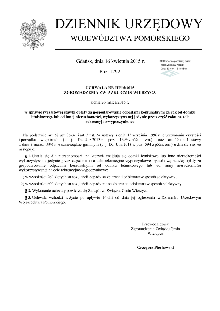 DZIENNIK URZĘDOWY WOJEWÓDZTWA POMORSKIEGO Gdańsk, dnia 16 kwietnia 2015 r. Elektronicznie podpisany przez: Jacek Zbigniew Karpiński Data: 2015-04-16 14:48:01 Poz. 1292 UCHWAŁA NR III/15/2015 ZGROMADZENIA ZWIĄZKU GMIN WIERZYCA z dnia 26 marca 2015 r. w sprawie ryczałtowej stawki opłaty za gospodarowanie odpadami komunalnymi za rok od domku letniskowego lub od innej nieruchomości, wykorzystywanej jedynie przez część roku na cele rekreacyjno-wypoczynkowe Na podstawie art. 6j ust. 3b-3c i art. 3 ust. 2a ustawy z dnia 13 września 1996 r. o utrzymaniu czystości i porządku w gminach (t. j. Dz. U. z 2013 r. poz. 1399 z późn. zm.) oraz art. 40 ust. 1 ustawy z dnia 8 marca 1990 r. o samorządzie gminnym (t. j. Dz. U. z 2013 r. poz. 594 z późn. zm.) uchwala się, co następuje: § 1. Ustala się dla nieruchomości, na których znajdują się domki letniskowe lub inne nieruchomości wykorzystywane jedynie przez część roku na cele rekreacyjno-wypoczynkowe, ryczałtową stawkę opłaty za gospodarowanie odpadami komunalnymi od domku letniskowego lub od innej nieruchomości wykorzystywanej na cele rekreacyjno-wypoczynkowe: 1) w wysokości 260 złotych za rok, jeżeli odpady są zbierane i odbierane w sposób selektywny; 2) w wysokości 600 złotych za rok, jeżeli odpady nie są zbierane i odbierane w sposób selektywny. § 2. Wykonanie uchwały powierza się Zarządowi Związku Gmin Wierzyca § 3. Uchwała wchodzi w życie po upływie 14 dni od dnia jej ogłoszenia w Dzienniku Urzędowym Województwa Pomorskiego. Przewodniczący Zgromadzenia Związku Gmin Wierzyca Grzegorz Piechowski