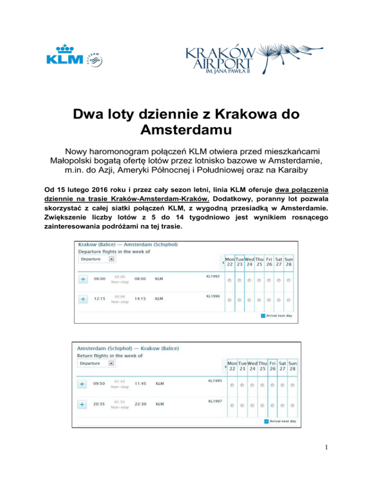 Dwa loty dziennie z Krakowa do Amsterdamu Nowy haromonogram połączeń KLM otwiera przed mieszkańcami Małopolski bogatą ofertę lotów przez lotnisko bazowe w Amsterdamie, m.in. do Azji, Ameryki Północnej i Południowej oraz na Karaiby Od 15 lutego 2016 roku i przez cały sezon letni, linia KLM oferuje dwa połączenia dziennie na trasie Kraków-Amsterdam-Kraków. Dodatkowy, poranny lot pozwala skorzystać z całej siatki połączeń KLM, z wygodną przesiadką w Amsterdamie. Zwiększenie liczby lotów z 5 do 14 tygodniowo jest wynikiem rosnącego zainteresowania podróżami na tej trasie. 1 Dzięki korzystnej porze startu nowego, drugiego lotu KLM na trasie Kraków-Amsterdam podróżni z południa Polski mają do dyspozycji o wiele więcej połączeń na trasach międzykontynentalnych, m.in. do Azji, Ameryki Północnej i Południowej oraz na Wyspy Karaibskie. Na uwagę zasługuje np. oferta do Japonii – wylatując o godzinie 6.00 z Krakowa można przesiąść się na lot do Osaki czy Tokio (o godzinie 14:25) lub wylecieć do Sao Paulo i Brasilii (9:55), a także do Chicago i Detroit (10:40) i wielu innych odległych zakątków świata. Turyści z Małopolski wylatując z Krakowa porannym samolotem mogą teraz także bardziej efektywnie zaplanować weekend w Amsterdamie i okolicy i rozpocząć dzień od śniadania jeszcze tego samego dnia w jednej z urokliwych amsterdamskich kafejek, a następnie rozpocząć zwiedzanie centrum miasta, do którego dojazd pociągiem z lotniska zajmuje zaledwie 20 minut. Linia KLM oferuje loty do wielu unikatowych destynacji takich jak: Panama, Kilimandżaro, chińskie Hangzhou czy wyspy Bali, Curacao, St. Maarten i Bonaire, jak i do licznych miast w Europie. Obecnie siatka połączeń KLM obejmuje 139 miast na całym świecie! Tylko w 2015 roku oprócz Krakowa w siatce połączeń KLM wśród nowości znalazły się również Bogota, Cali, Belfast, Edmonton oraz Montpellier. Nowe połączenia Kraków-Amsterdam są już w systemach i można je rezerwować m.in. na www.klm.pl oraz w biurach podróży na terenie całego kraju. Warto śledzić częste promocje i oferty specjalne na stronie przewoźnika i polskim fanpage’u na Facebooku. 2