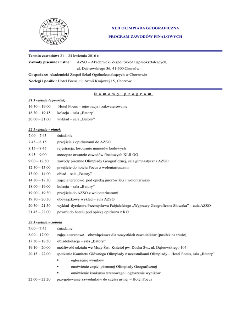 XLII OLIMPIADA GEOGRAFICZNA PROGRAM ZAWODÓW FINAŁOWYCH Termin zawodów: 21 – 24 kwietnia 2016 r. AZSO – Akademicki Zespół Szkół Ogólnokształcących, Zawody pisemne i ustne: ul. Dąbrowskiego 36, 41-500 Chorzów Gospodarz: Akademicki Zespół Szkół Ogólnokształcących w Chorzowie Noclegi i posiłki: Hotel Focus, ul. Armii Krajowej 15, Chorzów R a m o w y p r o g r a m 21 kwietnia (czwartek) 16.30 – 19.00 Hotel Focus – rejestracja i zakwaterowanie 18.30 – 19.15 kolacja – sala „Batory” 20.00 – 21.00 wykład – sala „Batory” 22 kwietnia - piątek 7.00 – 7.45 śniadanie 7.45 – 8.15 przejście z opiekunami do AZSO 8.15 – 8.45 rejestracja, losowanie numerów kodowych 8.45 – 9.00 uroczyste otwarcie zawodów finałowych XLII OG 9.00 – 12.30 zawody pisemne Olimpiady Geograficznej, sala gimnastyczna AZSO 12.30 – 13.00 przejście do hotelu Focus z wolontariuszami 13.00 – 14.00 obiad – sala „Batory” 14.30 – 17.30 zajęcia terenowe pod opieką jurorów KG i wolontariuszy 18.00 – 19.00 kolacja – sala „Batory” 19.00 – 19.30 przejście do AZSO z wolontariuszami 19.30 – 20.30 obowiązkowy wykład – aula AZSO 20.30 – 21.30 wykład dyrektora Przemysława Fabjańskiego „Wyprawy Geograficzne Słowaka” – aula AZSO 21.45 – 22.00 powrót do hotelu pod opieką opiekuna z KO 23 kwietnia – sobota 7.00 – 7.45 śniadanie 8.00 – 17.00 zajęcia terenowe – obowiązkowe dla wszystkich zawodników (posiłek na trasie) 17.30 – 18.30 obiadokolacja – sala „Batory” 19.10 – 20.00 możliwość udziału we Mszy Św., Kościół pw. Ducha Św., ul. Dąbrowskiego 104 20.15 – 22.00 spotkanie Komitetu Głównego Olimpiady z uczestnikami Olimpiady – Hotel Focus, sala „Batory” 22.00 – 22.20 ogłoszenie wyników omówienie części pisemnej Olimpiady Geograficznej omówienie konkursu terenowego i ogłoszenie wyników przygotowanie zawodników do części ustnej – Hotel Focus 24 kwietnia – niedziela Uczniowie startujący w zawodach ustnych: 6.45 – 7.15 śniadanie 7.15 – 7,45 przejście do AZSO przygotowanie zawodników do części ustnej Olimpiady Geograficznej od 7.45 8.15 – 11.30 zawody ustne Olimpiady Geograficznej – sala gimnastyczna AZSO Pozostali uczestnicy (uczniowie finaliści, nauczyciele warsztatowcy, itp.): 7.00 – 7,45 śniadanie 7,45 – 8.15 przejście do AZSO 8.15 – 11.30 zawody ustne Olimpiady Geograficznej – sala gimnastyczna AZSO 11.00 – 12.00 wydawanie finalistom zaświadczeń i medali (sala Geograficzna) Wszyscy: 12.15 – 13.15 ogłoszenie wyników, uroczystość zakończenia Olimpiady, sala gimnastyczna AZSO 13.15 – 14.15 – powrót do hotelu, posiłek, wykwaterowanie 14.15 odjazd autobusu na dworzec kolejowy w Katowicach z parkingu przed hotelem 14.30 odjazd autobusu na dworzec kolejowy w Katowicach z parkingu przed hotelem