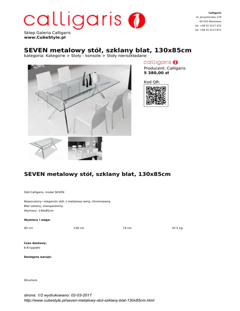 Calligaris Al. Jerozolimskie 179 02-222 Warszawa tel. +48 22 3117-222 tel. +48 22 3117-871 Sklep Galeria Calligaris www.CubeStyle.pl SEVEN metalowy stół, szklany blat, 130x85cm kategoria: Kategorie > Stoły - konsole > Stoły nierozkładane Producent: Calligaris 5 380,00 zł Kod QR: SEVEN metalowy stół, szklany blat, 130x85cm Stół Calligaris, model SEVEN Nowoczesny i elegancki stół, z metalową ramą, chromowaną. Blat szklany, transparentny. Wymiary: 130x85cm Wymiary i waga: 85 cm 130 cm 74 cm Czas dostawy: 6-8 tygodni Dostępne wersje: Structure strona: 1/2 wydrukowano: 02-03-2017 http://www.cubestyle.pl/seven-metalowy-stol-szklany-blat-130x85cm.html 47.5 kg Glass top strona: 2/2 wydrukowano: 02-03-2017 http://www.cubestyle.pl/seven-metalowy-stol-szklany-blat-130x85cm.html