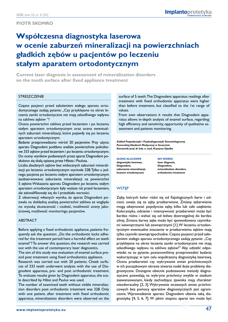 Implantoprotetyka 2008, tom IX, nr 4 (33) S TO M ATO L O G I A K L I N I C Z NA Piotr Skomro Współczesna diagnostyka laserowa w ocenie zaburzeń mineralizacji na powierzchniach gładkich zębów u pacjentów po leczeniu stałym aparatem ortodontycznym Current laser diagnosis in assessment of mineralization disorders on the tooth surface after fixed appliance treatment Streszczenie Często pacjenci przed założeniem stałego aparatu ortodontycznego zadają pytanie: „Czy przyklejone na okres leczenia zamki ortodontyczne nie mają szkodliwego wpływu na szkliwo zębów ”? Ocena powierzchni szkliwa przed leczeniem i po leczeniu stałym aparatem ortodontycznym oraz ocena ewentualnych zaburzeń mineralizacji, które pojawiły się po leczeniu aparatem ortodontycznym. Badanie przeprowadzono wśród 20 pacjentów. Przy użyciu aparatu Diagnodent poddano analizie powierzchnie policzkowe 333 zębów przed leczeniem i po leczeniu ortodontycznym. Do oceny wyników podawanych przez aparat Diagnodent posłużono się skalą opisaną przez Hibsta i Paulusa. Liczba zbadanych zębów bez widocznych zaburzeń mineralizacji po leczeniu ortodontycznym wyniosła 328. Tylko u jednego pacjenta po leczeniu stałym aparatem ortodontycznym zaobserwowano zaburzenia mineralizacji na powierzchni 5 zębów. Wskazania aparatu Diagnodent po leczeniu stałym aparatem ortodontycznym były wyższe niż przed leczeniem, ale zakwalifikowały się do I przedziału wartości. Z obserwacji własnych wynika, że aparat Diagnodent pozwala na dokładną analizę powierzchni szkliwa ze względu na: wysoką skuteczność i czułość, możliwość oceny jakościowej, możliwość monitoringu pacjentów. - - - - - Abstract Before applying a fixed orthodontic appliance, patients frequently ask the question: „Do the orthodontic locks adhered for the treatment period have a harmful effect on teeth enamel”? To answer this question, the research was carried out with the use of contemporary laser diagnostics. The aim of this study was evaluation of enamel surface preand post treatment using fixed orthodontics appliance. Research was carried out with 20 patients. Cheek surfaces of 333 teeth underwent analysis with the use of Diagnodent apparatus, pre- and post orthodontic treatment. To evaluate results given by Diagnodent apparatus, the scale described by Hibst and Paulus was used. The number of examined teeth without visible mineralization disorders post orthodontic treatment was 328. Only with one patient, after treatment with fixed orthodontic apparatus, mineralization disorders were observed on the w w w. i m p l a n t o p r o t e t y k a . e u surface of 5 teeth.The Diagnodent apparatus readings after treatment with fixed orthodontic apparatus were higher than before treatment, but classified to the 1st range of values. From own observations it results that Diagnodent apparatus allows in-depth analysis of enamel surface, regarding: high efficiency and sensitivity, opportunity of qualitative assessment and patients monitoring. Zakład Propedeutyki i Fizykodiagnostyki Stomatologicznej Pomorskiej Akademii Medycznej w Szczecinie Kierownik: prof. dr hab. n. med. Krystyna Opalko Słowa kluczowe Key words diagnostyka laserowa, laser diagnosis, Diagnodent,Diagnodent, zaburzenia mineralizacji, mineralization disorders, leczenie ortodontyczne orthodontics treatment Wstęp Zęby, których kolor różni się od fizjologicznych barw i odcieni, uważa się za zęby przebarwione. Zmiany zabarwienia mogą obejmować pojedyncze zęby, kilka lub całe uzębienie. Kolorystyka, odcienie i intensywność przebarwień może być bardzo różna i wahać się od ledwo dostrzegalnej do bardzo silnej. Zmiana barwy zęba może być spowodowana czynnikami wewnętrznymi lub zewnętrznymi [1]. W leczeniu ortodontycznym ewentualne znaczenie w przebarwieniu zębów mają tylko czynniki zewnątrzpochodne. Często pacjenci przed założeniem stałego aparatu ortodontycznego zadają pytanie: „Czy przyklejone na okres leczenia zamki ortodontyczne nie mają szkodliwego wpływu na szkliwo zębów?” Aby udzielić odpowiedzi na to pytanie, postanowiliśmy przeprowadzić badania wykorzystując w tym celu współczesną diagnostykę laserową. Ocena przebarwień czy wykrywanie zmian próchnicowych w ich początkowym okresie stwarza nadal duże problemy diagnostyczne. Dostępne obecnie podstawowe metody diagnostyczne pozwalają na wykrycie próchnicy zwykle w stadium zaawansowanym, kiedy zachodzące zjawiska mają charakter nieodwracalny [2, 3]. Wykrywanie wczesnych zmian próchnicowych bez pomocy aparatów diagnostycznych jest ograniczone. Wprowadzenie aparatu Diagnodent ułatwia taką diagnostykę [4, 5, 6, 7]. W jakim stopniu aparat ten może być 47 Implantoprotetyka 2008, tom IX, nr 4 (33) S TO M ATO L O G I A K L I N I C Z NA Ryc. 1. Wskazania Diagnodentu przed leczeniem i po leczeniu powierzchni poszczególnych zębów w szczęce bez widocznych zaburzeń mineralizacji. w zależności od stopnia podatności pacjenta na próchnicę. Przedział IV to wartości >30 mówiące o konieczności interwencji stomatologicznej jak również profesjonalnych zabiegów profilaktycznych. Widoczne zaburzenia mineralizacji poddano klasyfikacji wg wskaźnika DDE (Development Defects of Enamel). Jest to wskaźnik rozwojowych defektów szkliwa. Do tej grupy nieprawidłowości należy szereg zmian o złożonej i nie zawsze znanej etiologii oraz zróżnicowanej symptomatologii. Wyróżnia się 8 typów zaburzeń oznaczonych od 0 do 8: 0 – określa szkliwo normalne, 1 – opalizacja białokremowa, 2 – opalizacja żółtobrązowa, 3 – hipoplazja pod postacią zagłębień, 4 – hipoplazja pod postacią linii poprzecznych, 5 – hipoplazja pod postacią linii pionowych, 6 – brak szkliwa, 7 - przebarwienie szkliwa, 8 - inne defekty [10]. Wyniki badań i ich omówienie Ryc. 2. Wskazania Diagnodentu przed leczeniem i po leczeniu powierzchni poszczególnych zębów w żuchwie
