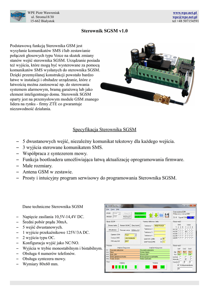 WPE Piotr Wawreniuk ul. Stroma18/30 15-662 Białystok www.wpe.net.pl [email protected] tel +48 507154591 Sterownik SGSM v1.0 Podstawową funkcją Sterownika GSM jest wysyłanie komunikatów SMS i/lub zestawianie połączeń głosowych typu Voice na skutek zmiany stanów wejść sterownika SGSM. Urządzanie posiada też wyjścia, które mogą być wysterowane za pomocą komunikatów SMS wysłanych do sterownika SGSM. Dzięki przemyślanej konstrukcji powstało bardzo łatwe w instalacji i obsłudze urządzanie, które z łatwością można zastosować np. do sterowania systemem alarmowym, bramą garażową lub jako element inteligentnego domu. Sterownik SGSM oparty jest na przemysłowym module GSM znanego lidera na rynku - firmy ZTE co gwarantuje niezawodność działania. Specyfikacja Sterownika SGSM – – – – – – – 5 dwustanowych wejść, niezależny komunikat tekstowy dla każdego wejścia. 3 wyjścia sterowane komunikatem SMS. Współpraca z syntezerem mowy. Funkcja bootloadera umożliwiająca łatwą aktualizację oprogramowania firmware. Małe rozmiary. Antena GSM w zestawie. Prosty i intuicyjny program serwisowy do programowania Sterownika SGSM. Dane techniczne Sterownika SGSM – – – – – – – – – – Napięcie zasilania 10,5V-14,4V DC. Średni pobór prądu 30mA. 5 wejść dwustanowych. 1 wyjście przekaźnikowe 125V/3A DC. 2 wyjścia typu OC. Konfiguracja wyjść jako NC/NO. Wyjścia w trybie monostabilnym i bistabilnym. Obsługa 4 numerów telefonów. Obsługa syntezera mowy. Wymiary 80x60 mm.