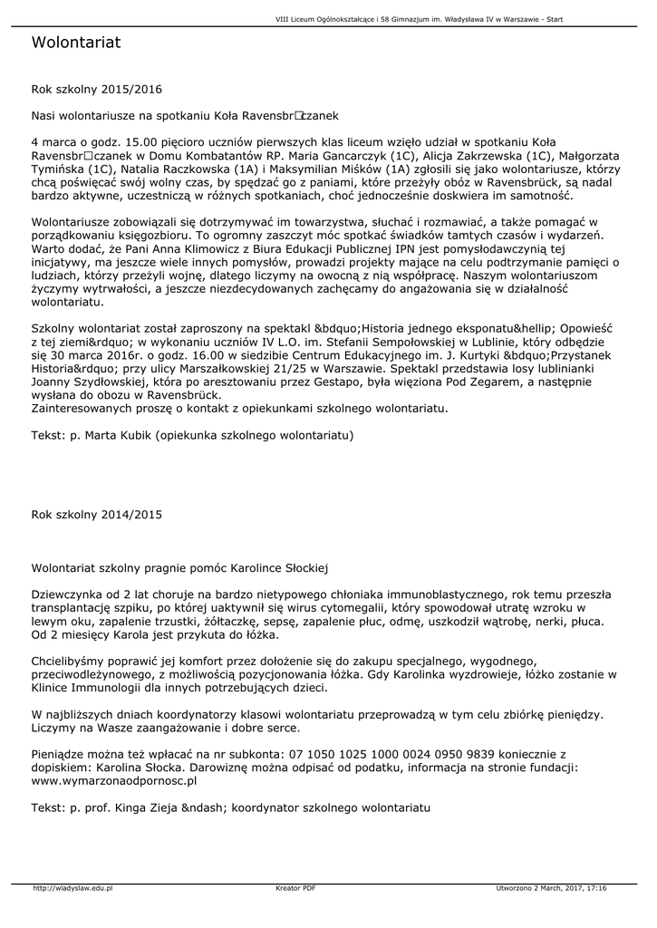 VIII Liceum Ogólnokształcące i 58 Gimnazjum im. Władysława IV w Warszawie - Start Wolontariat Rok szkolny 2015/2016 Nasi wolontariusze na spotkaniu Koła Ravensbrûczanek 4 marca o godz. 15.00 pięcioro uczniów pierwszych klas liceum wzięło udział w spotkaniu Koła Ravensbrczanek w Domu Kombatantów RP. Maria Gancarczyk (1C), Alicja Zakrzewska (1C), Małgorzata Tymińska (1C), Natalia Raczkowska (1A) i Maksymilian Miśków (1A) zgłosili się jako wolontariusze, którzy chcą poświęcać swój wolny czas, by spędzać go z paniami, które przeżyły obóz w Ravensbrück, są nadal bardzo aktywne, uczestniczą w różnych spotkaniach, choć jednocześnie doskwiera im samotność. Wolontariusze zobowiązali się dotrzymywać im towarzystwa, słuchać i rozmawiać, a także pomagać w porządkowaniu księgozbioru. To ogromny zaszczyt móc spotkać świadków tamtych czasów i wydarzeń. Warto dodać, że Pani Anna Klimowicz z Biura Edukacji Publicznej IPN jest pomysłodawczynią tej inicjatywy, ma jeszcze wiele innych pomysłów, prowadzi projekty mające na celu podtrzymanie pamięci o ludziach, którzy przeżyli wojnę, dlatego liczymy na owocną z nią współpracę. Naszym wolontariuszom życzymy wytrwałości, a jeszcze niezdecydowanych zachęcamy do angażowania się w działalność wolontariatu. Szkolny wolontariat został zaproszony na spektakl „Historia jednego eksponatu… Opowieść z tej ziemi” w wykonaniu uczniów IV L.O. im. Stefanii Sempołowskiej w Lublinie, który odbędzie się 30 marca 2016r. o godz. 16.00 w siedzibie Centrum Edukacyjnego im. J. Kurtyki „Przystanek Historia” przy ulicy Marszałkowskiej 21/25 w Warszawie. Spektakl przedstawia losy lublinianki Joanny Szydłowskiej, która po aresztowaniu przez Gestapo, była więziona Pod Zegarem, a następnie wysłana do obozu w Ravensbrück. Zainteresowanych proszę o kontakt z opiekunkami szkolnego wolontariatu. Tekst: p. Marta Kubik (opiekunka szkolnego wolontariatu) Rok szkolny 2014/2015 Wolontariat szkolny pragnie pomóc Karolince Słockiej Dziewczynka od 2 lat choruje na bardzo nietypowego chłoniaka immunoblastycznego, rok temu przeszła transplantację szpiku, po której uaktywnił się wirus cytomegalii, który spowodował utratę wzroku w lewym oku, zapalenie trzustki, żółtaczkę, sepsę, zapalenie płuc, odmę, uszkodził wątrobę, nerki, płuca. Od 2 miesięcy Karola jest przykuta do łóżka. Chcielibyśmy poprawić jej komfort przez dołożenie się do zakupu specjalnego, wygodnego, przeciwodleżynowego, z możliwością pozycjonowania łóżka. Gdy Karolinka wyzdrowieje, łóżko zostanie w Klinice Immunologii dla innych potrzebujących dzieci. W najbliższych dniach koordynatorzy klasowi wolontariatu przeprowadzą w tym celu zbiórkę pieniędzy. Liczymy na Wasze zaangażowanie i dobre serce. Pieniądze można też wpłacać na nr subkonta: 07 1050 1025 1000 0024 0950 9839 koniecznie z dopiskiem: Karolina Słocka. Darowiznę można odpisać od podatku, informacja na stronie fundacji: www.wymarzonaodpornosc.pl Tekst: p. prof. Kinga Zieja – koordynator szkolnego wolontariatu http://wladyslaw.edu.pl Kreator PDF Utworzono 2 March, 2017, 17:16 VIII Liceum Ogólnokształcące i 58 Gimnazjum im. Władysława IV w Warszawie - Start Rok szkolny 2011/2012 Bardzo serdecznie dziekujemy wszystkim za zaangażowanie w akcje wolontariatu szkolnego. Wszystkie nasze działania podejmujemy w czasie wolnym, dlatego kierujemy szczególne podziękowania do tych, którzy wytrwale uczestniczyli w naszych akcjach:)) p. prof. Monika Adamowicz - zakup wyprawek szkolnych dla pięciorga dzieci z rodziny będącej pod opieką Hospicjum w Wołominie - uczestnictwo w Dnaich Wolontariatu Europejskiego - gra miejska i konferencja - zbiórka lektur, repetytoriuów i podręczników dla podopiecznych Hospicjumzbiórka odzieży na rzec Fundacji Dzeici Niczyje - ogłoszenie konkursu na plakat - Dlaczego warto być wolontariuszem? - zbiórka rękodzieła na aukcję - dochód przeznaczony na leczenie chłopca z nowotworem oka - kiermasz rękodzieła - dochód przeznaczony na leczenie chłopca z nowotworem oka - udział w Świątecznej Zbiórce Żywności - Góra Grosza - Marzycielska Poczta: ochotnicy napisali ok. 50 własnoręcznie robionych kartek do 10 - letniego Natanaela, który choruje na szereg nieuleczalnych chorób - zbiórka makulatury - dochód został przeznaczony na dofinansowanie rodzinnych domów dziecka - Kup pluszaka - pociesz dzieciaka - zakup 18 pluszaków dla osieroconych podopiecznych Hospicjum w Wołominie - Całoroczne akcje "Poczytaj mi, starszy kolego" w 3 praskich przedszkolach - Pomoc uczniom SP na ul Białostockiej - po lekcjach licealiści pomagali uczniom w odrabianiu lekcji Rok szkolny 2008/2009 Przez ostatnie dwa lata, wramach szkolnego wolontariatu, nasi uczniowie wzięli udział w wielu wspaniałych akcjach i pomogli wielu ludziom. W tym roku chcemy w sposób szczególny zaangażować się w pomoc najbardziej potrzebującym, dlatego planujemy wziąć udział w zbiórkach żywności (Bank Żywności), zbiórce podarków gwiazdkowych (Ośrodek Akcji Bezpośredniej Pomocy Głodującym), kweście organizowanej przez Stowarzyszenie Pomocy Rodzinie i Osobom Niepełnosprawnym oraz kweście dla Hospicjum Domowego w akcji "Pola Nadziei". Ponadto nasi licealiści będą pomagać w nauce uczniom Szkoły Podstawowej nr 73 przy ul. Białostockiej, a gimnazjaliści będą czytać przedszkolakom bajki w ramach akcji "Cała Polska czyta dzieciom". Chcemy też zorganizować pomoc w nauce uczniom naszej szkoły. Przypominamy, że każda klasa wybiera dwóch koordynatorów, którzy mają za zadanie szczególnie intensywnie angażować się w prace wolontariatu, a także pełnić rolę łączników między szkolnym wolontariatem a swoją klasą. Obowiązkowe spotkania koordynatorów odbywają się raz w tygodniu, w każdy poniedziałek, na dużej przerwie w Klubie Wychowanków. Opiekę nad wolontariatem pełn