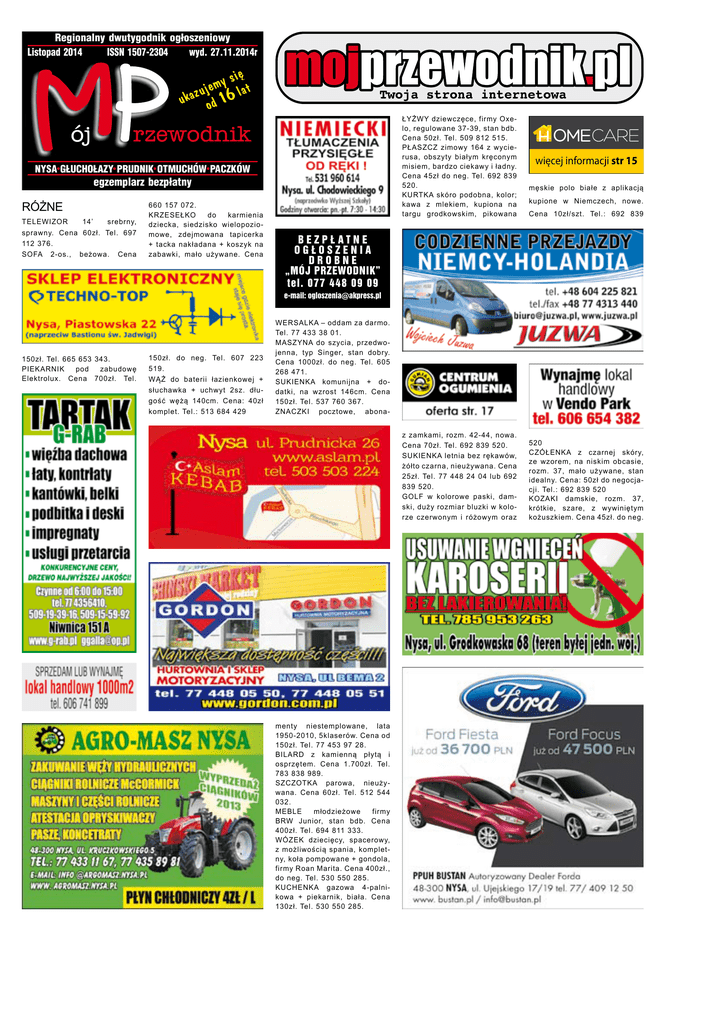 Regionalny dwutygodnik og³oszeniowy Listopad 2014 ISSN 1507-2304 wyd. 27.11.2014r siê y m uje 6 lat z a k u od 1 ŁYŻWY dziewczęce, firmy Oxelo, regulowane 37-39, stan bdb. Cena 50zł. Tel. 509 812 515. PŁASZCZ zimowy 164 z wycierusa, obszyty białym kręconym misiem, bardzo ciekawy i ładny. Cena 45zł do neg. Tel. 692 839 520. KURTKA skóro podobna, kolor; kawa z mlekiem, kupiona na targu grodkowskim, pikowana NYSA G£UCHO£AZY PRUDNIK OTMUCHÓW PACZKÓW egzemplarz bezp³atny RÓŻNE TELEWIZOR 14’ srebrny, sprawny. Cena 60zł. Tel. 697 112 376. SOFA 2-os., beżowa. Cena 660 157 072. KRZESEŁKO do karmienia dziecka, siedzisko wielopoziomowe, zdejmowana tapicerka + tacka nakładana + koszyk na zabawki, mało używane. Cena więcej informacji str 15 męskie polo białe z aplikacją kupione w Niemczech, nowe. Cena 10zł/szt. Tel.: 692 839 BEZPŁATNE OGŁOSZENIA DROBNE „MÓJ PRZEWODNIK” tel. 077 448 09 09 e-mail: [email protected] 150zł. Tel. 665 653 343. PIEKARNIK pod zabudowę Elektrolux. Cena 700zł. Tel. 150zł. do neg. Tel. 607 223 519. WĄŻ do baterii łazienkowej + słuchawka + uchwyt 2sz. długość wężą 140cm. Cena: 40zł komplet. Tel.: 513 684 429 WERSALKA – oddam za darmo. Tel. 77 433 38 01. MASZYNA do szycia, przedwojenna, typ Singer, stan dobry. Cena 1000zł. do neg. Tel. 605 268 471. SUKIENKA komunijna + dodatki, na wzrost 146cm. Cena 150zł. Tel. 537 760 367. ZNACZKI pocztowe, abonaz zamkami, rozm. 42-44, nowa. Cena 70zł. Tel. 692 839 520. SUKIENKA letnia bez rękawów, żółto czarna, nieużywana. Cena 25zł. Tel. 77 448 24 04 lub 692 839 520. GOLF w kolorowe paski, damski, duży rozmiar bluzki w kolorze czerwonym i różowym oraz menty niestemplowane, lata 1950-2010, 5klaserów. Cena od 150zł. Tel. 77 453 97 28. BILARD z kamienną płytą i osprzętem. Cena 1.700zł. Tel. 783 838 989. SZCZOTKA parowa, nieużywana. Cena 60zł. Tel. 512 544 032. MEBLE młodzieżowe firmy BRW Junior, stan bdb. Cena 400zł. Tel. 694 811 333. WÓZEK dziecięcy, spacerowy, z możliwością spania, kompletny, koła pompowane + gondola, firmy Roan Marita. Cena 400zł., do neg. Tel. 530 550 285. KUCHENKA gazowa 4-palnikowa + piekarnik, biała. Cena 130zł. Tel. 530 550 285. 520 CZÓŁENKA z czarnej skóry, ze wzorem, na niskim obcasie, rozm. 37, mało używane, stan idealny. Cena: 50zł do negocjacji. Tel.: 692 839 520 KOZAKI damskie, rozm. 37, krótkie, szare, z wywiniętym kożuszkiem. Cena 45zł. do neg. BEZPŁATNE OGŁOSZENIA DROBNE „MÓJ PRZEWODNIK” tel. 077 448 09 09 [email protected] Tel. 692 839 520. SUKIENKA komunijna na wzrost 152cm, ozdobiona koralikami i pasmanterią jedwabną, dół str. sukienki usztywniony kołem, rękawki do łokcia z falbanką. Cena 140zł. do neg. Tel. 692 839 520. MEBLE pokojowe, wysoki połysk, kolor ciemny brąz; szafo biblioteka-200zł., komoda – 100zł., stół z 6-krzesłami400zł., ława -cena 80zł, biurko - cena 70zł. Tel. 604 964 401. KANISTRY na paliwo, 20L, 10szt. Cena 20zł./szt. Tel. 604 964 401. PRALKA automatyczna Polar, sprawna. Cena 350zł. Tel. 604 964 401. KOMPUTER stacjonarny. Cena 500zł. Tel. 781 295 310. GARNITUR młodzieżowy, rozm. M, kolor złoty, + buty rozm. 42, kremowe. Cena 200zł. Tel. 506 215 588. PŁASZCZ jesienno zimowy, czarny, damski, duży rozmiar, nieużywany. Cena 60zł. Tel. 669 219 570. SUKNIA ślubna, biała, rozm. 40, 2-częściowa. Cena 500zł. Tel. 669 219 570. KORYTO granitowe, dł. 220cm. Cena 550zł. Tel. 695 933 342. MEBLE dębowe; 2 ławy i stół, dł. 220cm. Cena 600zł. Tel. 695 933 342. SZAFA 2-drzwiowa 90cmx2m, brązowa. Cena 100zł. Tel. 77 433 79 08 lub 668 977 090. WÓZEK dla niemowlaka. Cena 150zł. Tel. 77 433 79 08 lub 668 977 090. NOSIDEŁKO. Cena 30zł. Tel. 77 433 79 08 lub 668 977 090. KURTKA skórzana męska, 165170cm. Cena 300zł. Tel. 77 433 79 08 lub 668 977 090. TALERZE ręcznie malowane, 3szt. Cena 30zł. Tel. 77 433 79 08 lub 668 977 090. WÓZEK dla inwalidy chodzącego. Cena 150zł. Tel. 77 433 79 08 lub 668 977 090. WÓZEK spacerowy dla dziecka. Cena 50zł. Tel. 77 433 79 08 lub 668 977 090. WÓZEK inwalidzki, nowy, nieużywany. Cena 1200zł. Tel. 77 433 79 08 lub 668 977 090. KLASER ze znaczkami z przed 50-lat. Cena 120zł. Tel. 77 433 79 08 lub 668 977 090. SIODEŁKO na rower do 4lat. Cena 70zł. Tel. 77 433 79 08 lub 668 977 090. CZÓŁENKA luksusowe, wew. i zew. skóra. damskie, rozm. 39, kolor popielaty. Cena 120zł. Tel. 77 433 79 08 lub 668 977 090. FOTELIK na rower. Cena 100zł. Tel. 77 433 79 08 lub 668 977 090. QUAD dla dziecka, dla 4-5latka, na akumulator. Cena 120zł. Tel. 77 433 79 08 lub 668 977 090. ADIDASY damskie, rozm. 38, niebieski zamsz, nowe. Cena 80zł. Tel. 77 433 79 08 lub 668 977 090. KSIĄŻKA telefoniczna, nowa, wszystkie Przychodnie Prywatne i Państwowe woj. opolskiego. Cena 40zł. Tel. 77 433 79 08 lub 668 977 090. DZIEJE Sztuki w Zarysie, 4tomy, piękne wydanie. Cena 200zł. Tel. 77 433 79 08 lub 668 977 090. ROWER męski, produkcji niemieckiej, stan bdb. Cena 250zł. Tel. 77 433 79 08 lub 668 977 090. KOŻUCH damski, wzrost 165cm, nowy, kolor ciemny beż. Cena 1200zł. Tel. 77 433 79 08 lub 668 977 090. PODGRZEWACZ przepływowy Siemens Elektronic. Cena 250zł. Tel. 77 433 79 08 lub 668 977 090. PŁYTA elektryczna, ceramiczna, do kuchenki, firmy Neff. Cena 200zł. Tel. 77 433 79 08 lub 668 977 090. BOILER 5L, stan dobry. Cena 150zł. Tel. 77 433 79 08 lub 668 977 090. GITARA klasyczna Gewa pro- KOŻUCH męski na dł. ¾, kolor ciemny beż, wzrost 175cm. Cena 600zł. Tel. 77 433 79 08 lub 668 977 090. dukcji niemieckiej Gitara jest w bardzo dobrym stanie jest miękka i stroi bardzo dobrze. Cena 250 zł Tel. 605938887 BEZPŁATNE OGŁOSZENIA DROBNE, tel. 77 448 09 09 pn. - pt. od 9.00 - 17.00, [email protected], www.mojprzewodnik.pl STOPA do perkusji na platformie. Stan bardzo dobry. Cena 150 zł Tel. 605938887 GITARA klasyczna Classica produkcji niemieckiej . Gitara w bardzo dobrym stanie. Cena 350 zł Tel.605938887 GITARA elektryczna 