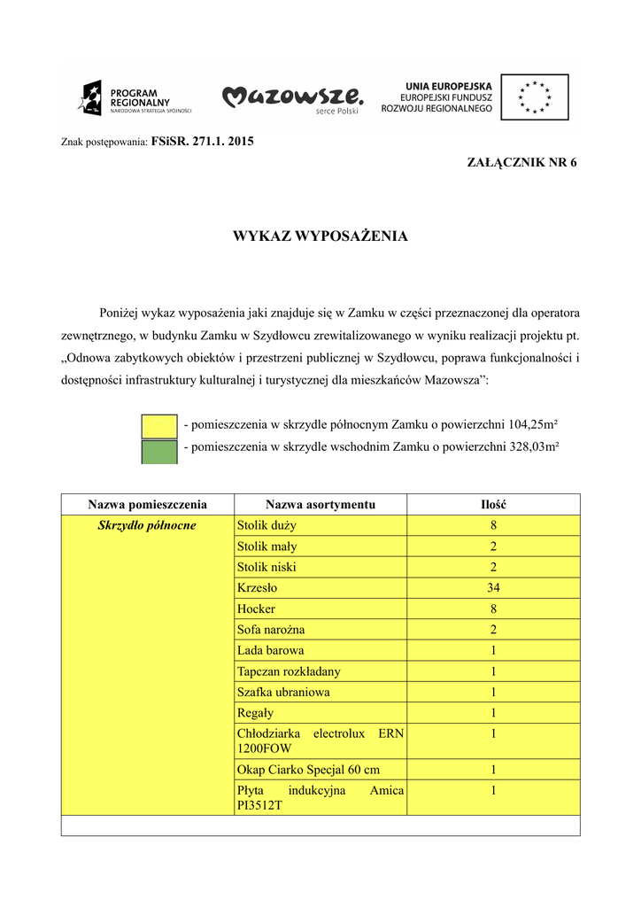 Znak postępowania: FSiSR. 271.1. 2015 ZAŁĄCZNIK NR 6 WYKAZ WYPOSAŻENIA Poniżej wykaz wyposażenia jaki znajduje się w Zamku w części przeznaczonej dla operatora zewnętrznego, w budynku Zamku w Szydłowcu zrewitalizowanego w wyniku realizacji projektu pt. „Odnowa zabytkowych obiektów i przestrzeni publicznej w Szydłowcu, poprawa funkcjonalności i dostępności infrastruktury kulturalnej i turystycznej dla mieszkańców Mazowsza”: - pomieszczenia w skrzydle północnym Zamku o powierzchni 104,25m² - pomieszczenia w skrzydle wschodnim Zamku o powierzchni 328,03m² Nazwa pomieszczenia Skrzydło północne Nazwa asortymentu Ilość Stolik duży 8 Stolik mały 2 Stolik niski 2 Krzesło 34 Hocker 8 Sofa narożna 2 Lada barowa 1 Tapczan rozkładany 1 Szafka ubraniowa 1 Regały 1 Chłodziarka 1200FOW electrolux ERN 1 Okap Ciarko Specjal 60 cm 1 Płyta indukcyjna PI3512T 1 Amica Skrzydło wschodnie Sala rycerska Sala z kolumną Hol Szatnia Stół składany 240 5 Krzesło drewniane 17 Fotel biurowy 1 Stół składany 240 2 Stół składany 160 2 Krzesło drewniane 20 Sofa skórzana 2 osobowa 2 Stolik niski 1 Zbroja z mieczem 186 cm 1 Zbroja z mieczem 185 cm 1 Zbroja z halabardą 185 cm 1 Zbroja z halabardą 185 cm 1 Kontuar 1 Meble 1 Stół składany 240 12 Krzesło 68 Sofa skórzana 2 osobowa 2 Stolik niski 2 Wieszak systemowy 6 Regał drewniany 1 Regał drewniany zamykany 1 Krzesło drewniane 68 Stolik 1 Lada podawcza 1