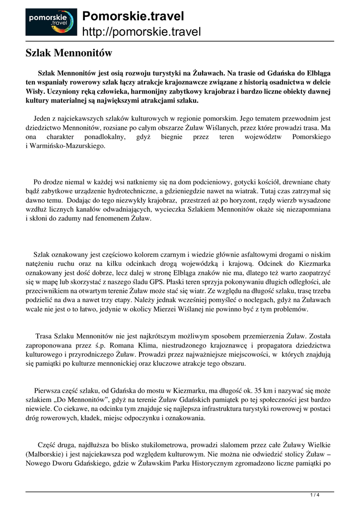 Pomorskie.travel http://pomorskie.travel Szlak Mennonitów Szlak Mennonitów jest osią rozwoju turystyki na Żuławach. Na trasie od Gdańska do Elbląga ten wspaniały rowerowy szlak łączy atrakcje krajoznawcze związane z historią osadnictwa w delcie Wisły. Uczyniony ręką człowieka, harmonijny zabytkowy krajobraz i bardzo liczne obiekty dawnej kultury materialnej są największymi atrakcjami szlaku. Jeden z najciekawszych szlaków kulturowych w regionie pomorskim. Jego tematem przewodnim jest dziedzictwo Mennonitów, rozsiane po całym obszarze Żuław Wiślanych, przez które prowadzi trasa. Ma ona charakter ponadlokalny, gdyż biegnie przez teren województw Pomorskiego i Warmińsko-Mazurskiego. Po drodze niemal w każdej wsi natkniemy się na dom podcieniowy, gotycki kościół, drewniane chaty bądź zabytkowe urządzenie hydrotechniczne, a gdzieniegdzie nawet na wiatrak. Tutaj czas zatrzymał się dawno temu. Dodając do tego niezwykły krajobraz, przestrzeń aż po horyzont, rzędy wierzb wysadzone wzdłuż licznych kanałów odwadniających, wycieczka Szlakiem Mennonitów okaże się niezapomniana i skłoni do zadumy nad fenomenem Żuław. Szlak oznakowany jest częściowo kolorem czarnym i wiedzie głównie asfaltowymi drogami o niskim natężeniu ruchu oraz na kilku odcinkach drogą wojewódzką i krajową. Odcinek do Kiezmarka oznakowany jest dość dobrze, lecz dalej w stronę Elbląga znaków nie ma, dlatego też warto zaopatrzyć się w mapę lub skorzystać z naszego śladu GPS. Płaski teren sprzyja pokonywaniu długich odległości, ale przeciwnikiem na otwartym terenie Żuław może stać się wiatr. Ze względu na długość szlaku, trasę trzeba podzielić na dwa a nawet trzy etapy. Należy jednak wcześniej pomyśleć o noclegach, gdyż na Żuławach wcale nie jest o to łatwo, jedynie w okolicy Mierzei Wiślanej nie powinno być z tym problemów. Trasa Szlaku Mennonitów nie jest najkrótszym możliwym sposobem przemierzenia Żuław. Została zaproponowana przez ś.p. Romana Klima, niestrudzonego krajoznawcę i propagatora dziedzictwa kulturowego i przyrodniczego Żuław. Prowadzi przez najważniejsze miejscowości, w których znajdują się pamiątki po kulturze mennonickiej oraz kluczowe atrakcje tego obszaru. Pierwsza część szlaku, od Gdańska do mostu w Kiezmarku, ma długość ok. 35 km i nazywać się może szlakiem „Do Mennonitów”, gdyż na terenie Żuław Gdańskich pamiątek po tej społeczności jest bardzo niewiele. Co ciekawe, na odcinku tym znajduje się najlepsza infrastruktura turystyki rowerowej w postaci dróg rowerowych, kładek, miejsc odpoczynku i oznakowania. Część druga, najdłuższa bo blisko stukilometrowa, prowadzi slalomem przez całe Żuławy Wielkie (Malborskie) i jest najciekawsza pod względem kulturowym. Nie można nie odwiedzić stolicy Żuław – Nowego Dworu Gdańskiego, gdzie w Żuławskim Parku Historycznym zgromadzono liczne pamiątki po 1/4 Pomorskie.travel http://pomorskie.travel mennonitach. Organizowane są tam ciekawe wystawy. Dalsza trasa prowadzi przez okolice Malborka, gdzie zachowały się liczne cmentarze mennonickie. Ostatnia część szlaku, o długości ok. 35 km, biegnie przez najmniej znane Żuławy Elbląskie, jednocześnie będące najniżej położoną częścią tego depresyjnego regionu. Przebiega przez zarastające Jezioro Druzno, będące rajem dla ptactwa wodnego i ornitologów. Szlak kończy się w Elblągu, dużym mieście na skraju Żuław i Wysoczyzny Elbląskiej. Teren Żuław, przez który prowadzi Szlak Mennonitów jest niemal płaski i pozwala na szybkie pokonywanie sporych odległości. Z uwagi na przeważające na obszarze Pomorza wiatry zachodnie, lepiej pokonywać go w kierunku z Gdańska do Elbląga. Po drodze podróż można przerwać w Tczewie lub Malborku (dobre połączenia kolejowe z Trójmiastem). O nocleg najłatwiej na Mierzei Wiślanej oraz w Malborku. Na trasie znajduje się kilka sympatycznych gospodarstw agroturystycznych. Warto przeznaczyć trochę czasu na zwiedzanie zabytków po drodze (uwaga: kościoły i domy podcieniowe nie zawsze są udostępniane do zwiedzania), odnalezienie starych cmentarzy, wizytę w muzeum w Nowym Dworze Gdańskim i malborskim zamku oraz odpoczynek na rynku w Nowym Stawie. Urozmaiceniem może być również relaks na plaży w Mikoszewie czy Jantarze. Przebieg: 0 km - Gdańsk, ul. Okopowa. Początek szlaku przy budynku Urzędu Wojewódzkiego (do dworca PKP/SKM ok. 1 km). Uwaga! Wyjazd z Gdańska aż do Wróblewa szlakiem czerwonym „Motławskim” (opis str. 22-23). 14,0 km - Wróblewo. Kościółek szachulcowy z XVII-XVIII w. nad Motławą. Przejeżdżamy przez nową kładkę nad Motławą i jedziemy drogą z płyt betonowych na wschód. 19,0 km - Miłocin. Pięknie odremontowany dom podcieniowy z 1731 r. 21,5 km - Trutnowy. Dom podcieniowy z 1720 r. (po uzgodnieniu z właścicielami możliwy do zwiedzania), kościół gotycki z wystrojem z XVII-XVIII w. 23,8 km - Cedry Wielkie. Wieś gminna. Potężny kościół gotycki. Wystawa historyczna w Żuławskim Domu Kultury obok OSP. 28,0 km - Leszkowy. Kościół gotycki. 32,0 km - Kiezmark. Piękny kościół szachulcowy z XVIII w., stary cmentarz, punkt widokowy na dolinę Wisły. Należy przejechać przez most na drugą stronę rzeki i zjechać następnie w dość niestety wąską i ruchliwą drogę na Mikoszewo. 2/4 Pomorskie.travel http://pomorskie.travel 37,5 km - Żuławki/Drewnica. Zespół domów podcieniowych z XVIII-XIX w., zabudowa drewniana, niezwykły zabytek hydrotechniki - śluza „Gdańska Głowa” na rozwidleniu Szkarpawy i Wisły, wiatrak koźlak z 1718 r. 4305 km - Mikoszewo. Wieś letniskowa na Mierzei Wiślanej. Od maja do października przeprawa promowa na Wyspę Sobieszewską (możliwy powrót do Gdańska, ok. 25 km), rezerwat „Mewia Łacha”. Jedziemy główną drogą do Jantara. 47,8 km - Jantar. Duża miejscowość letniskowa na Mierzei Wiślanej. Skręcam