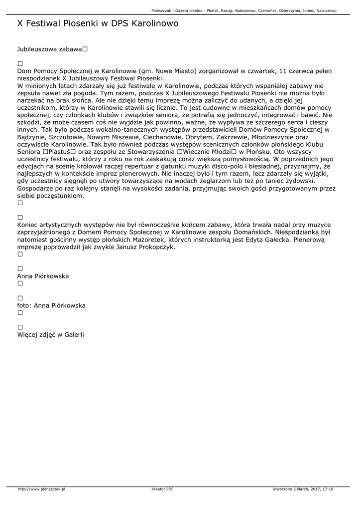 Płońszczak - Gazeta lokalna - Płońsk, Raciąż, Baboszewo, Czerwińsk, Dzierzążnia, Joniec, Naruszewo X Festiwal Piosenki w DPS Karolinowo Jubileuszowa zabawa Dom Pomocy Społecznej w Karolinowie (gm. Nowe Miasto) zorganizował w czwartek, 11 czerwca pełen niespodzianek X Jubileuszowy Festiwal Piosenki. W minionych latach zdarzały się już festiwale w Karolinowie, podczas których wspaniałej zabawy nie zepsuła nawet zła pogoda. Tym razem, podczas X Jubileuszowego Festiwalu Piosenki nie można było narzekać na brak słońca. Ale nie dzięki temu imprezę można zaliczyć do udanych, a dzięki jej uczestnikom, którzy w Karolinowie stawili się licznie. To jest cudowne w mieszkańcach domów pomocy społecznej, czy członkach klubów i związków seniora, że potrafią się jednoczyć, integrować i bawić. Nie szkodzi, że może czasem coś nie wyjdzie jak powinno, ważne, że wypływa ze szczerego serca i cieszy innych. Tak było podczas wokalno-tanecznych występów przedstawicieli Domów Pomocy Społecznej w Bądzynie, Szczutowie, Nowym Miszewie, Ciechanowie, Obrytem, Zakrzewie, Młodzieszynie oraz oczywiście Karolinowie. Tak było również podczas występów scenicznych członków płońskiego Klubu Seniora Plastuś oraz zespołu ze Stowarzyszenia Wiecznie Młodzi w Płońsku. Oto wszyscy uczestnicy festiwalu, którzy z roku na rok zaskakują coraz większą pomysłowością. W poprzednich jego edycjach na scenie królował raczej repertuar z gatunku muzyki disco-polo i biesiadnej, przyznajmy, że najlepszych w kontekście imprez plenerowych. Nie inaczej było i tym razem, lecz zdarzały się wyjątki, gdy uczestnicy sięgnęli po utwory towarzyszące na wodach żeglarzom lub też po taniec żydowski. Gospodarze po raz kolejny stanęli na wysokości zadania, przyjmując swoich gości przygotowanym przez siebie poczęstunkiem. Koniec artystycznych występów nie był równocześnie końcem zabawy, która trwała nadal przy muzyce zaprzyjaźnionego z Domem Pomocy Społecznej w Karolinowie zespołu Domańskich. Niespodzianką był natomiast gościnny występ płońskich Mażoretek, których instruktorką jest Edyta Gałecka. Plenerową imprezę poprowadził jak zwykle Janusz Prokopczyk. Anna Piórkowska foto: Anna Piórkowska Więcej zdjęć w Galerii http://www.plonszczak.pl Kreator PDF Utworzono 2 March, 2017, 17:16