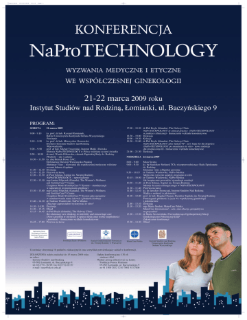 naprotech 26/02/2009 15:14 Page 1 KONFERENCJA NaProTECHNOLOGY WYZWANIA MEDYCZNE I ETYCZNE WE WSPÓ¸CZESNEJ GINEKOLOGII 21-22 marca 2009 roku Instytut Studiów nad Rodzinà, ¸omianki, ul. Baczyƒskiego 9 PROGRAM: SOBOTA 21 marca 2009 9.00 - 9.10 ks. prof. dr hab. Ryszard Rumianek, Rektor Uniwersytetu Kardyna∏a Stefana Wyszyƒskiego Powitanie ks. prof. dr hab. Mieczys∏aw Ozorowski, Dyrektor Instytutu Studiów nad Rodzinà Wprowadzenie prof. dr hab. Micha∏ Troszyƒski, Instytut Matki i Dziecka Historia NaProTECHNOLOGY w Polsce widziana oczami Êwiadka dr med. Wanda Pó∏tawska, cz∏onek Papieskiej Rady ds. Rodziny P∏odnoÊç – dar i zadanie ks. abp Henryk Hoser SAC, Ordynariusz Diecezji Warszawsko-Praskiej Humanae Vitae – wyzwania dla wspó∏czesnej medycyny widziane oczami lekarza i kap∏ana Dyskusja Przerwa na kaw´ dr Piotr Klimas, Szpital im. Âwi´tej Rodziny NaProTECHNOLOGY – wprowadzenie mgr Janina Filipczuk (Kanada), The Women’s Wellness and FertilityCare™ Centre Creighton Model FertilityCare™ System – standaryzacja w naturalnym rozpoznawaniu p∏odnoÊci mgr Janina Filipczuk (Kanada), The Women’s Wellness and FertilityCare™ Centre Creighton Model FertilityCare™ System jako narz´dzie w monitorowaniu stanu zdrowia i p∏odnoÊci kobiety dr Tadeusz Wasilewski, NaPro Medica Dlaczego zaprzesta∏em wykonywaç in vitro? Dyskusja Obiad dr Phil Boyle (Irlandia), The Galway Clinic Revolutionary new thinking in infertility and miscarriage care (Nowy prze∏om w myÊleniu w opiece medycznej wobec niep∏odnoÊci i poronieƒ) - t∏umaczenie wyk∏adu konsekutywne Przerwa na kaw´ 9.10 – 9.20 9.20 – 9.50 9.50 – 10.50 10.50 – 11.50 11.50 – 12.10 12.10 – 12.20 12.20 – 12.30 12.30 – 13.10 13.10 – 13.40 13.40 – 14.10 14.10 - 14.30 14.30 – 15.15 15.15 – 16.45 16.45 – 17.00 17.00 – 18.30 dr Phil Boyle (Irlandia), The Galway Clinic NaProTECHNOLOGY in clinical practice (NaProTECHNOLOGY w praktyce klinicznej) - t∏umaczenie wyk∏adu konsekutywne 18.30 – 19.00 Dyskusja 19.00 – 19.30 Kolacja 19.30 – 21.00 dr Phil Boyle (Irlandia), The Galway Clinic NaProTECHNOLOGY after failed IVF - new hope for the hopeless (NaProTECHNOLOGY po nieudanym in vitro - nowa nadzieja dla zrozpaczonych) - t∏umaczenie wyk∏adu konsekutywne 21.00 – 21.30 Dyskusja NIEDZIELA 22 marca 2009 8.00 – 9.00 9.00 – 9.30 9.30 – 10.15 10.15 – 10.50 10.50 – 11.20 11.20 – 11.40 11.40 – 12.10 12.10 – 12.40 12.40 – 13.10 13.10 – 13.20 13.20 – 13.30 13.30 – 14.30 Msza Âwi´ta ks. bp Stanis∏aw Stefanek TCh, wiceprzewodniczàcy Rady Episkopatu ds. Rodziny Humanae vitae a Dignitas personae dr Tadeusz Wasilewski, NaPro Medica Medyczne i etyczne aspekty programu in vitro dr Tadeusz Wasilewski, NaPro Medica Jak bezpiecznie prowadziç stymulacje owulacji dr Piotr Klimas, Szpital im. Âwi´tej Rodziny Metody leczenia chirurgicznego w NaProTECHNOLOGY Przerwa na kaw´ ks. dr Jaros∏aw Szymczak, Instytut Studiów Nad Rodzinà Walka o wolnoÊç w p∏ciowoÊci prof. dr hab. Bogdan Chazan, Dyrektor Szpitala im. Âwi´tej Rodziny Postrzeganie p∏odnoÊci i ˝ycia we wspó∏czesnej ginekologii i po∏o˝nictwie Dyskusja mgr Maria Ârodoƒ, MaterCare Polska MaterCare International – cele, stan obecny, perspektywa na przysz∏oÊç dr Maria Szczawiƒska, Przewodniczàca Ogólnopolskiej Sekcji Ginekologiczno-Po∏o˝niczej KSLP Zakoƒczenie konferencji Obiad Ogólnopolska Sekcja Ginekologiczno-Po∏o˝nicza Katolickiego Stowarzyszenia Lekarzy Polskich Fundacja ˚ycie i P∏odnoÊç Szpital Ginekologiczno-Po∏o˝niczy im. Âwi´tej Rodziny w Warszawie MaterCare Polska Uczestnicy otrzymujà 10 punktów edukacyjnych oraz certyfikat potwierdzajàcy udzia∏ w konferencji. ZG¸OSZENIA nale˝y nadsy∏aç do 15 marca 2009 roku na adres: Instytut Studiów nad Rodzinà 05-092 ¸omianki, ul. Baczyƒskiego 9 tel. 022/751-38-99; fax 022/732-02-97 e-mail: [email protected] Op∏ata konferencyjna: 130 z∏; studenci 40z∏. Wp∏aty prosz´ dokonywaç na konto: Fundacja Pomoc Rodzinie 05-092 ¸omianki, ul. Baczyƒskiego 9 nr 91 1500 2022 1210 7004 5132 000 Instytut Studiów nad Rodzinà Uniwersytetu Kardyna∏a Stefana Wyszyƒskiego