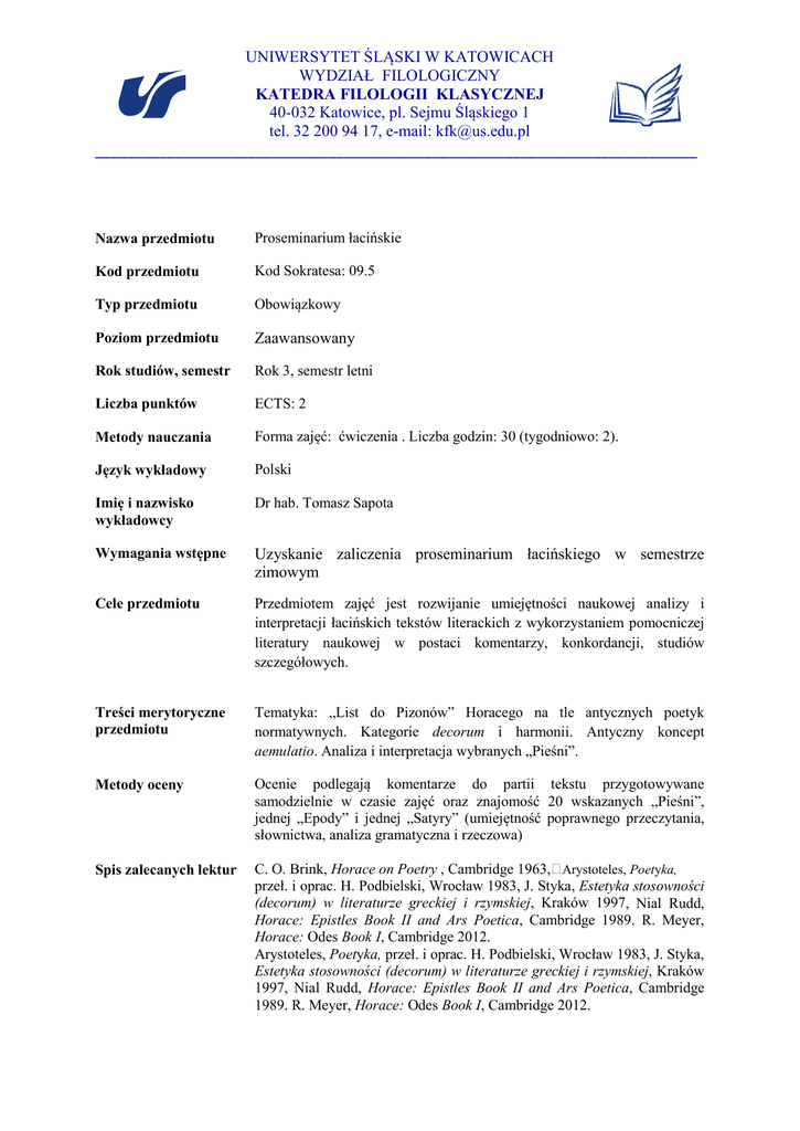 UNIWERSYTET ŚLĄSKI W KATOWICACH WYDZIAŁ FILOLOGICZNY KATEDRA FILOLOGII KLASYCZNEJ 40-032 Katowice, pl. Sejmu Śląskiego 1 tel. 32 200 94 17, e-mail: [email protected] ___________________________________________________________________________ Nazwa przedmiotu Proseminarium łacińskie Kod przedmiotu Kod Sokratesa: 09.5 Typ przedmiotu Obowiązkowy Poziom przedmiotu Zaawansowany Rok studiów, semestr Rok 3, semestr letni Liczba punktów ECTS: 2 Metody nauczania Forma zajęć: ćwiczenia . Liczba godzin: 30 (tygodniowo: 2). Język wykładowy Polski Imię i nazwisko wykładowcy Dr hab. Tomasz Sapota Wymagania wstępne Uzyskanie zaliczenia proseminarium łacińskiego w semestrze zimowym Cele przedmiotu Przedmiotem zajęć jest rozwijanie umiejętności naukowej analizy i interpretacji łacińskich tekstów literackich z wykorzystaniem pomocniczej literatury naukowej w postaci komentarzy, konkordancji, studiów szczegółowych. Treści merytoryczne przedmiotu Tematyka: „List do Pizonów” Horacego na tle antycznych poetyk normatywnych. Kategorie decorum i harmonii. Antyczny koncept aemulatio. Analiza i interpretacja wybranych „Pieśni”. Metody oceny Ocenie podlegają komentarze do partii tekstu przygotowywane samodzielnie w czasie zajęć oraz znajomość 20 wskazanych „Pieśni”, jednej „Epody” i jednej „Satyry” (umiejętność poprawnego przeczytania, słownictwa, analiza gramatyczna i rzeczowa) Spis zalecanych lektur C. O. Brink, Horace on Poetry , Cambridge 1963, Arystoteles, Poetyka, przeł. i oprac. H. Podbielski, Wrocław 1983, J. Styka, Estetyka stosowności (decorum) w literaturze greckiej i rzymskiej, Kraków 1997, Nial Rudd, Horace: Epistles Book II and Ars Poetica, Cambridge 1989. R. Meyer, Horace: Odes Book I, Cambridge 2012. Arystoteles, Poetyka, przeł. i oprac. H. Podbielski, Wrocław 1983, J. Styka, Estetyka stosowności (decorum) w literaturze greckiej i rzymskiej, Kraków 1997, Nial Rudd, Horace: Epistles Book II and Ars Poetica, Cambridge 1989. R. Meyer, Horace: Odes Book I, Cambridge 2012.