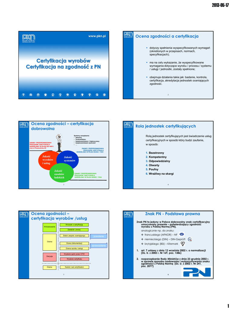 2013-05-17 Ocena zgodności a certyfikacja dotyczy spełnienia wyspecyfikowanych wymagań (określonych w przepisach, normach, specyfikacjach); Certyfikacja wyrobów Certyfikacja na zgodność z PN ma na celu wykazanie, że wyspecyfikowane wymagania dotyczące wyrobu / procesu / systemu / usługi / jednostki, zostały spełnione; obejmuje działania takie jak: badanie, kontrola, certyfikacja, akredytacja jednostek oceniających zgodność. 2 Ocena zgodności – certyfikacja dobrowolna Rola jednostek certyfikujących Systemy zarządzania: • jakością, • środowiskiem, • bezpieczeństwem i higieną pracy • bezpieczeństwem żywności • … ZASADY PRZEPROWADZANIA PROCESÓW CERTYFIKACJI OKREŚLONE W PN-EN ISO 45011 oraz w Przewodniku 65 ZASADY PRZEPROWADZANIA PROCESÓW CERTYFIKACJI OKREŚLONE W PN-EN ISO/IEC 17021 Jakość wyrobów i usług Jakość systemów Jakość zasobów ludzkich ZASADY PRZEPROWADZANIA PROCESÓW CERTYFIKACJI OKREŚLONE W PN-EN ISO/IEC 17024 3 6. Wrażliwy na skargi Znak PN - Podstawa prawna Znak PN to jedyny w Polsce dobrowolny znak certyfikacyjny umocowany prawnie – potwierdzający zgodność wyrobu z Polską Normą (PN), Wniosek o certyfikację Wnioskowanie analogicznie np. do znaku: Zawarcie umowy Dobór zespołu oceniającego powołanie Ocena Ocena dokumentacji sprawozdanie Ocena wyrobu /usługi Wydanie opinii przez KTW Decyzja Wydanie certyfikatu Nadzór nad certyfikatem 5 1. Bezstronny 2. Kompetentny 3. Odpowiedzialny 4. Otwarty 5. Poufny 4 Ocena zgodności – certyfikacja wyrobów /usług Ocena Rolą jednostek certyfikujących jest świadczenie usług certyfikacyjnych w sposób który budzi zaufanie, w sposób: francuskiego (AFNOR) – NF niemieckiego (DIN) – DIN-Geprüft brytyjskiego (BSI) – Kitemark 1. art. 7 ustawy z dnia 12 września 2002 r. o normalizacji (Dz. U. z 2002 r. Nr 169, poz. 1386) 2. rozporządzenie Rady Ministrów z dnia 23 grudnia 2002 r. w sprawie sposobu nadawania i wykorzystywania znaku zgodności z Polską Normą (Dz. U. z 2002 r. Nr 241, poz. 2077) 6 1 2013-05-17 Certyfikacja dobrowolna na Znak PN oznacza, że: Producent dobrowolnie poddaje się ocenie strony trzeciej (PKN) oraz nadzorowi obejmującemu wyrób i proces jego wytwarzania w odniesieniu do wybranej przez producenta normy wyrobu Ustalone są jednoznaczne kryteria oceny wyrobu w odniesieniu do konkretnej normy (wyroby różnych producentów oceniane są obiektywnie na podstawie stałych kryteriów) wyrób certyfikowany na zgodność z PN-00000:0000 Ustawa z dnia 12 września 2002 r. o normalizacji (Dz.U. 2002 nr 169 poz. 1386) Art. 7 6. Producent lub osoba wprowadzająca wyroby do obrotu może zadeklarować ich zgodność z Polskimi Normami deklaracją zgodności wydaną na własną odpowiedzialność, przy czym wymagania stawiane takiej deklaracji określają Polskie Normy. 7. Deklaracja zgodności nie upoważnia do oznaczenia wyrobu znakiem zgodności, o którym mowa w ust. 1. PN-EN ISO/IEC 17050-1:2010 Ocena zgodności - Deklaracja zgodności składana przez dostawcę - Część 1: Wymagania ogólne 7 Ustawa z dnia 29 stycznia 2004 r. Prawo zamówień publicznych (Dz.U. 2004 nr 19 poz. 177) Art. 30 [Opis przedmiotu zamówienia] 1. Zamawiający opisuje przedmiot zamówienia za pomocą cech technicznych i jakościowych, z zachowaniem Polskich Norm przenoszących normy europejskie lub norm innych państw członkowskich Europejskiego Obszaru Gospodarczego przenoszących te normy. PN-EN ISO/IEC 17050-2:2005 Ocena zgodności - Deklaracja zgodności składana przez dostawcę - Część 2: Dokumentacja wspomagająca Dlaczego certyfikacja wyrobu na Znak PN ? Użytkownicy i konsumenci są w stanie podejmować lepsze decyzje dotyczące wyrobów znajdujących się na rynku Producenci łatwiej uzyskują akceptację swoich wyrobów na rynku, osiągając przewagę marketingową Potwierdzenie jakości wyrobu zgodnie z kryteriami oceny (Polska Norma - PN) Ułatwienie procedur przetargowych Zapewnienie nadzoru nad producentem oraz jego wyrobem oznaczonym Znakiem PN, poprzez niezależną ocenę, pobieranie próbek wyrobu z miejsca produkcji, albo z rynku 10 Organizacja powinna system zarządzania jakością: 1. ustanowić 2. udokumentować 3. wdrożyć 4. utrzymywać 5. stale doskonalić Organizacja powinna zarządzać procesami zgodnie z wymaganiami normy Stosowanie przez producenta certyfikowanego SZJ (PN-EN ISO 9001:2009) nic nie mówi o jakości oferowanego wyrobu /usługi !!! 11 Polska Norma dotycząca wyrobu jako kryterium certyfikacji wyrobu NIE 12 2 2013-05-17 DZIĘKUJĘ ZA UWAGĘ mgr inż. Adam Muszyński Wydział Certyfikacji tel. (22) 55 67 481 email: [email protected] 3