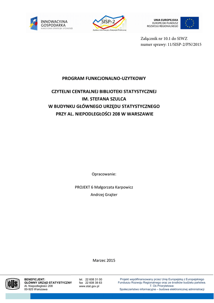 Załącznik nr 10.1 do SIWZ numer sprawy: 11/SISP-2/PN/2015 PROGRAM FUNKCJONALNO-UZYTKOWY CZYTELNI CENTRALNEJ BIBLIOTEKI STATYSTYCZNEJ IM. STEFANA SZULCA W BUDYNKU GŁÓWNEGO URZĘDU STATYSTYCZNEGO PRZY AL. NIEPODLEGŁOŚCI 208 W WARSZAWIE Opracowanie: PROJEKT 6 Małgorzata Karpowicz Andrzej Grajter Marzec 2015 BENEFICJENT: GŁÓWNY URZĄD STATYSTYCZNY Al. Niepodległości 208 00-925 Warszawa tel. 22 608 31 00 fax 22 608 38 63 www.stat.gov.pl Projekt współfinansowany przez Unię Europejską z Europejskiego Funduszu Rozwoju Regionalnego oraz ze środków budżetu państwa. 7. Oś Priorytetowa: Społeczeństwo informacyjne – budowa elektronicznej administracji PROGRAM FUNKCJONALNO - PRZESTRZENNY Zestawienie danych, niezbędnych do zaprojektowania sprawnie funkcjonującej, odpowiadającej potrzebom przyszłych użytkowników Czytelni Centralnej Biblioteki Statystycznej im. Stefana Szulca wraz z korytarzem i trzema (3) pokojami biurowymi przylegającymi do czytelni oraz łazienką dla osób niepełnosprawnych. Potrzebne pomieszczenia i przestrzenie Odpowiednie powierzchnie pomieszczeń i przestrzeni Wzajemne powiązania i zależności między pomieszczeniami i przestrzeniami Określenie rodzaju wykonywanych czynności i liczby osób je wykonujących Wyposażenie I. II. III. IV. V. Ad. I Potrzebne pomieszczenia i przestrzenie 1. Sala czytelniana a. powierzchnia do udostępniania książek b. powierzchnia do udostępniania map i wydawnictw wieloformatowych c. powierzchnia do udostępniania materiałów zdigitalizowanych d. powierzchnia do udostępniania czasopism papierowych do krótkiego korzystania oraz udostępniania czasopism elektronicznych e. przestrzeń centralna - stanowisko obsługi czytelni 2. 3. Korytarz Łazienka dla osób niepełnosprawnych Ad. II Odpowiednie powierzchnie pomieszczeń i przestrzeni 1. Sala czytelniana o powierzchni – około 230 m2, wysokości około 4,5, przeznaczona na księgozbiór, który liczy obecnie około 5000 wolumenów w tym 300 tys. czasopism naukowych: 1.1. księgozbiór w wolnym dostępie: ok. 150 wol./m2, wyeksponowany w jednostronnych, pięciopółkowych regałach przyściennych; rekomendowane rozwiązanie: 100% regały pięciopółkowe, 1.2. czasopisma w wolnym dostępie; rekomendowane rozwiązanie: regały jednostronne 50% i regały dwustronne 50%. a. powierzchnia do udostępniania książek - około 2 m2/czytelnika; rekomendowane rozwiązanie: 40 miejsc ze stolikami i siedziskami, razem około 80 m2, BENEFICJENT: GŁÓWNY URZĄD STATYSTYCZNY Al. Niepodległości 208 00-925 Warszawa tel. 22 608 31 00 fax 22 608 38 63 www.stat.gov.pl Projekt współfinansowany przez Unię Europejską z Europejskiego Funduszu Rozwoju Regionalnego oraz ze środków budżetu państwa. 7. Oś Priorytetowa: Społeczeństwo informacyjne – budowa elektronicznej administracji b. powierzchnia do udostępniania map i wydawnictw wieloformatowych około 2 m2/czytelnika; rekomendowane rozwiązanie: 2 stoły wielkopowierzchniowe, razem około 4 m2, c. powierzchnia do udostępniania materiałów zdigitalizowanych: około 2 m2/ czytelnika; rekomendowane rozwiązanie: 10 stanowisk komputerowych, razem około 20 m2, d. powierzchnia do pracy z czasopismami: dwa (2) stanowiska komputerowe do przeglądania czasopism w formie elektronicznej: około 1,5 – 3,0 m2/miejsce oraz powierzchnia do udostępniania czasopism papierowych do krótkiego korzystania około 1 m2/stanowisko, e. udostępniania czasopism elektronicznych: rekomendowane rozwiązanie: 2 stanowiska komputerowe, razem około 5 m2, f. stanowisko obsługi czytelni przez trzech (3) pracowników - około 4 m2/osobę, rozwiązanie: lada, 2 stanowiska komputerowe, 2 drukarki, razem około 12 m2, 2. Korytarz przed wejściem do Sali czytelnianej - ok 16,8 m2. 3. Łazienka dla osób niepełnosprawnych – ok 13 m2. Ad. III Wzajemne powiązania i zależności między pomieszczeniami i przestrzeniami 1. W czytelni należy zapewnić funkcjonowanie pięciu (5) przestrzeni niezależnych, otwartych, łatwo dostępnych, funkcjonalnych, efektywnie urządzonych. Wszystkie te przestrzenie winny być widoczne i dostępne z każdej strony czytelni, zarówno dla pracowników jak i użytkowników. Funkcje poszczególnych przestrzeni powinny wzajemnie się uzupełniać i współistnieć przy zachowaniu swoich zadaniowych odrębności. W pobliżu wejścia, należy zapewnić stanowisko dla trzech (3) pracowników, których zadaniem jest ułatwienie czytelnikom korzystanie z zasobów. Przestrzeń pracowników czytelni powinna być umieszczona centralnie, być widoczna i zapewniać pracownikom widoczność użytkowników wszystkich pozostałymi przestrzeniami czytelni: a. przestrzeń przeznaczona do pracy bezpośredniej, cichej z książkami - czterdzieści (40) stanowisk, gdzie będzie można korzystać z własnych laptopów lub pracować tylko z książką, przestrzeń ta jest powiązana ze wszystkimi pozostałymi przestrzeniami, powinna być łatwo dostępna z każdej strony czytelni, widoczna zarówno dla pracowników jak i użytkowników, stanowiska winny posiadać dostęp do prądu, umożliwiać podłączenie własnego laptopa, b. przestrzeń przeznaczona do pracy z mapami, atlasami i wydawnictwami wieloformatowymi, mieszcząca dwa (2) stanowiska wielkopowierzchniowe, przestrzeń łatwo dostępna z każdej strony czytelni, widoczna dla pracowników jak i użytkowników, BENEFICJENT: GŁÓWNY URZĄD STATYSTYCZNY Al. Niepodległości 208 00-925 Warszawa tel. 22 608 31 00 fax 22 608 38 63 www.stat.gov.pl Projekt współfinansowany przez Unię Europejską z Europejskiego Funduszu Rozwoju Regionalnego oraz ze środków budżetu państwa. 7. Oś Priorytetowa: Społeczeństwo informacyjne – budowa elektronicznej administracji c. przestrzeń przeznaczona do pracy z materiałami zdygitalizowanymi – dziesięć (10) stanowisk pracy z dostępem do usług on-line i zasobów statystyki publicznej; przestrzeń łatwo dostępna z każdej strony czytel