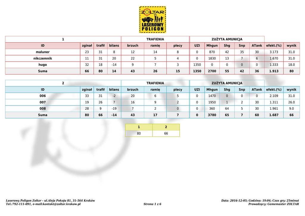 1 TRAFIENIA ZUŻYTA AMUNICJA ID zginał trafił bilans brzuch ramię plecy UZI Mhgun Shg Snp ATank efekt.(%) wynik maluner 23 31 8 12 14 8 0 870 42 35 30 3.173 31.0 nikczemnik 11 31 20 22 5 4 0 1830 13 7 6 1.670 31.0 hugo 32 18 -14 9 7 3 1350 0 0 0 0 1.333 18.0 Suma 66 80 14 43 26 15 1350 2700 55 42 36 1.913 80 2 TRAFIENIA ZUŻYTA AMUNICJA ID zginał trafił bilans brzuch ramię plecy UZI Mhgun Shg Snp ATank efekt.(%) wynik 006 33 31 -2 20 6 5 0 1470 0 0 0 2.109 31.0 007 19 26 7 16 9 2 0 1950 1 2 30 1.311 26.0 008 28 9 -19 7 2 0 0 360 64 5 30 1.961 9.0 Suma 80 66 -14 43 17 7 0 3780 65 7 60 1.687 66 Laserowy Poligon Zoltar - ul.Aleja Pokoju 81, 31-564 Kraków Tel.:792-111-091, e-mail:[email protected] 1 2 80 66 Strona 1 z 6 Data: 2016-12-05; Godzina: 19:04; Czas gry: 25minut Prowadzący: Gamemaster ZOLTAR 1 TRAFIENIA ZUŻYTA AMUNICJA ID zginał trafił bilans brzuch ramię plecy UZI D-D Mhgun Shg Snp hugo 51 46 -5 19 26 9 2730 1 0 0 0 0 1.684 46.0 nikczemnik 57 34 -23 27 4 3 0 0 2100 8 17 14 1.590 34.0 piotrek 70 18 -52 13 2 4 1920 7 0 0 0 0 0.934 18.0 mirek 41 14 -27 7 5 3 0 0 30 192 17 0 5.858 14.0 Suma 219 112 -107 66 37 19 4650 8 2130 200 34 14 1.592 112 2 TRAFIENIA ATank efekt.(%) wynik ZUŻYTA AMUNICJA ID zginał trafił bilans brzuch ramię plecy UZI D-D Mhgun Shg Snp maluner 24 89 65 69 17 11 4680 0 0 0 0 0 1.902 89.0 008 29 64 35 47 10 11 7530 2 0 0 0 0 0.850 64.0 jas fasola 32 35 3 26 6 3 0 0 1020 0 3 0 3.421 35.0 007 27 31 4 22 7 4 4140 21 0 0 0 0 0.745 31.0 Suma 112 219 107 164 40 29 16350 23 1020 0 3 0 1.259 219 Laserowy Poligon Zoltar - ul.Aleja Pokoju 81, 31-564 Kraków Tel.:792-111-091, e-mail:[email protected] 2 1 219 112 Strona 2 z 6 ATank efekt.(%) wynik Data: 2016-12-05; Godzina: 20:09; Czas gry: 25minut Prowadzący: Gamemaster ZOLTAR Drużyny Miejsce Nazwa Laserowy Poligon Zoltar - ul.Aleja Pokoju 81, 31-564 Kraków Tel.:792-111-091, e-mail:[email protected] Rozgrywki 1 2 Suma 2 66 219 285 1 80 112 192 Strona 3 z 6 Data: 2016-12-05 Prowadzący: Gamemaster ZOLTAR Zestawienie wg wyniku Miejsce TRAFIENIA ZUŻYTA AMUNICJA ID zginał trafił bilans brzuch ramię plecy UZI D-D Mhgun Shg Snp aTank efekt.(%) wynik maluner 56.40 144.00 87.60 97.20 37.20 22.80 5616.00 0.00 1044.00 50.40 42.00 36.00 2.121 144.00 008 68.40 87.60 19.20 64.80 14.40 13.20 9036.00 2.40 432.00 76.80 6.00 36.00 0.914 87.60 jas fasola 76.80 84.00 7.20 62.40 14.40 7.20 0.00 0.00 2448.00 0.00 7.20 0.00 3.421 84.00 4 nikczemnik 81.60 78.00 -3.60 58.80 10.80 8.40 0.00 0.00 4716.00 25.20 28.80 24.00 1.627 78.00 5 hugo 99.60 76.80 -22.80 33.60 39.60 14.40 4896.00 1.20 0.00 0.00 0.00 0.00 1.568 76.80 6 006 79.20 74.40 -4.80 48.00 14.40 12.00 0.00 0.00 3528.00 0.00 0.00 0.00 2.109 74.40 7 007 55.20 68.40 13.20 45.60 19.20 7.20 4968.00 25.20 2340.00 1.20 2.40 36.00 0.928 68.40 8 piotrek 168.00 43.20 -124.80 31.20 4.80 9.60 4608.00 16.80 0.00 0.00 0.00 0.00 0.934 43.20 9 mirek 98.40 33.60 -64.80 16.80 12.00 7.20 0.00 0.00 72.00 460.80 40.80 0.00 5.858 33.60 Laserowy Poligon Zoltar - ul.Aleja Pokoju 81, 31-564 Kraków Tel.:792-111-091, e-mail:[email protected] Strona 4 z 6 Data: 2016-12-05 Prowadzący: Gamemaster ZOLTAR Zestawienie wg bilansu Miejsce TRAFIENIA ZUŻYTA AMUNICJA ID zginał trafił bilans brzuch ramię plecy UZI D-D Mhgun Shg Snp aTank efekt.(%) wynik maluner 56.40 144.00 87.60 97.20 37.20 22.80 5616.00 0.00 1044.00 50.40 42.00 36.00 2.121 144.00 008 68.40 87.60 19.20 64.80 14.40 13.20 9036.00 2.40 432.00 76.80 6.00 36.00 0.914 87.60 007 55.20 68.40 13.20 45.60 19.20 7.20 4968.00 25.20 2340.00 1.20 2.40 36.00 0.928 68.40 4 jas fasola 76.80 84.00 7.20 62.40 14.40 7.20 0.00 0.00 2448.00 0.00 7.20 0.00 3.421 84.00 5 nikczemnik 81.60 78.00 -3.60 58.80 10.80 8.40 0.00 0.00 4716.00 25.20 28.80 24.00 1.627 78.00 6 006 79.20 74.40 -4.80 48.00 14.40 12.00 0.00 0.00 3528.00 0.00 0.00 0.00 2.109 74.40 7 hugo 99.60 76.80 -22.80 33.60 39.60 14.40 4896.00 1.20 0.00 0.00 0.00 0.00 1.568 76.80 8 mirek 98.40 33.60 -64.80 16.80 12.00 7.20 0.00 0.00 72.00 460.80 40.80 0.00 5.858 33.60 9 piotrek 168.00 43.20 -124.80 31.20 4.80 9.60 4608.00 16.80 0.00 0.00 0.00 0.00 0.934 43.20 Laserowy Poligon Zoltar - ul.Aleja Pokoju 81, 31-564 Kraków Tel.:792-111-091, e-mail:[email protected] Strona 5 z 6 Data: 2016-12-05 Prowadzący: Gamemaster ZOLTAR Zestawienie wg efektywności Miejsce TRAFIENIA ZUŻYTA AMUNICJA ID zginał trafił bilans brzuch ramię plecy UZI D-D Mhgun Shg Snp aTank efekt.(%) wynik mirek 98.40 33.60 -64.80 16.80 12.00 7.20 0.00 0.00 72.00 460.80 40.80 0.00 5.858 33.60 jas fasola 76.80 84.00 7.20 62.40 14.40 7.20 0.00 0.00 2448.00 0.00 7.20 0.00 3.421 84.00 maluner 56.40 144.00 87.60 97.20 37.20 22.80 5616.00 0.00 1044.00 50.40 42.00 36.00 2.121 144.00 4 006 79.20 74.40 -4.80 48.00 14.40 12.00 0.00 0.00 3528.00 0.00 0.00 0.00 2.109 74.40 5 nikczemnik 81.60 78.00 -3.60 58.80 10.80 8.40 0.00 0.00 4716.00 25.20 28.80 24.00 1.627 78.00 6 hugo 99.60 76.80 -22.80 33.60 39.60 14.40 4896.00 1.20 0.00 0.00 0.00 0.00 1.568 76.80 7 piotrek 168.00 43.20 -124.80 31.20 4.80 9.60 4608.00 16.80 0.00 0.00 0.00 0.00 0.934 43.20 8 007 55.20 68.40 13.20 45.60 19.20 7.20 4968.00 25.20 2340.00 1.20 2.40 36.00 0.928 68.40 9 008 68.40 87.60 19.20 64.80 14.40 13.20 9036.00 2.40 432.00 76.80 6.00 36.00 0.914 87.60 Laserowy Poligon Zoltar - ul.Aleja Pokoju 81, 31-564 Kraków Tel.:792-111-091, e-mail:[email protected] Strona 6 z 6 Data: 2016-12-05 Prowadzący: Gamemaster ZOLTAR