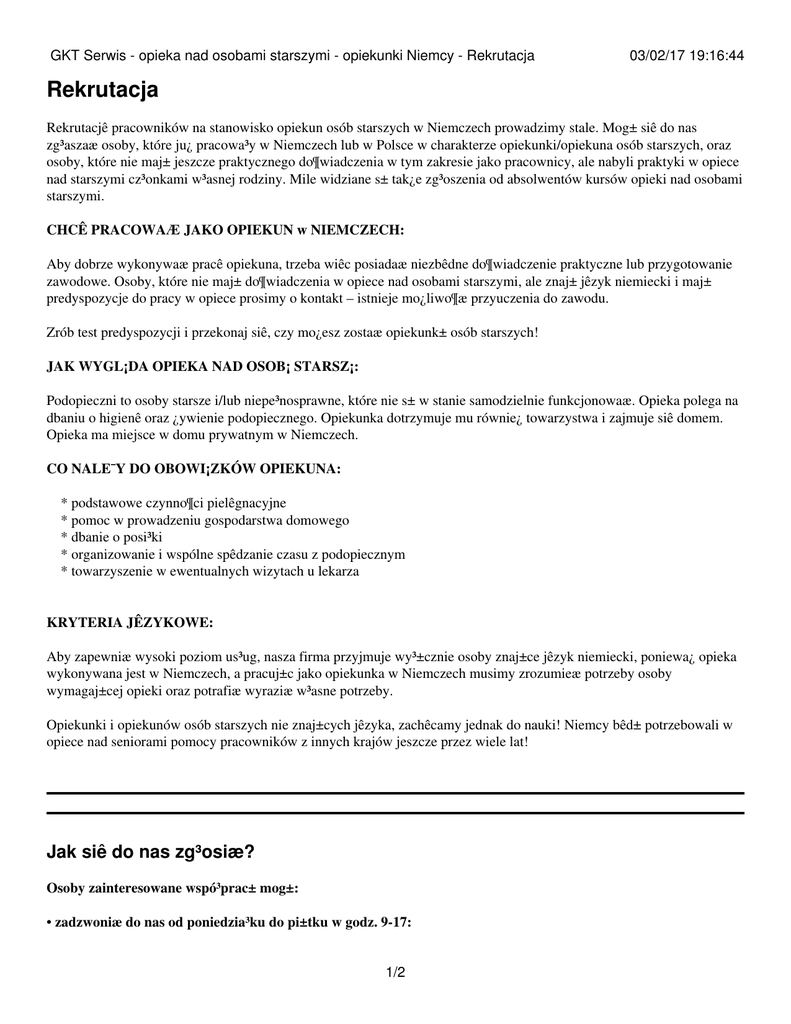 GKT Serwis - opieka nad osobami starszymi - opiekunki Niemcy - Rekrutacja 03/02/17 19:16:44 Rekrutacja Rekrutacjê pracowników na stanowisko opiekun osób starszych w Niemczech prowadzimy stale. Mog± siê do nas zg³aszaæ osoby, które ju¿ pracowa³y w Niemczech lub w Polsce w charakterze opiekunki/opiekuna osób starszych, oraz osoby, które nie maj± jeszcze praktycznego do¶wiadczenia w tym zakresie jako pracownicy, ale nabyli praktyki w opiece nad starszymi cz³onkami w³asnej rodziny. Mile widziane s± tak¿e zg³oszenia od absolwentów kursów opieki nad osobami starszymi. CHCÊ PRACOWAÆ JAKO OPIEKUN w NIEMCZECH: Aby dobrze wykonywaæ pracê opiekuna, trzeba wiêc posiadaæ niezbêdne do¶wiadczenie praktyczne lub przygotowanie zawodowe. Osoby, które nie maj± do¶wiadczenia w opiece nad osobami starszymi, ale znaj± jêzyk niemiecki i maj± predyspozycje do pracy w opiece prosimy o kontakt – istnieje mo¿liwo¶æ przyuczenia do zawodu. Zrób test predyspozycji i przekonaj siê, czy mo¿esz zostaæ opiekunk± osób starszych! JAK WYGL¡DA OPIEKA NAD OSOB¡ STARSZ¡: Podopieczni to osoby starsze i/lub niepe³nosprawne, które nie s± w stanie samodzielnie funkcjonowaæ. Opieka polega na dbaniu o higienê oraz ¿ywienie podopiecznego. Opiekunka dotrzymuje mu równie¿ towarzystwa i zajmuje siê domem. Opieka ma miejsce w domu prywatnym w Niemczech. CO NALE¯Y DO OBOWI¡ZKÓW OPIEKUNA: * podstawowe czynno¶ci pielêgnacyjne * pomoc w prowadzeniu gospodarstwa domowego * dbanie o posi³ki * organizowanie i wspólne spêdzanie czasu z podopiecznym * towarzyszenie w ewentualnych wizytach u lekarza KRYTERIA JÊZYKOWE: Aby zapewniæ wysoki poziom us³ug, nasza firma przyjmuje wy³±cznie osoby znaj±ce jêzyk niemiecki, poniewa¿ opieka wykonywana jest w Niemczech, a pracuj±c jako opiekunka w Niemczech musimy zrozumieæ potrzeby osoby wymagaj±cej opieki oraz potrafiæ wyraziæ w³asne potrzeby. Opiekunki i opiekunów osób starszych nie znaj±cych jêzyka, zachêcamy jednak do nauki! Niemcy bêd± potrzebowali w opiece nad seniorami pomocy pracowników z innych krajów jeszcze przez wiele lat! Jak siê do nas zg³osiæ? Osoby zainteresowane wspó³prac± mog±: • zadzwoniæ do nas od poniedzia³ku do pi±tku w godz. 9-17: 1/2 GKT Serwis - opieka nad osobami starszymi - opiekunki Niemcy - Rekrutacja tel. Biuro Poznañ tel. Biuro Gliwice 03/02/17 19:16:44 61 662 10 81 lub 61 662 10 82 32 777 74 51 lub 32 777 74 52 • skontaktowaæ siê przez pocztê elektroniczn± JavaScript w przegl±darce, by go zobaczyæ Ten adres email jest ukrywany przed spamerami, w³±cz obs³ugê lub wype³niæ kwestionariusz i odes³aæ faksem na numer 061 661 05 74 lub mailem na adres: ukrywany przed spamerami, w³±cz obs³ugê JavaScript w przegl±darce, by go zobaczyæ . Ten adres email jest Kwestionariusz do pobrania do wydruku i rêcznego wype³niania: Kwestionariusz_do_druku Kwestionariusz do pobrania do wype³niania na komputerze: Kwestionariusz_na_komputerze Po otrzymaniu kwestionariusza kontaktujemy siê z kandydatem i weryfikujemy znajomo¶æ jêzyka niemieckiego. Gdy jest ona wystarczaj±ca mo¿emy stworzyæ profil kandydata w naszej bazie rekrutacyjnej. Dane przechowujemy przez rok i w tym czasie mo¿emy siê zwróciæ do kandydata z propozycj± zatrudnienia. 2/2