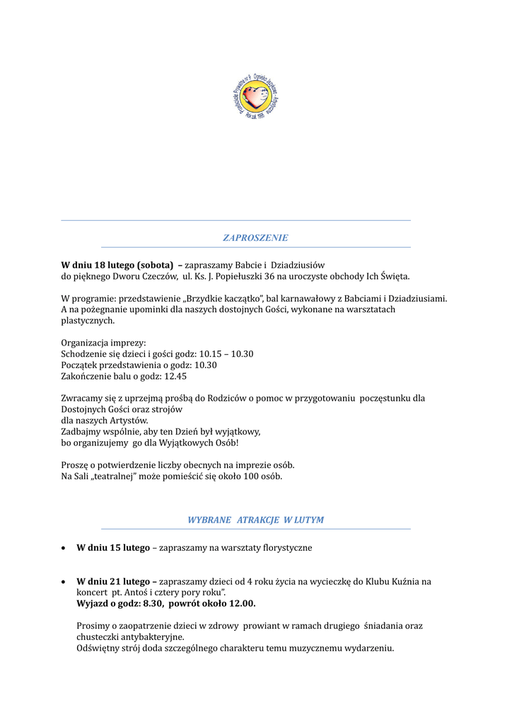 ZAPROSZENIE W dniu 18 lutego (sobota) – zapraszamy Babcie i Dziadziusiów do pięknego Dworu Czeczów, ul. Ks. J. Popiełuszki 36 na uroczyste obchody Ich Święta. W programie: przedstawienie „Brzydkie kaczątko”, bal karnawałowy z Babciami i Dziadziusiami. A na pożegnanie upominki dla naszych dostojnych Gości, wykonane na warsztatach plastycznych. Organizacja imprezy: Schodzenie się dzieci i gości godz: 10.15 – 10.30 Początek przedstawienia o godz: 10.30 Zakończenie balu o godz: 12.45 Zwracamy się z uprzejmą prośbą do Rodziców o pomoc w przygotowaniu poczęstunku dla Dostojnych Gości oraz strojów dla naszych Artystów. Zadbajmy wspólnie, aby ten Dzień był wyjątkowy, bo organizujemy go dla Wyjątkowych Osób! Proszę o potwierdzenie liczby obecnych na imprezie osób. Na Sali „teatralnej” może pomieścić się około 100 osób. WYBRANE ATRAKCJE W LUTYM W dniu 15 lutego – zapraszamy na warsztaty florystyczne W dniu 21 lutego – zapraszamy dzieci od 4 roku życia na wycieczkę do Klubu Kuźnia na koncert pt. Antoś i cztery pory roku”. Wyjazd o godz: 8.30, powrót około 12.00. Prosimy o zaopatrzenie dzieci w zdrowy prowiant w ramach drugiego śniadania oraz chusteczki antybakteryjne. Odświętny strój doda szczególnego charakteru temu muzycznemu wydarzeniu. W dniu 28 lutego – zapraszamy dzieci od 4 roku życia na wycieczkę do Teatru Groteska na spektakl pt. Brzydkie kaczątko”. Wyjazd o godz:10.00, powrót około godz: 13.30 Prosimy o zaopatrzenie dzieci w dodatkowy prowiant, chusteczki antybakteryjne. Natomiast II śniadanie zostanie podane w przedszkolu tuż przed wyjazdem. Małych odbiorców sztuki obowiązuje strój odświętny. W dniu 16 lutego zapraszamy dzielnych pływaków na basen. RODZICE - DZIECIOM Święto Rodziny dopiero za cztery miesiące. Mamy więc dużo czasu na wspólne przygotowania. Zapraszamy Rodziców do wspólnej zabawy w teatrzyk. Rodzice będą mogli zaprezentować swoje zdolności artystyczne przed dziecięcą publicznością. Warto zobaczyć radość i dumę swojego dziecka. Szczegóły już wkrótce u wychowawczyń poszczególnych grup. Czekamy na odważnych i kreatywnych Rodziców. PODSUMOWANIE OSIĄGNIĘĆ DZIECI Wychowawczyni Pani mgr Iwona Gajek zaprasza serdecznie Rodziców „Krasnali” w dniu 27 lutego na spotkanie grupowe, godz: 17.00. Wychowawczyni Pani mgr Małgorzata Sójka prowadzi konsultacje indywidualne z Rodzicami „Żyrafek”. Wszystkich zainteresowanych indywidualne z logopedą i psychologiem. Rodziców zapraszamy na konsultacje Termin wizyty do logopedy, czy psychologa należy wcześniej uzgodnić z p. dyrektor.