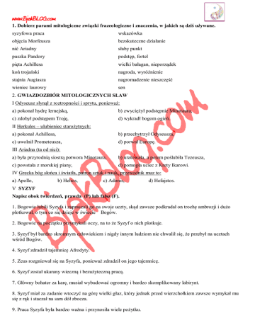 www.BjakBLOG.com 1. Dobierz parami mitologiczne związki frazeologiczne i znaczenia, w jakich są dziś używane. syzyfowa praca wskazówka objęcia Morfeusza bezskuteczne działanie nić Ariadny słaby punkt puszka Pandory podstęp, fortel pięta Achillesa wielki bałagan, nieporządek koń trojański nagroda, wyróżnienie stajnia Augiasza nagromadzenie nieszczęść wieniec laurowy sen 2. GWIAZDOZBIÓR MITOLOGICZNYCH SŁAW I Odyseusz słynął z roztropności i sprytu, ponieważ: a) pokonał hydrę lernejską, b) zwyciężył podstępnie Minotaura, c) zdobył podstępem Troję, d) wykradł bogom ogień. II Herkules – ulubieniec starożytnych: a) pokonał Achillesa, b) przechytrzył Odyseusza, c) uwolnił Prometeusza, d) porwał Europę. III Ariadna (ta od nici): a) była przyrodnią siostrą potwora Minotaura, b) uratowała, a potem poślubiła Tezeusza, c) powstała z morskiej piany, d) pomogła uciec z Krety Ikarowi. IV Grecka bóg słońca i światła, patron sztuk i nauk, przewodnik muz to: a) Apollo, b) Helios, c) Adonis, d) Hefajstos. V SYZYF Napisz obok twierdzeń, prawda (P) lub fałsz (F). 1. Bogowie lubili Syzyfa i zapraszali go na swoje uczty, skąd zawsze podkradał on trochę ambrozji i dużo plotkował, o tym co się dzieje w świecie Bogów. 2. Bogowie na początku przymykali oczy, na to że Syzyf o nich plotkuje. 3. Syzyf był bardzo skromnym człowiekiem i nigdy innym ludziom nie chwalił się, że przebył na ucztach wśród Bogów. 4. Syzyf zdradził tajemnicę Afrodyty. 5. Zeus rozgniewał się na Syzyfa, ponieważ zdradził on jego tajemnicę. 6. Syzyf został ukarany wieczną i bezużyteczną pracą. 7. Główny bohater za karę, musiał wybudować ogromny i bardzo skomplikowany labirynt. 8. Syzyf miał za zadanie wtoczyć na górę wielki głaz, który jednak przed wierzchołkiem zawsze wymykał mu się z rąk i staczał na sam dół zbocza. 9. Praca Syzyfa była bardzo ważna i przynosiła wiele pożytku.
