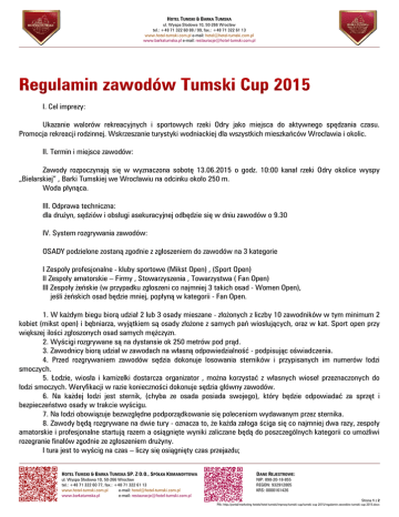 HOTEL TUMSKI & BARKA TUMSKA ul. Wyspa Słodowa 10, 50-266 Wrocław tel.: +48 71 322 60 88 / 99, fax.: +48 71 322 61 13 www.hotel-tumski.com.pl e-mail: [email protected] www.barkatumska.pl e-mail: [email protected] I. Cel imprezy: Ukazanie walorów rekreacyjnych i sportowych rzeki Odry jako miejsca do aktywnego spędzania czasu. Promocja rekreacji rodzinnej. Wskrzeszanie turystyki wodniackiej dla wszystkich mieszkańców Wrocławia i okolic. II. Termin i miejsce zawodów: Zawody rozpoczynają się w wyznaczona sobotę 13.06.2015 o godz. 10:00 kanał rzeki Odry okolice wyspy „Bielarskiej” , Barki Tumskiej we Wrocławiu na odcinku około 250 m. Woda płynąca. III. Odprawa techniczna: dla drużyn, sędziów i obsługi asekuracyjnej odbędzie się w dniu zawodów o 9.30 IV. System rozgrywania zawodów: OSADY podzielone zostaną zgodnie z zgłoszeniem do zawodów na 3 kategorie I Zespoły profesjonalne - kluby sportowe (Mikst Open) , (Sport Open) II Zespoły amatorskie – Firmy , Stowarzyszenia , Towarzystwa ( Fan Open) III Zespoły żeńskie (w przypadku zgłoszeni co najmniej 3 takich osad - Women Open), jeśli żeńskich osad będzie mniej, popłyną w kategorii - Fan Open. 1. W każdym biegu biorą udział 2 lub 3 osady mieszane - złożonych z liczby 10 zawodników w tym minimum 2 kobiet (mikst open) i bębniarza, wyjątkiem są osady złożone z samych pań wiosłujących, oraz w kat. Sport open przy większej ilości zgłoszonych osad samych mężczyzn. 2. Wyścigi rozgrywane są na dystansie ok 250 metrów pod prąd. 3. Zawodnicy biorą udział w zawodach na własną odpowiedzialność - podpisując oświadczenia. 4. Przed rozgrywaniem zawodów sędzia dokonuje losowania sterników i przypisanych im numerów łodzi smoczych. 5. Łodzie, wiosła i kamizelki dostarcza organizator , można korzystać z własnych wioseł przeznaczonych do łodzi smoczych. Weryfikacji w razie konieczności dokonuje sędzia główny zawodów. 6. Na każdej łodzi jest sternik, (chyba ze osada posiada swojego), który będzie odpowiadać za sprzęt i bezpieczeństwo osady w trakcie wyścigu. 7. Na łodzi obowiązuje bezwzględne podporządkowanie się poleceniom wydawanym przez sternika. 8. Zawody będą rozgrywane na dwie tury - oznacza to, że każda załoga ściga się co najmniej dwa razy, zespoły amatorskie i profesjonalne startują razem a osiągnięte wyniki zaliczane będą do poszczególnych kategorii co umożliwi rozegranie finałów zgodnie ze zgłoszeniem drużyny. I tura jest to wyścig na czas – liczy się osiągnięty czas przejazdu; HOTEL TUMSKI & BARKA TUMSKA SP. Z O.O., SPÓŁKA KOMANDYTOWA DANE REJESTROWE: ul. Wyspa Słodowa 10, 50-266 Wrocław tel.: +48 71 322 60 77, fax.: +48 71 322 61 13 www.hotel-tumski.com.pl e-mail: [email protected] www.barkatumska.pl e-mail: [email protected] NIP: 898-20-18-855 REGON: 932912805 KRS: 0000161426 Strona 1 z 2 Plik: http://portal/marketing hotele/hotel tumski/imprezy/tumski cup/tumski cup 2015/regulamin zawodów tumski cup 2015.docx HOTEL TUMSKI & BARKA TUMSKA ul. Wyspa Słodowa 10, 50-266 Wrocław tel.: +48 71 322 60 88 / 99, fax.: +48 71 322 61 13 www.hotel-tumski.com.pl e-mail: [email protected] www.barkatumska.pl e-mail: [email protected] II tura – w zależności od osiągniętych czasów pierwszej tury osady ścigają się parami o finałowe lokaty w ogólnej klasyfikacji. 9. W przypadku małej ilości osad zawody rozegrane zostaną na zasadach „ każdy z każdym”. Punktowanie biegów wygrana załoga 2 pkt, przegrana załoga 1 pkt i walkower 0 pkt. 10. W przypadku biegów na czas finał zostanie rozegrany z udziałem 2 lub 3 drużyn, które uzyskają najlepsze czasy w pierwszej turze przejazdu. 11. Przy małej ilości drużyn sportowych organizator zawodów ma możliwość zmiany regulaminu zawodów w taki sposób aby zwiększyć zainteresowanie tą rywalizacją. ( np. przez wprowadzenie dodatkowych biegów półfinałowych). 12. Każda osada musi dopłynąć w okolice startu najpóźniej na 2 minuty przed startem biegu, a następnie ustawić łodzie na linii startowej. 13. Osady muszą stosować się do komend wydawanych przez sędziego startowego. 14. Start do biegu sygnalizowany jest przez sędziego startera sygnałem dźwiękowym lub flagą. Komenda startowa to: Ready, Set, Go, z jednoczesnym wystrzałem z pistoletu startowego lub opuszczeniem flagi startowej w dół. 15. Ruch wiosłem przed komendą startową powoduje falstart podwójny falstart powoduje eliminacje załogi z dalszego udziału w biegu. 16. Przekroczenie linii mety przez numer startowy znajdujący się na lodzi oznacza koniec wyścigu dla tej osady. 17. Warunkiem zaliczenia wyścigu jest przepłynięcie dystansu przez wszystkich zawodników. 18. W przypadku startów każdy z każdym suma punktów zdobytych w poszczególnych biegach pozwoli ustalić pary finałowe i ostateczny wynik zawodów. V. Postanowienia końcowe: 1. Ogłoszenie wyników nastąpi po zakończeniu zawodów. 2. Organizator zawodów podejmuje ostateczne decyzje w sprawach: interpretacji regulaminu, protestów i innych, nie objętych tym regulaminem spraw. 3. Decyzje Organizatorów są ostateczne i niepodważalne. 4. Pozostałe sprawy nie ujęte w regulaminie ustala Organizator. VI. Komisję Sędziów: Licencjonowanych sędziów kajakarstwa - powołuje Organizator. HOTEL TUMSKI & BARKA TUMSKA SP. Z O.O., SPÓŁKA KOMANDYTOWA DANE REJESTROWE: ul. Wyspa Słodowa 10, 50-266 Wrocław tel.: +48 71 322 60 77, fax.: +48 71 322 61 13 www.hotel-tumski.com.pl e-mail: [email protected] www.barkatumska.pl e-mail: [email protected] NIP: 898-20-18-855 REGON: 932912805 KRS: 0000161426 Strona 2 z 2 Plik: http://portal/marketing hotele/hotel tumski/imprezy/tumski cup/tumski cup 2015/regulamin zawodów tumski cup 2015.docx