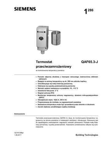 1 286 Termostat przeciwzamrożeniowy QAF65.3-J do kontrolowania temperatury powietrza Posiada odporną obudowę z tworzywa sztucznego (wzmocnioną włóknem szklanym) Reaguje na zmiany temperatury na ok. 300 mm odcinku kapilary Charakteryzuje się małą histerezą pomiarową Odznacza się wysoką powtarzalnością pomiarów Wartość zadana nastawiana w przedziale -10...+15 °C Ustawienie fabryczne: 5 °C Stopień ochrony IP43 Monitoruje temperaturę ochrony nagrzewnicy, działanie mikroprzełącznikiem (SPDT) Obciążalność styku: 16(4) A, 250 V AC Przystosowany do montażu na nagrzewnicach powietrza Nastawiona temperatura może być sprawdzona przez okienko w obudowie Zaciski wtykowe umożliwiające szybką instalację Zastosowanie Termostat przeciwzamrożeniowy QAF65.3-J służy do monitorowania temperatury nagrzewnicy po stronie powietrza w instalacjach wentylacji i klimatyzacji. Stosowany jest do zapobiegania uszkodzeniom nagrzewnic wskutek zamarzania. Posiada małą histerezę pomiarową i wysoką powtarzalność. Kasowanie (zresetowanie) odbywa się automatycznie. CE1N1286pl 1.06.2011 Building Technologies Typowe aplikacje Przełącznik termostatu może zainicjować służące ochronie nagrzewnicy funkcje: – – – – – – Zatrzymanie wentylatora Zamknięcie przepustnic powietrza zewnętrznego Całkowite otwarcie zaworu nagrzewnicy Uruchomienie pompy nagrzewnicy Wyłączenie agregatu chłodniczego (sprężarki) i nawilżacza powietrza Włączenie alarmu optycznego i/lub akustycznego Działanie Przełącznik (SPDT) Kiedy temperatura powietrza spadnie osiągając poziom ochrony przeciwzamrożeniowej, termostat QAF65.3-J uruchomi przełącznik (styk 1–3 zostanie zamknięty, styk 1–2 otwarty). Gdy temperatura wzrośnie powyżej poziomu ochrony przeciwzamrożeniowej o wartość strefy nieczułości (histereza) przełącznik wróci do pierwotnego ustawienia (styk 1–3 zostanie otwarty, styk 1–2 zwarty). Zestawienie Oznaczenie typu Stopień ochrony Zakres nastaw Długość kapilary QAF65.3-J IP43 -10...+15 °C 3 000 mm Wyposażenie dodatkowe Zakres dostawy Termostat Dławik kablowy M16 x 1.5 mm Instrukcja montażu Poniższe akcesoria należy zamawiać oddzielnie: Oznaczenie typu Opis AQM63.0 Kołnierz montażowy AQM63.2 Zaczepy montażowe kapilary (tworzywo sztuczne; 3 sztuki) i metalowe uchwyty (3 sztuki) Zaczepy montażowe kapilary (tworzywo sztuczne; 6 sztuk) Zaczepy montażowe kapilary (stal galwanizowana; 6 sztuk) AQM63.3 FK-TZ1 AQM63.0 AQM63.3 FK-TZ1 Zasada działania Termostat QAF65.3-J zareaguje, gdy temperatura powietrza spadnie poniżej poziomu ochrony przeciwzamrożeniowej na długości kapilary co najmniej 300 mm. Kasowanie odbywa się automatycznie, gdy temperatura wzrośnie powyżej poziomu ochrony przeciwzamrożeniowej. Element pomiarowy, w postaci kapilary oraz wypełnionej gazem membrany, jest mechanicznie połączony z mikroprzełącznikiem. Temperatura mierzona jest na całej długości kapilary. 2/6 Siemens Building Technologies Termostat przeciwzamrożeniowy QAF65.3-J CE1N1286pl 1.06.2011 Budowa Termostat mechaniczny z elementem pomiarowym w postaci kapilary przeznaczony do montażu w kanale powietrznym dla ochrony nagrzewnicy powietrza. Obudowa termostatu wykonana jest z tworzywa sztucznego PC (poliwęglan) wzmocnionego włóknem szklanym. W pokrywie umieszczone jest okienko pozwalające na sprawdzenie nastawionej temperatury. Tworzywo sztuczne PC obudowy termostatu wykazuje wysoką niepalność i trwałość, jest szczególnie odporne na promieniowanie ultrafioletowe, wytrzymałe na wysokie temperatury oraz działanie czynników chemicznych, mechanicznych i biologicznych, wodoodporne. Wraz z termostatem dostarczany jest dławik kablowy M16 x 1.5 mm. Wskazówki do montażu Pomoc przy montażu Instrukcja montażu dołączana jest do opakowania. Miejsce montażu Należy zapewnić wystarczającą ilość miejsca nad termostatem, by umożliwić odczyt nastawy przez okienko kontrolne w obudowie, a także by możliwa była zmiana nastawy temperatury, ewentualna wymiana lub naprawa termostatu. Termostat Temperatura otoczenia obudowy termostatu (z pętlą testową) musi być wyższa od nastawionej wartości temperatury ochrony o co najmniej 2 °C. Jeśli takie warunki nie mogą być zapewnione (np. na zewnątrz budynku lub w pomieszczeniach nieogrzewanych) to obudowa i pętla testowa muszą być zainstalowane wewnątrz urządzenia nawiewnego. Kapilara Kapilara termostatu musi być montowana za nagrzewnicą (lub przed chłodnicą) w poprzek strumienia powietrza. Powinna być układana ukośnie względem orurowania wymiennika ciepła, w odległości około 50 – 100 mm, równomiernie pokrywając cały przekrój. Do celów testowych, zaleca się utworzenie pętli o długości ok. 200 mm i pozostawienie jej na zewnątrz kanału powietrza bezpośrednio pod obudową termostatu. Aby zapobiec uszkodzeniu kapilary promień jej zgięcia nie może być mniejszy niż 20 mm. Stosowanie zaczepów montażowych kapilary (AQM63.2 lub AQM63.3 – wyposażenie dodatkowe) znacznie upraszcza montaż. Wskazówki do projektowania Zaleca się instalowanie termostatów QAF65.3-J na wysuwanych blokach nagrzewnicy, bezpośrednio w strumieniu powietrza za nagrzewnicą. Przewód podłączeniowy musi być odpowiednio długi, aby blok można było bez przeszkód wkładać i wyjmować. W przypadku nagrzewnic o bardzo dużym polu przekroju, można zainstalować kilka termostatów i połączyć je szeregowo. W takim przypadku, wartość zadana musi być nastawiona w każdym z termostatów. 3/6 Siemens Building Technologies Termostat przeciwzamrożeniowy QAF65.3-J CE1N1286pl 1.06.2011 Wskazówki do uruchomienia Wartość zadaną temperatury można nastawić, za pomocą np. wkrętaka, po zdjęciu przedniej pokrywy termostatu. Symulacja zamarzania Wskazówki do obsługi W celu symulacji stanu zamarzania należy zanurzyć pętlę testową kapilary w naczyniu . wypełnionym wodą z lodem. . . .